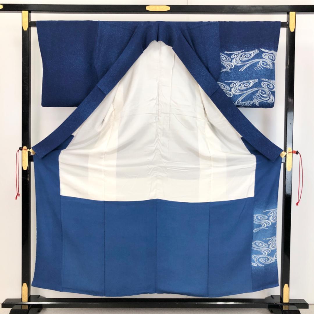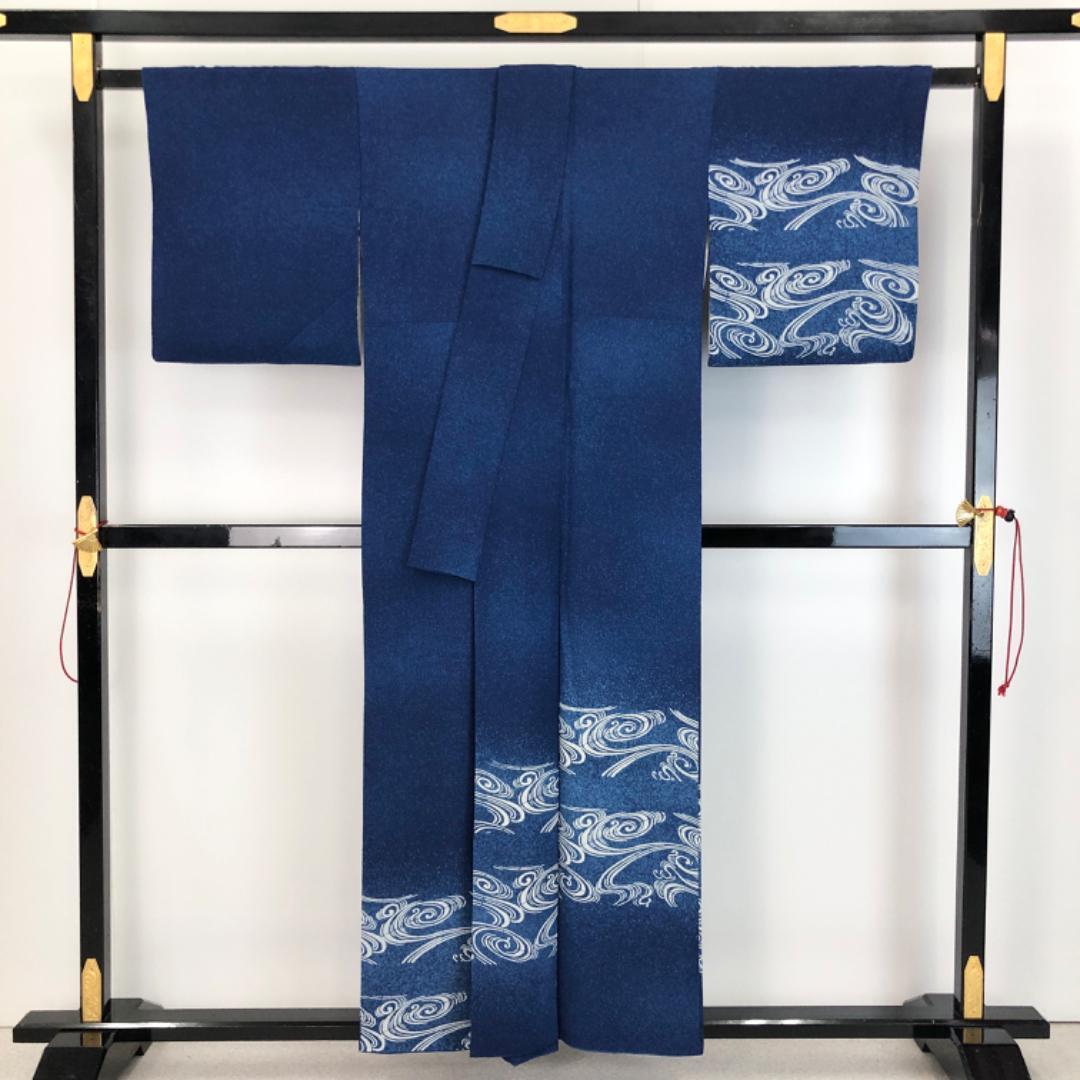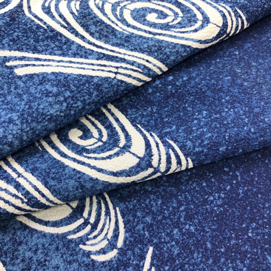 藍染の奮起の良いお色味の縮緬地に叩き染に流水模様がデザインされたお品でございます。