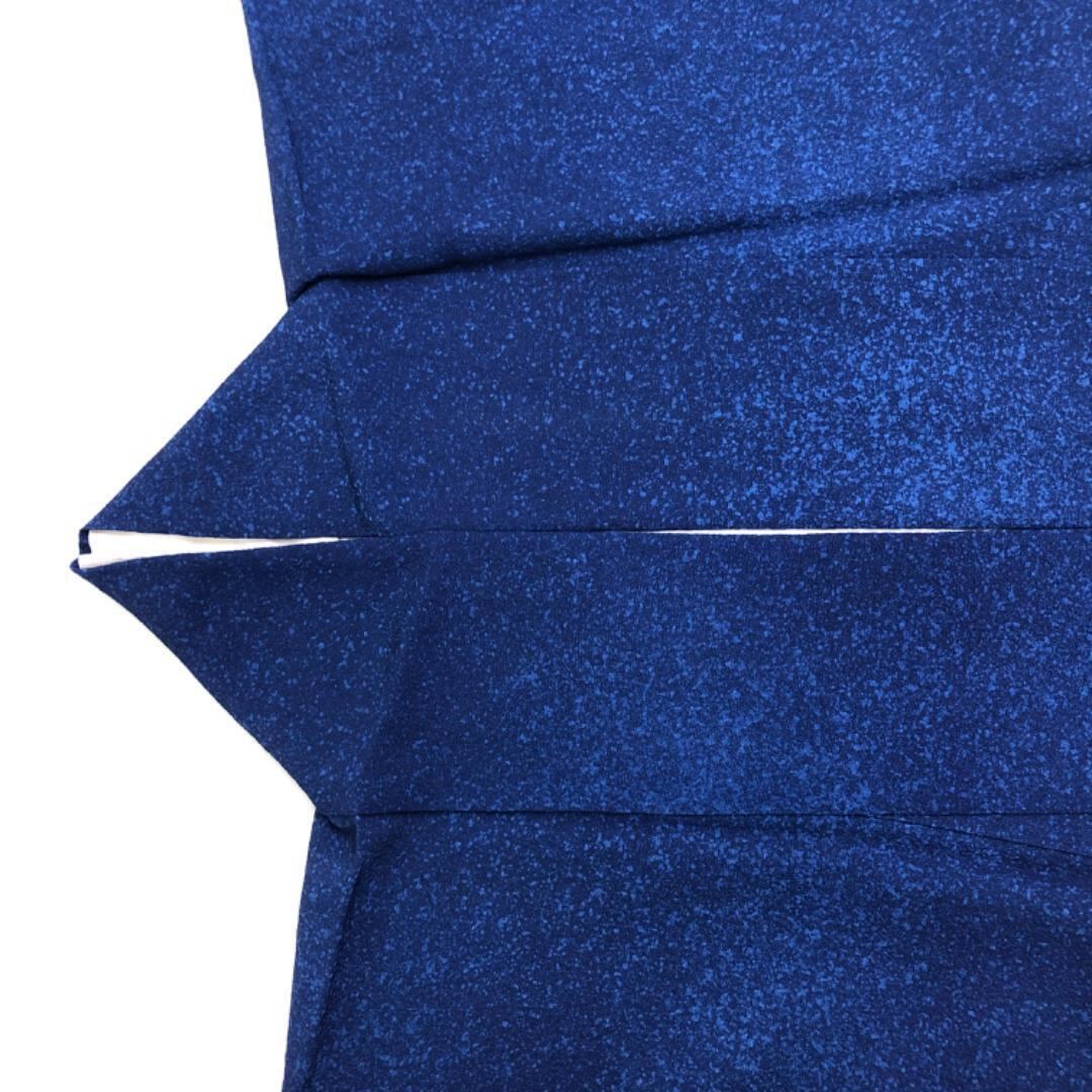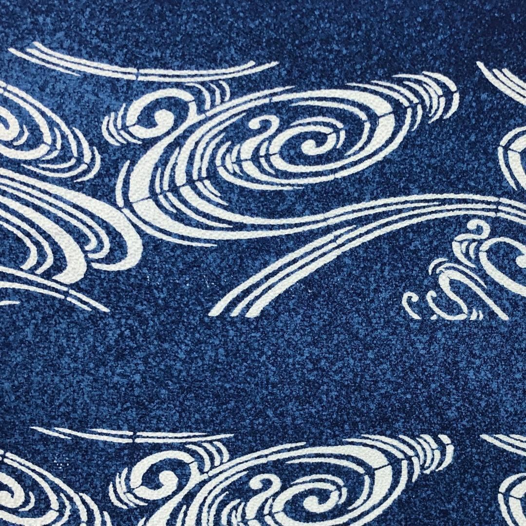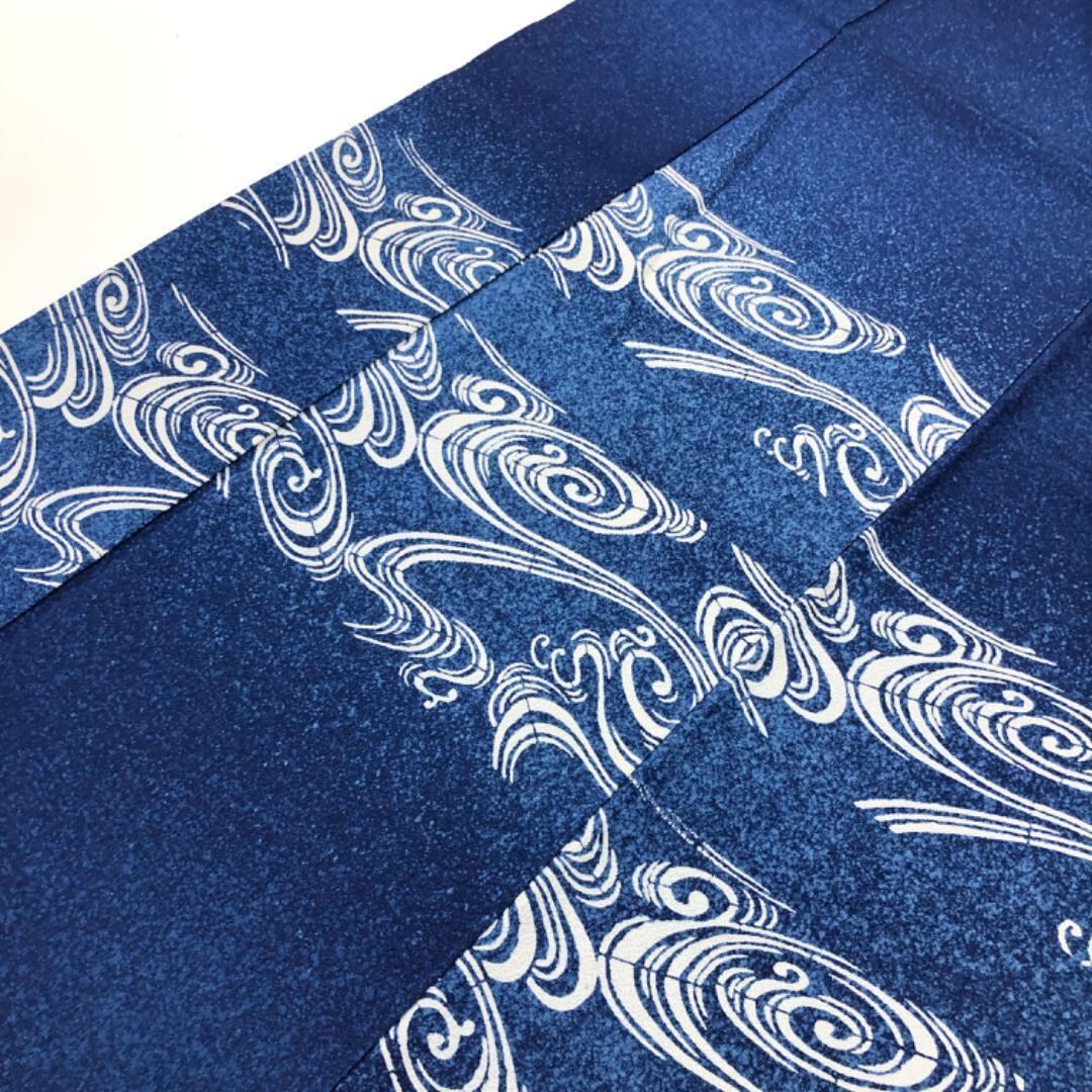 藍染の奮起の良いお色味の縮緬地に叩き染に流水模様がデザインされたお品でございます。
