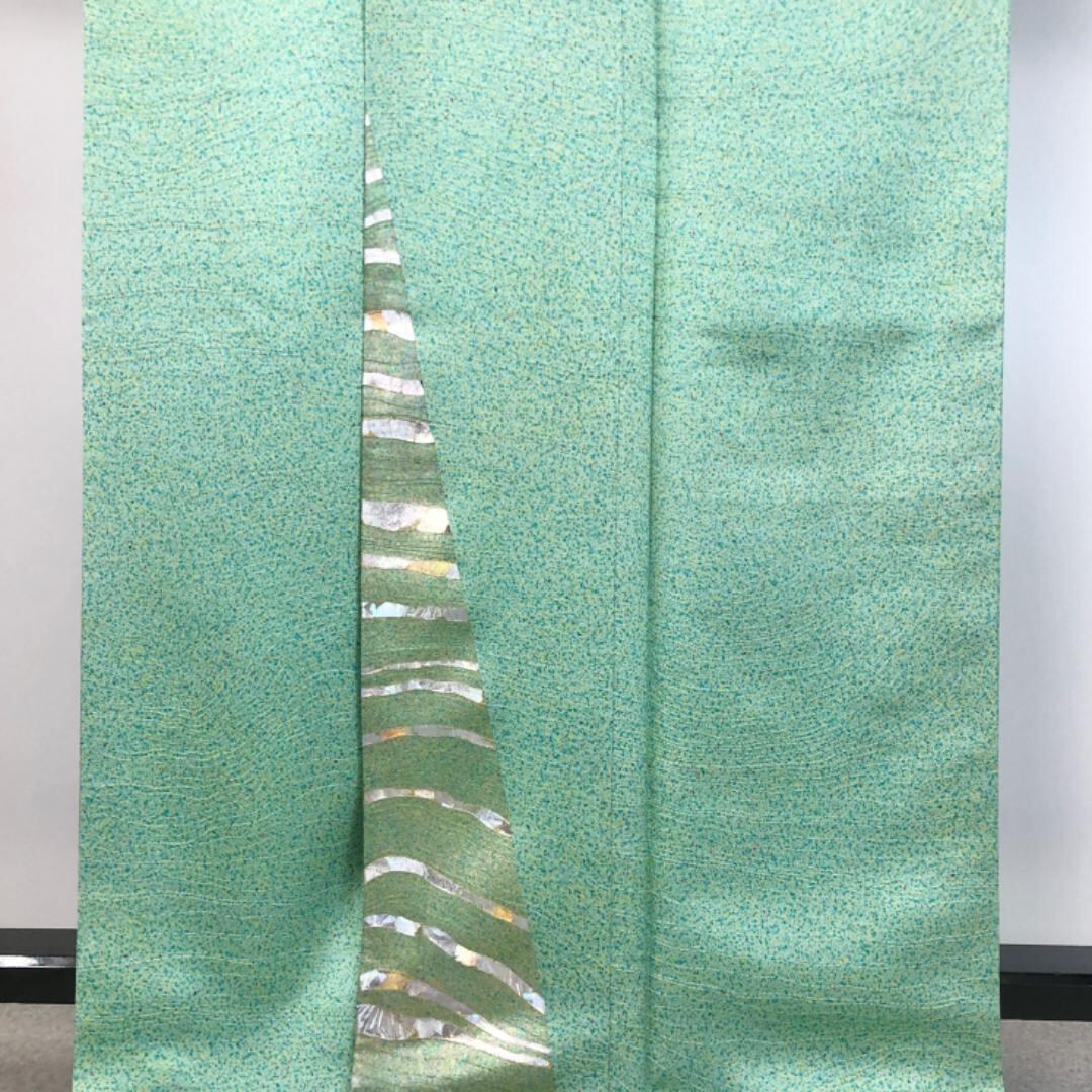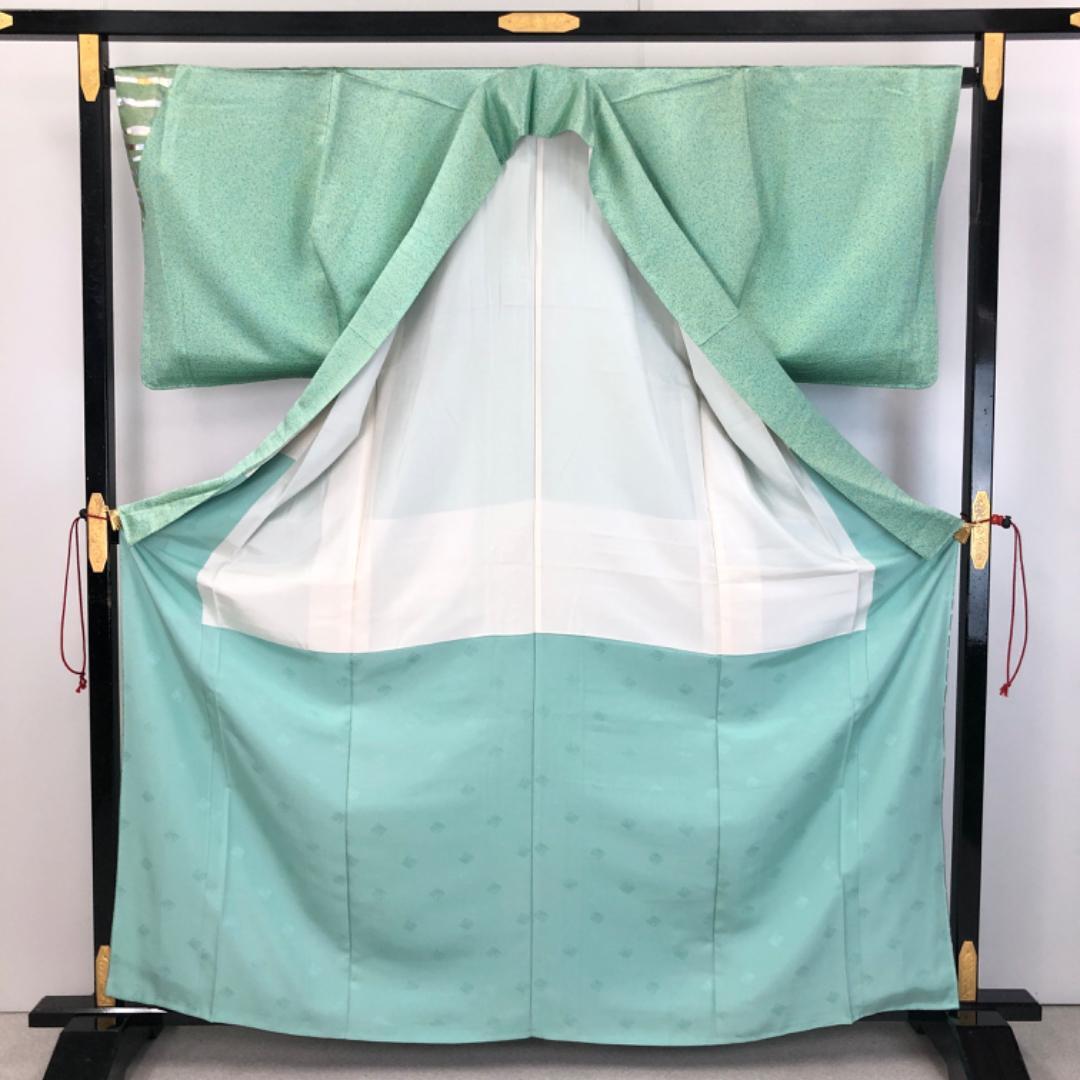 若竹色のお色味に美しい金銀箔の縞模様がデザインされた素敵な柄裄のお品でございます。