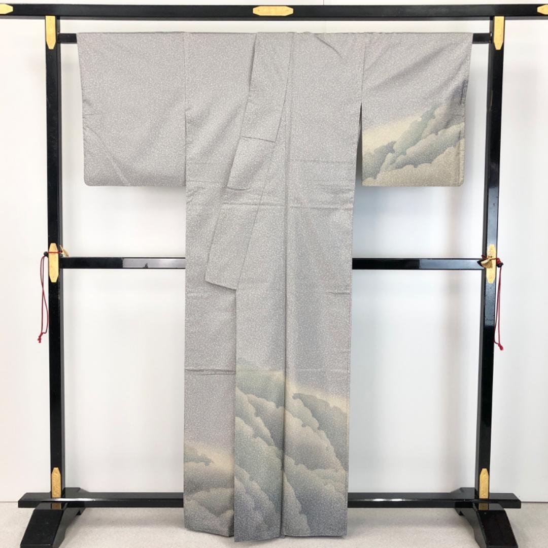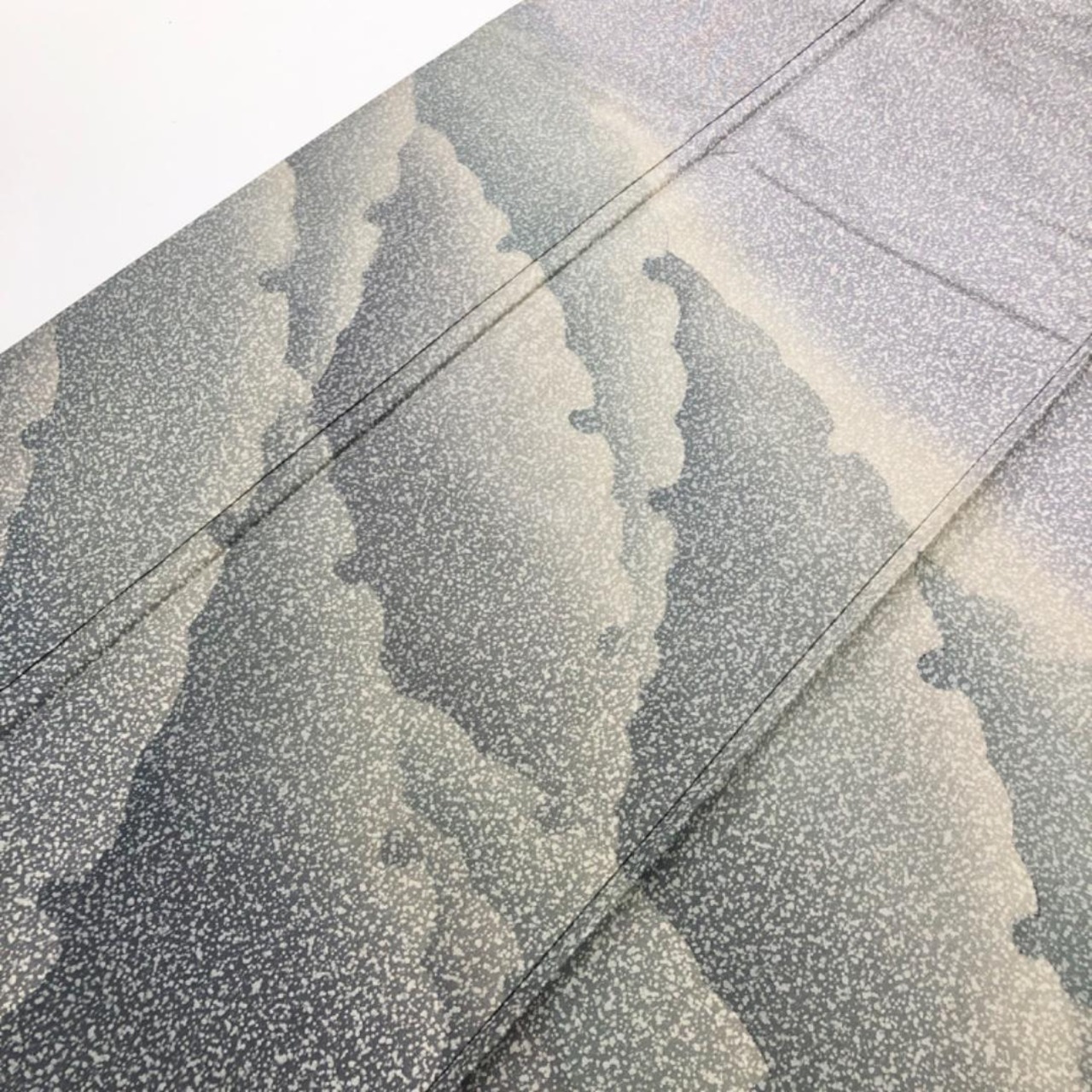 灰色ベースの品のあるお色味に叩き染、雪輪の波模様がデザインされた素敵なお品でございます。