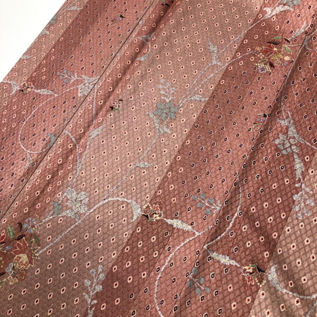浅蘇芳色ベースのお色味に 縦縞模様、花柄などの柄行がデザインされた素敵なお品でございます。