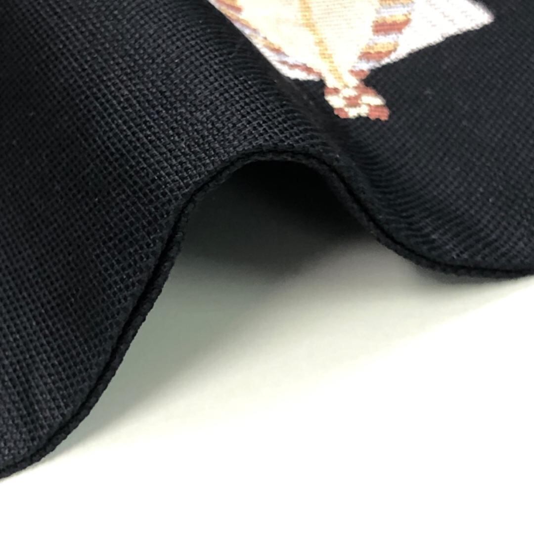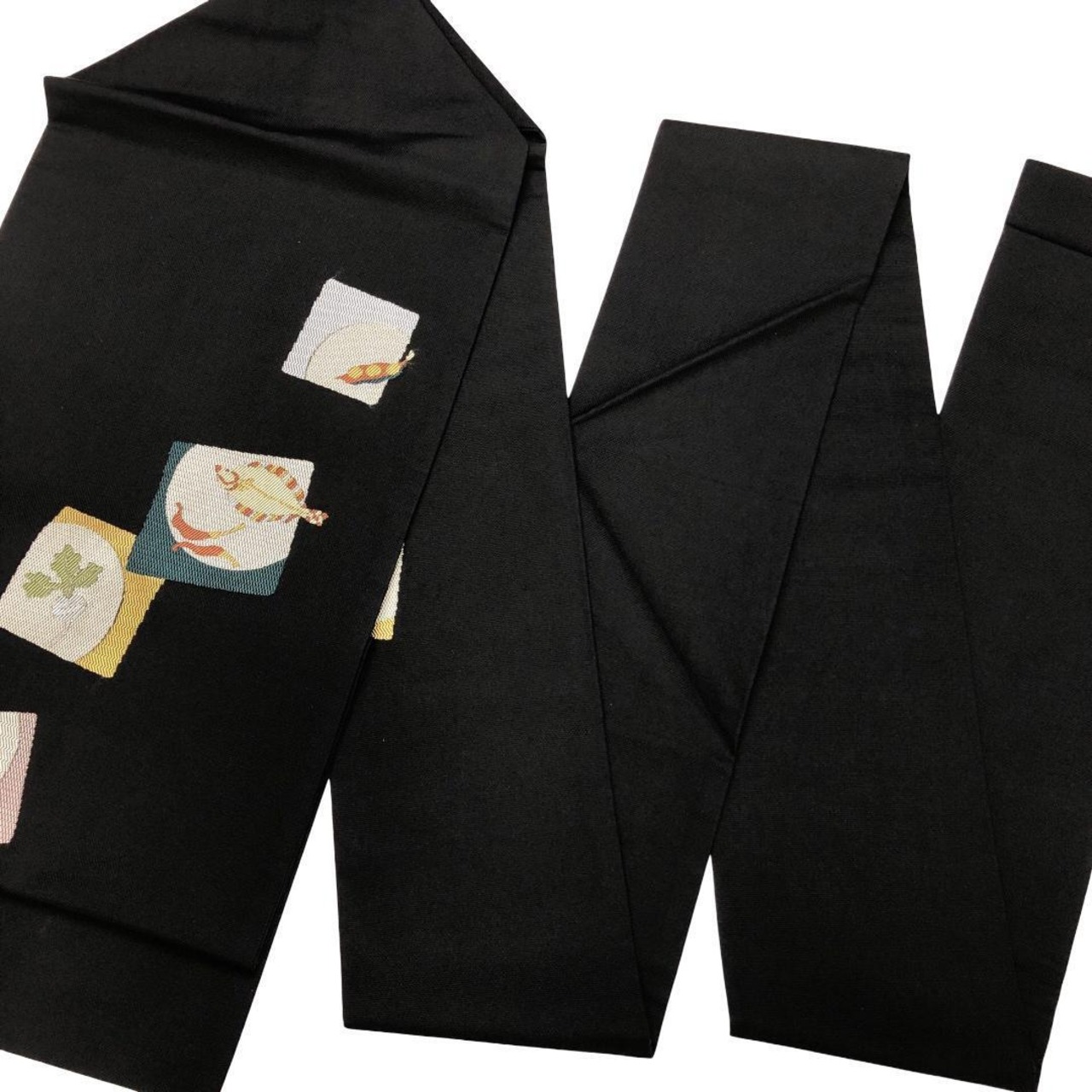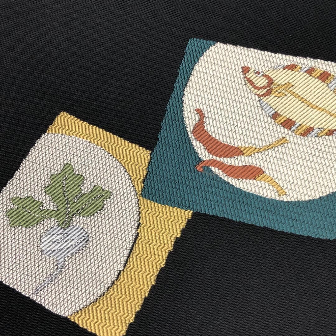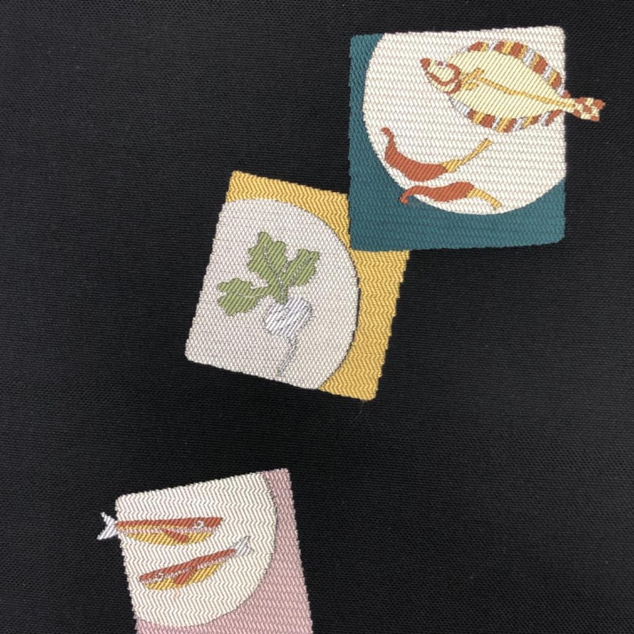 黒色のお色、四角の中に魚や野菜がデザインされた素敵な柄裄のお品でございます。