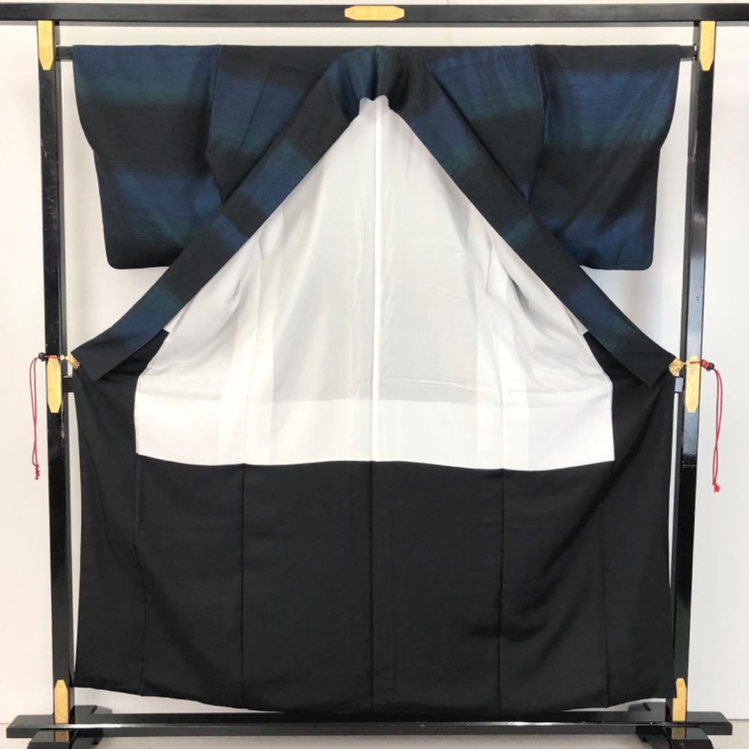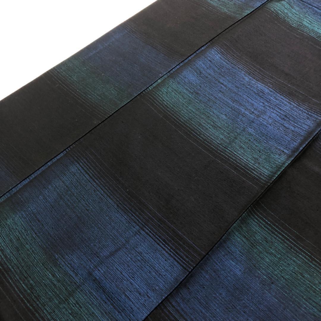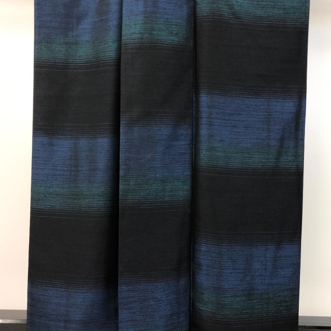 黒色に青緑のグラデーションのお色味が美しい、横段模様がデザインされた素敵な柄裄のお品でございます。