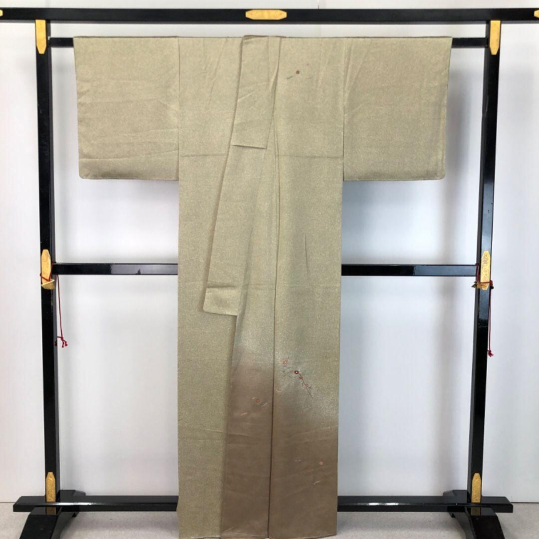 利休色ベースのお色味に叩き染、刺繍のさり気ない紅葉、松葉、花模様などの柄裄がデザインされた素敵なお品でございます。