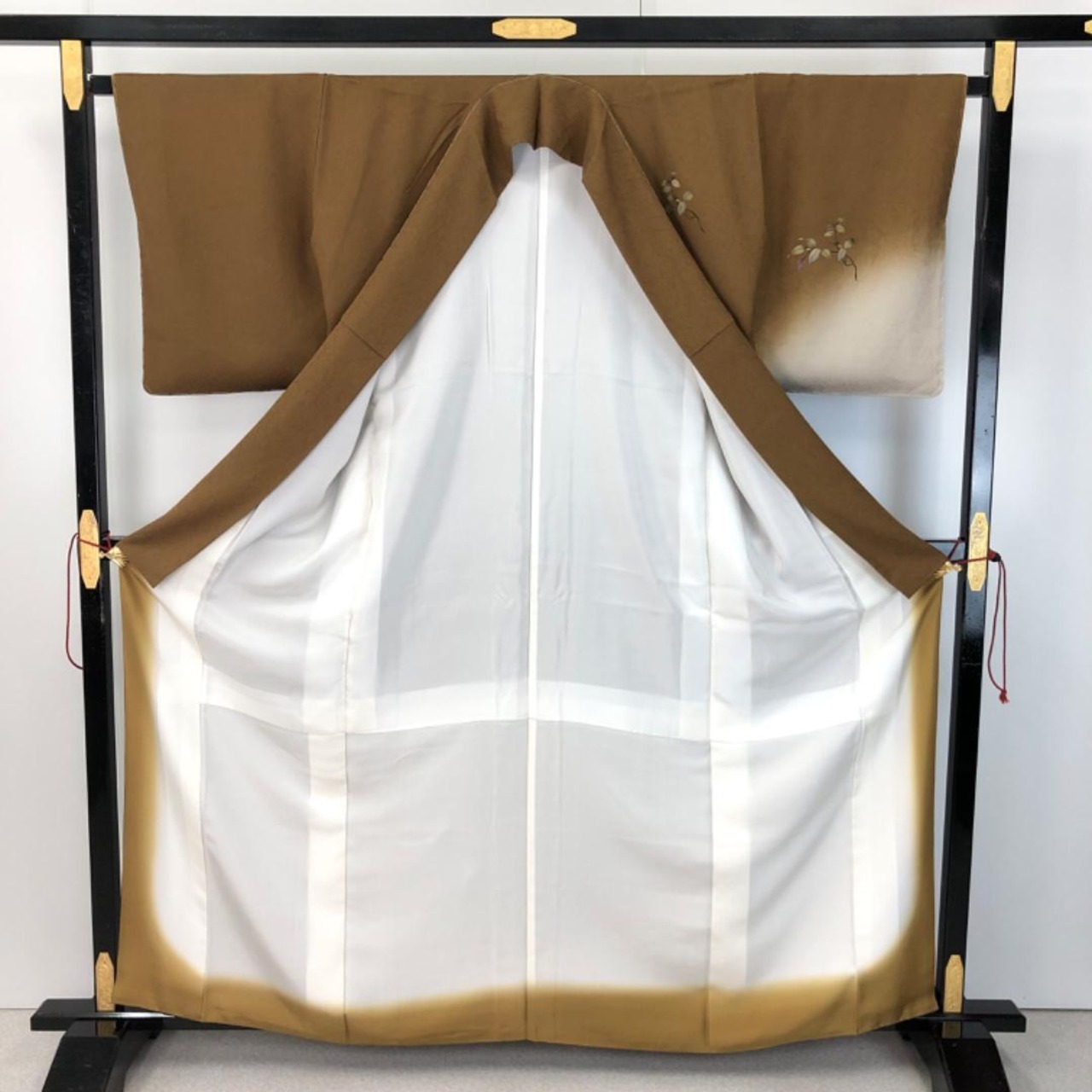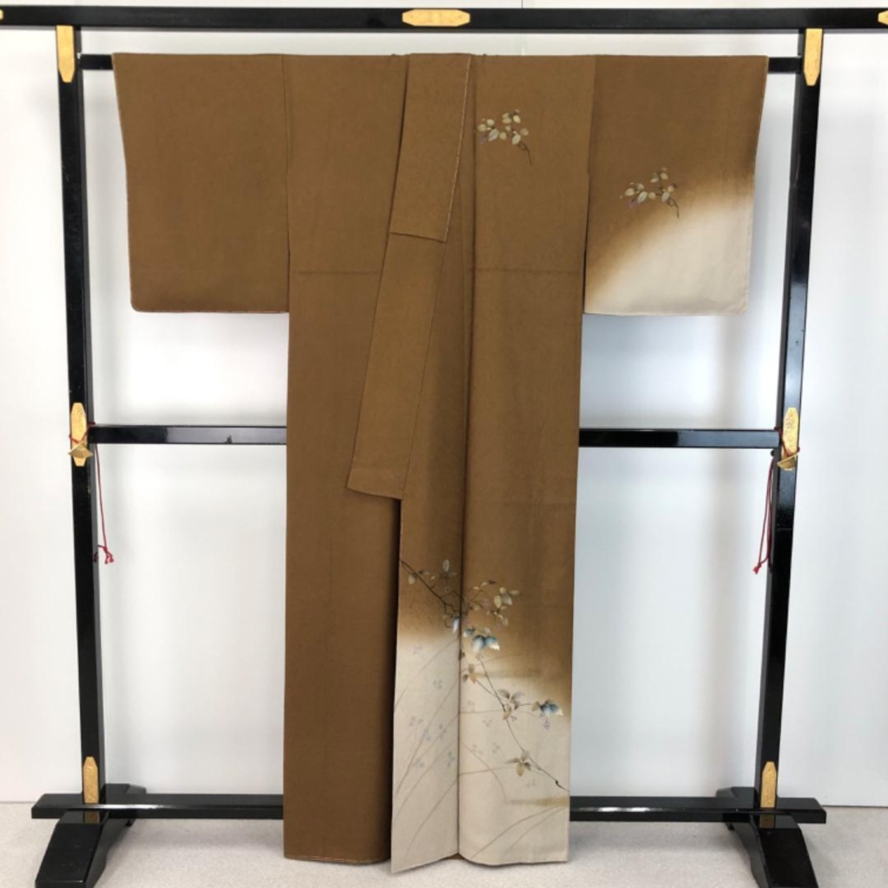 団栗色の落ち着いたお色味に暈し、枝葉模様がデザインされた素敵な柄裄のお品でございます。