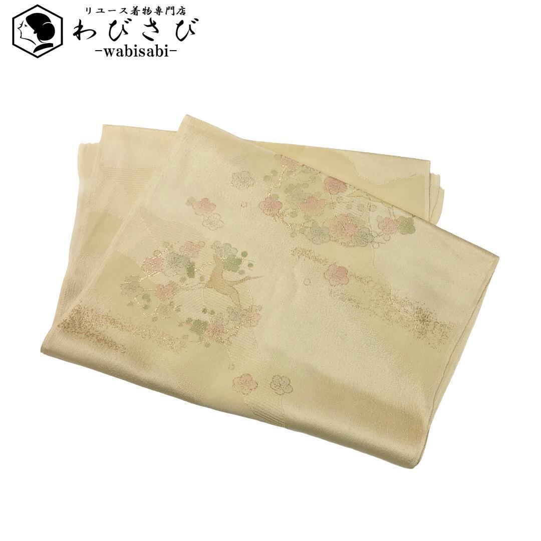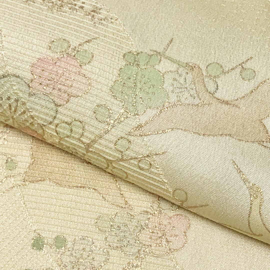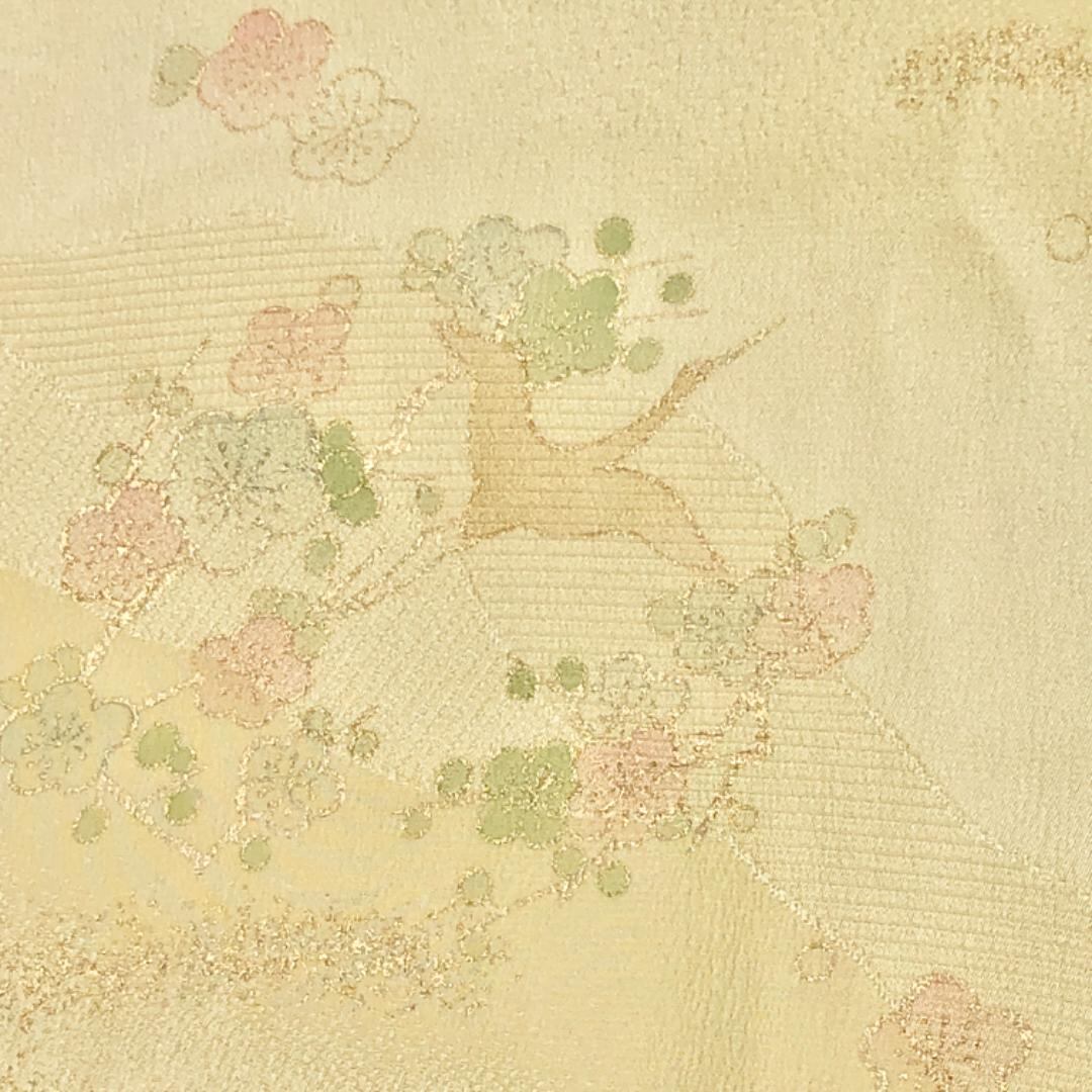 薄卵色のお色味に飛翔鶴、梅の花模様の柄裄がデザインされた素敵なお品でございます。