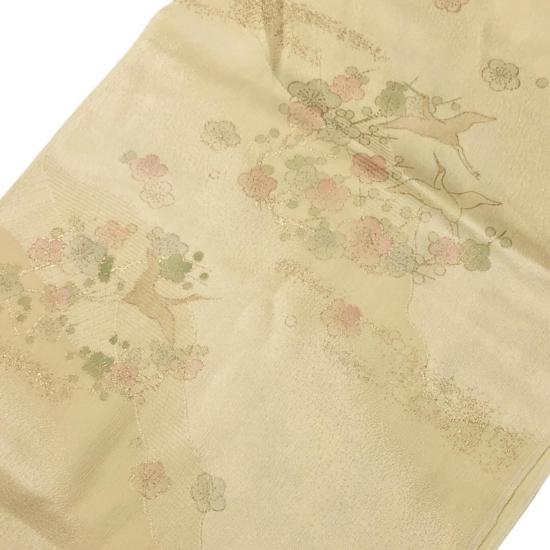 和装小物 帯揚げ 正絹 綸子 飛翔鶴に梅の花模様 薄卵色 金彩 C-6472 着物 きもの kimono 和服 和装 中古 リサイクル着物 【送料無料】