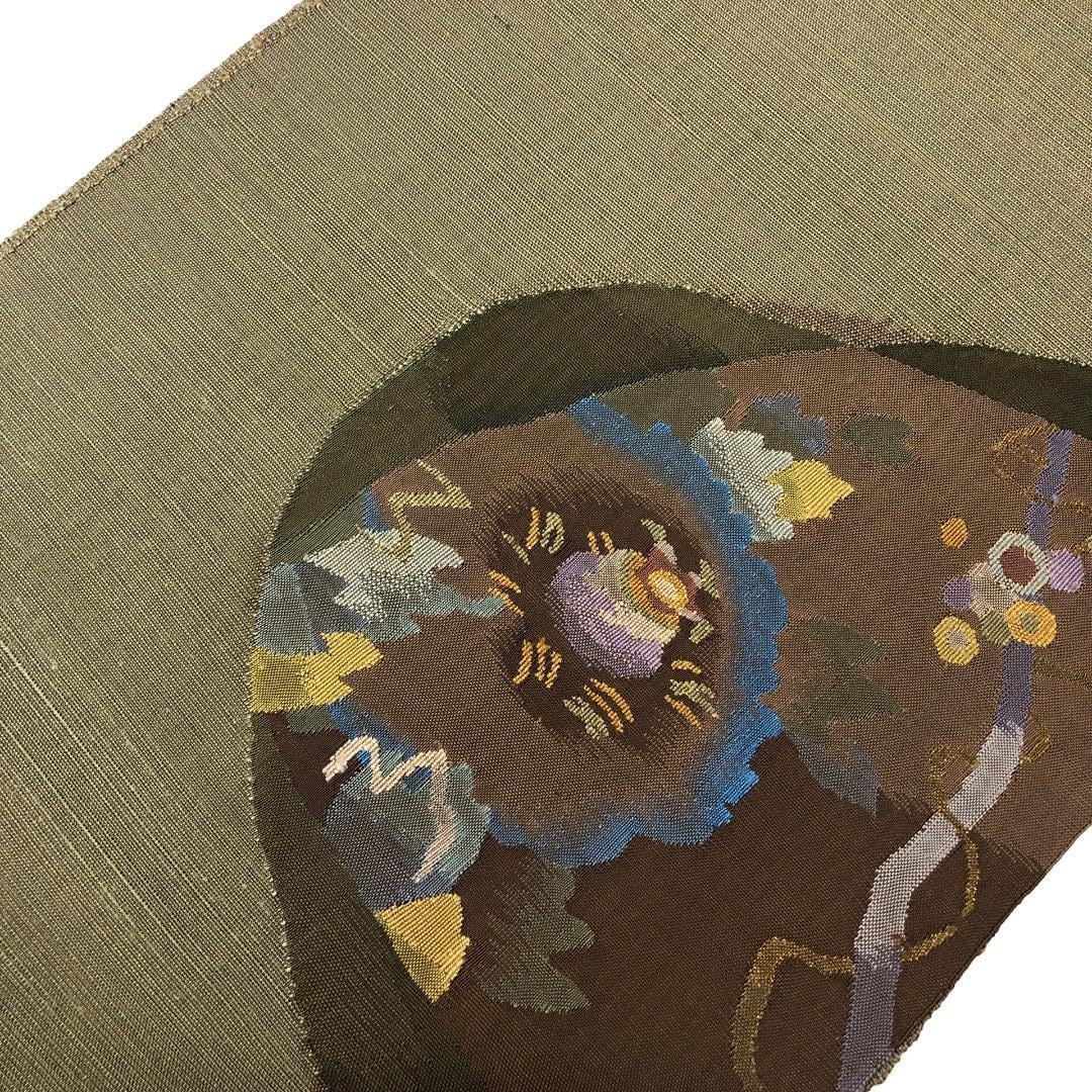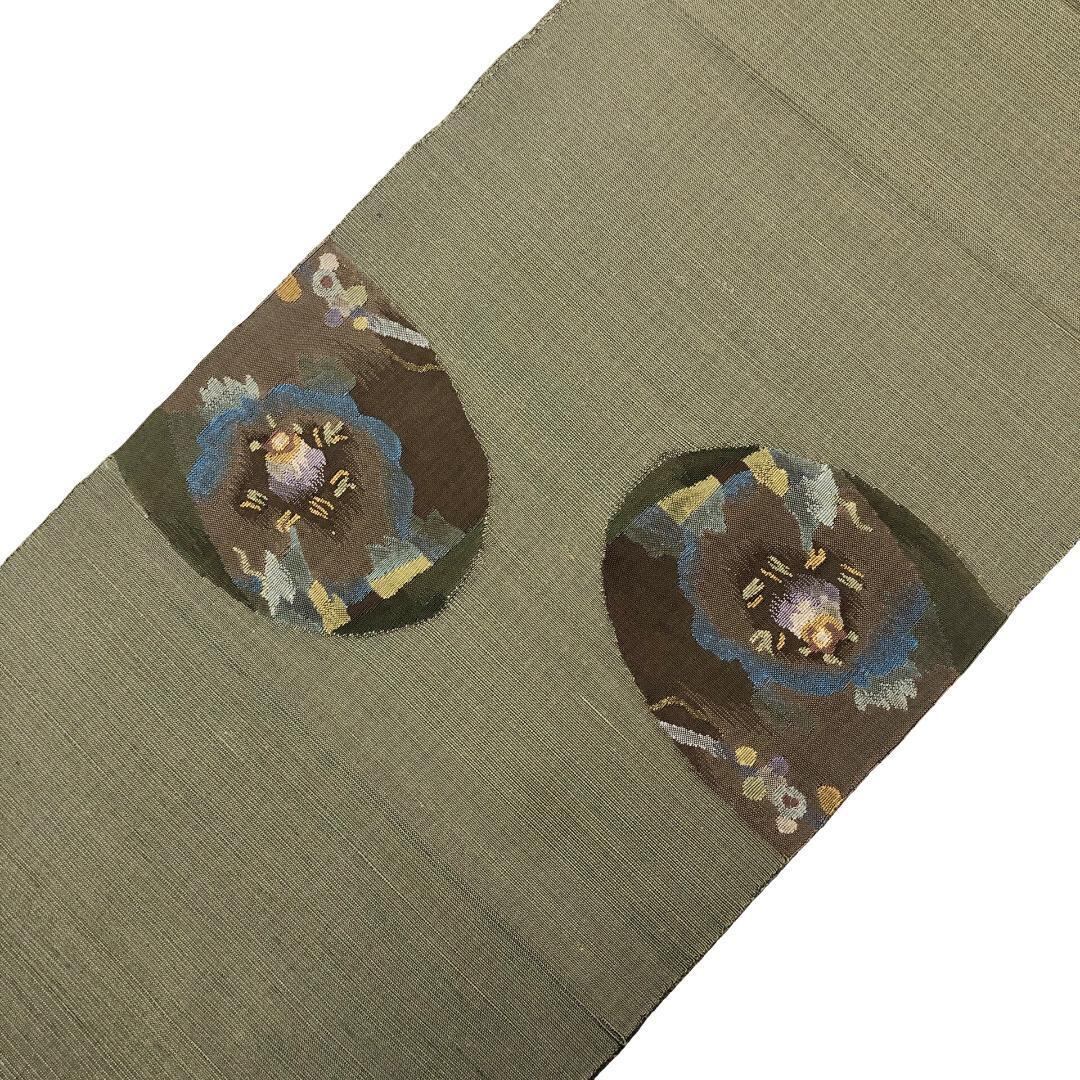 根岸色の紬、抽象花模様の柄裄がデザインされた雰囲気の良い素敵なお品でございます。