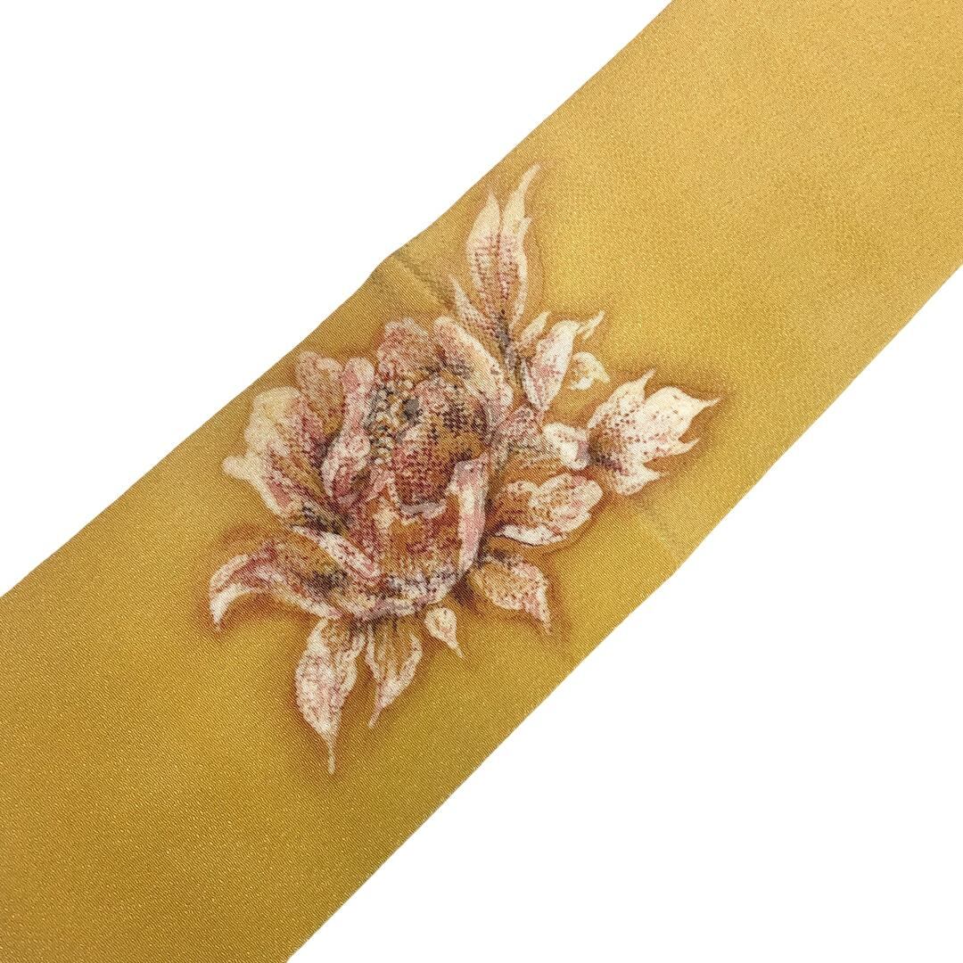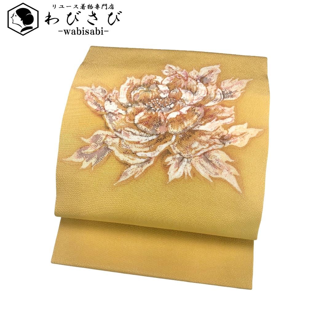名古屋帯 花柄模様 縮緬 黄唐紙色 O-5492 着物 きもの kimono 和服 和装 中古 リサイクル着物 【送料無料】