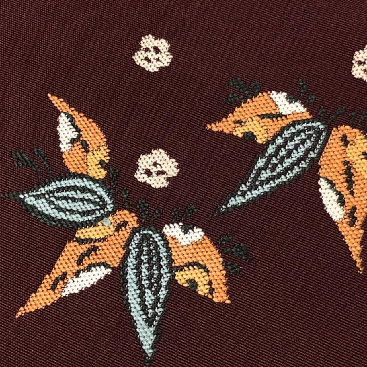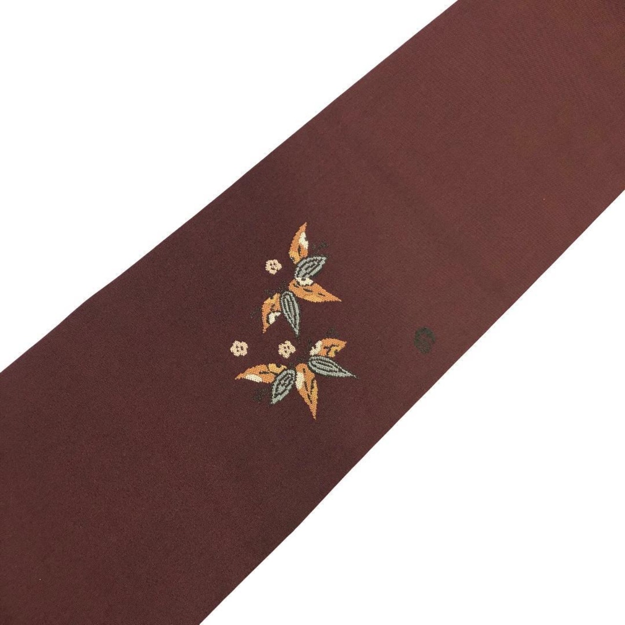 黒紅梅色のお色味に笹の葉に花柄模様がデザインされた素敵な柄裄のお品でございます。