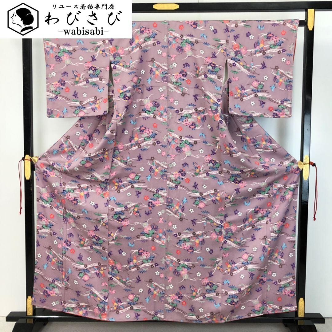 小紋 型染 鳥 花模様 薄紫色 しつけ糸 K-5279 着物 きもの kimono 和服 和装 中古 リサイクル着物 【送料無料】
