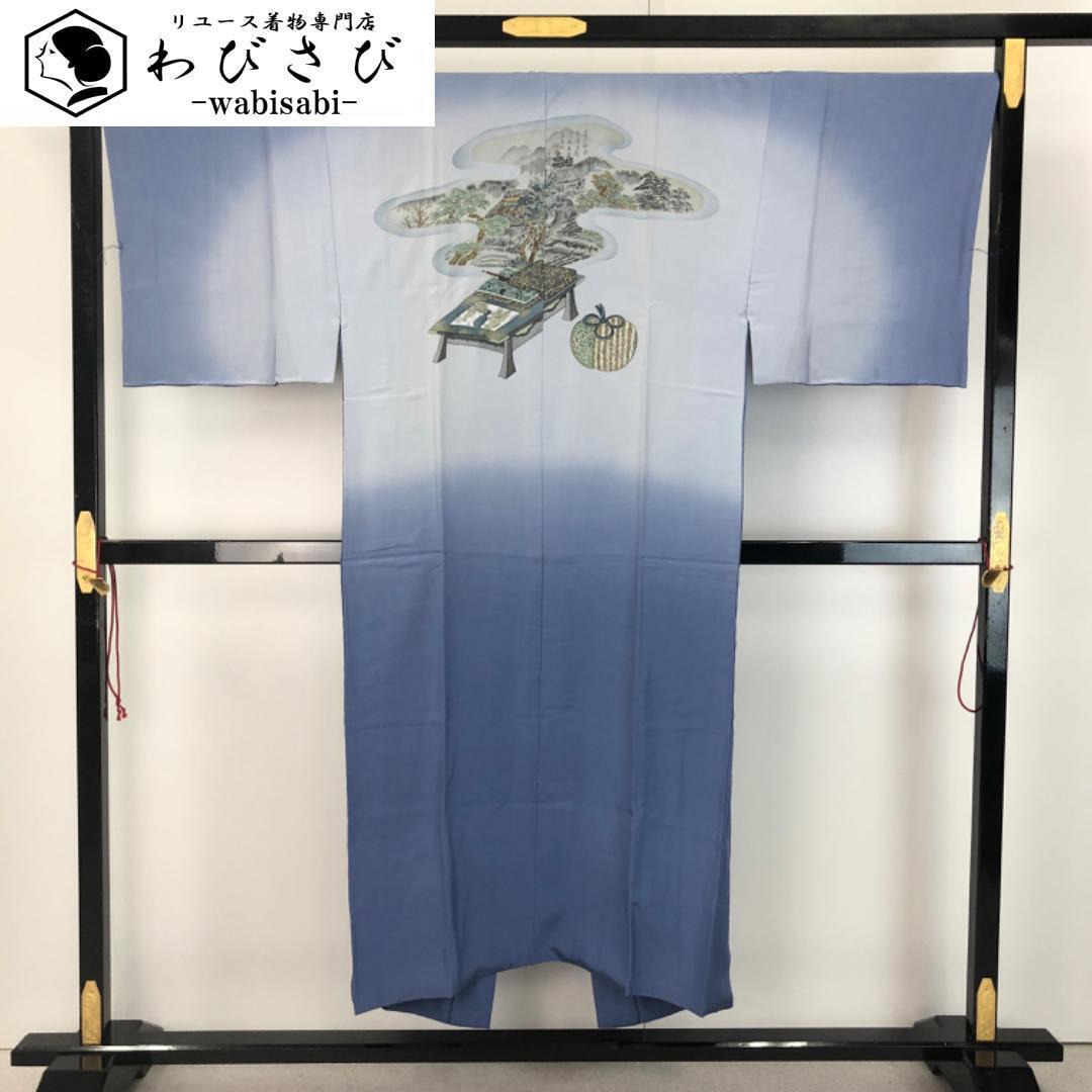 男襦袢 長襦袢 男物 風景柄 紺藤色 しつけ糸 U-1514 着物 きもの kimono 和服 和装 中古 リサイクル着物 【送料無料】
