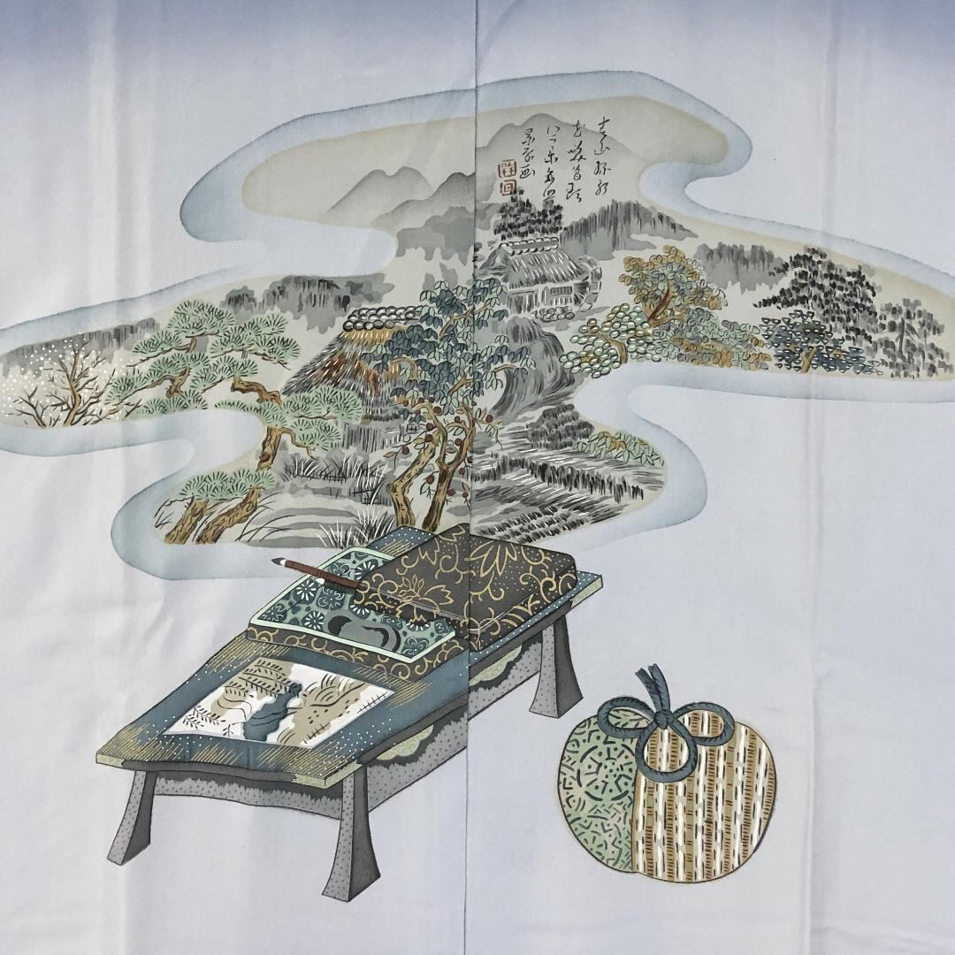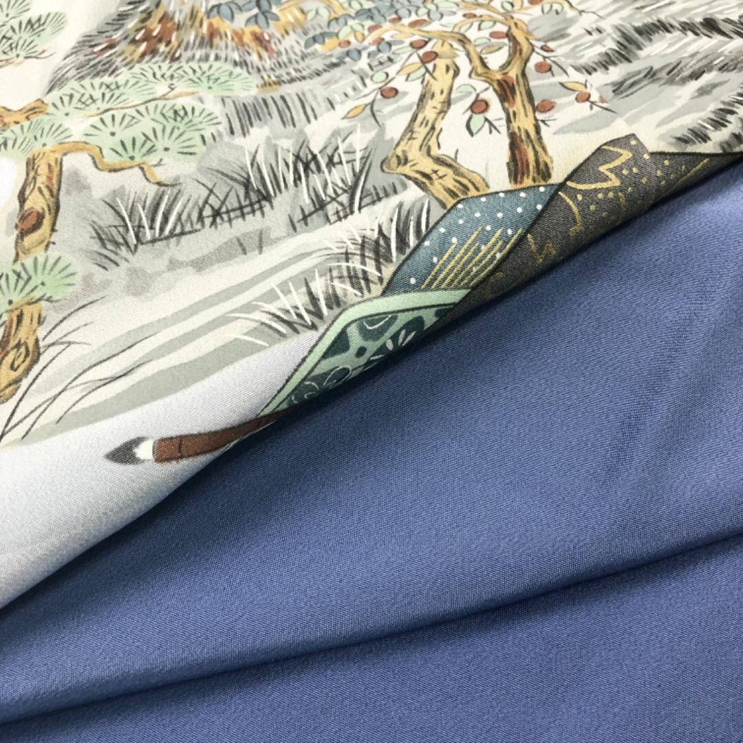 紺藤色のお色味に風景柄がデザインされた素敵な柄裄のお品でございます。