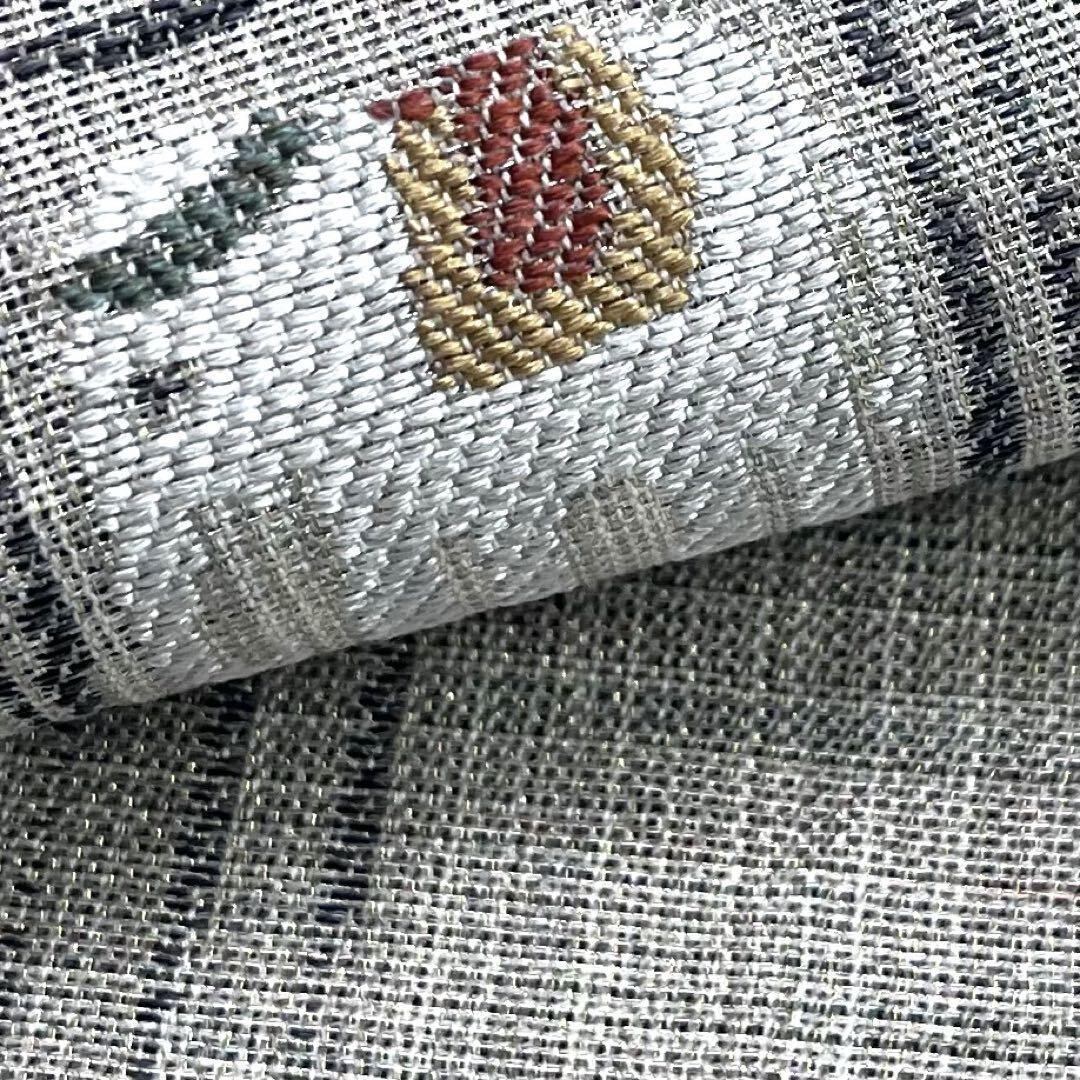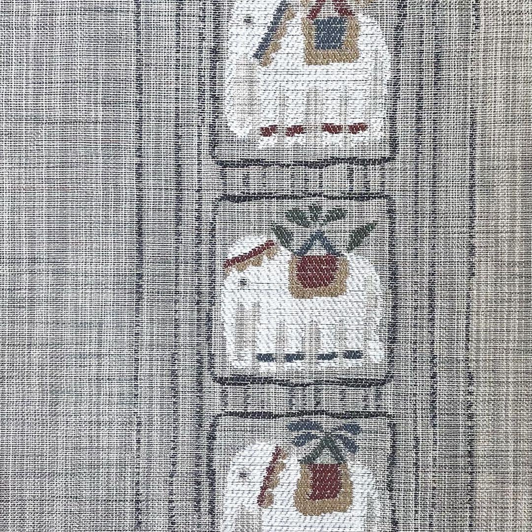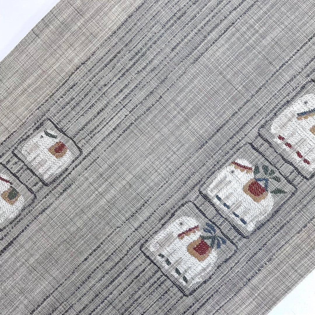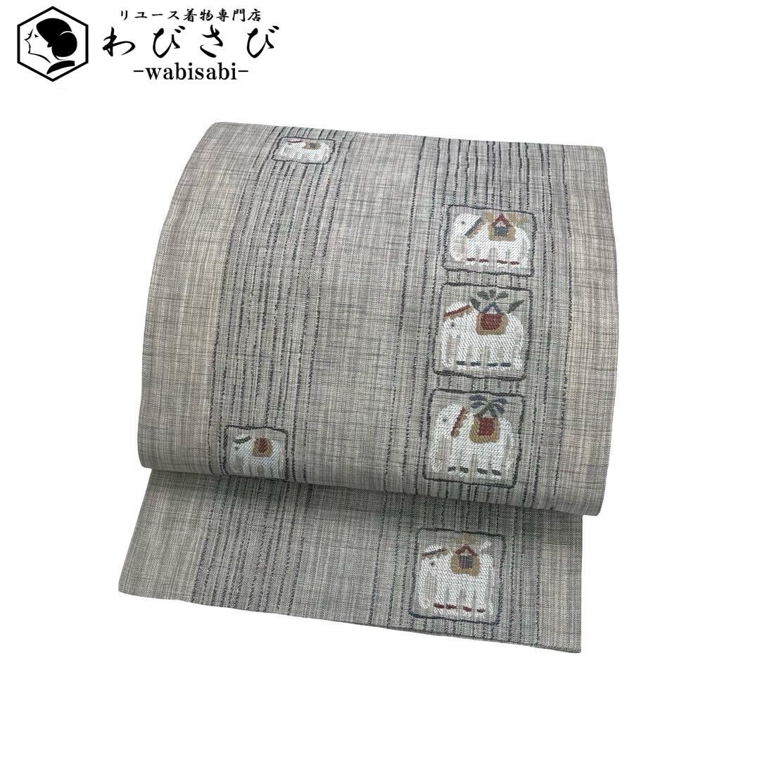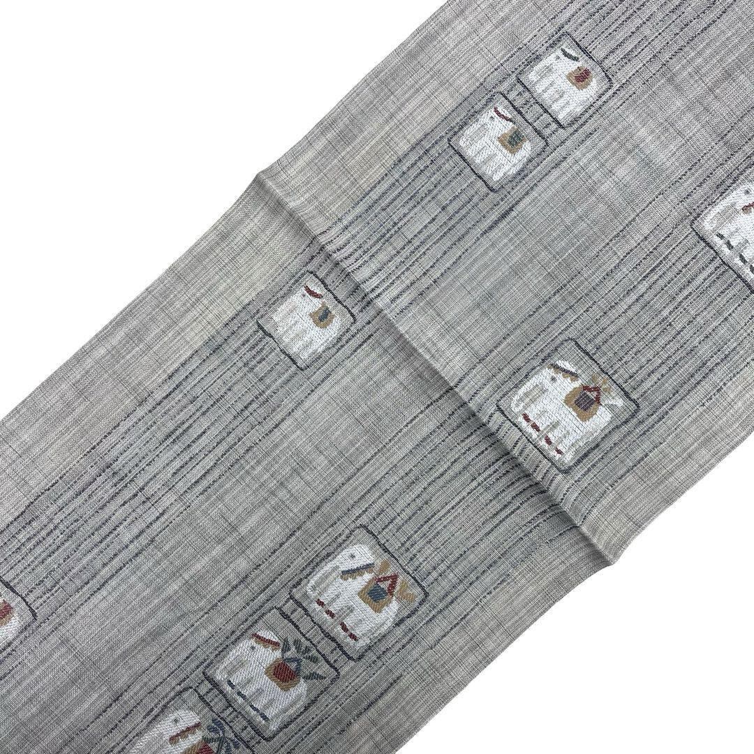 薄灰色ベースの落ち着きのある紬地、四角の中に象の柄行がデザインされた素敵なお品でございます。