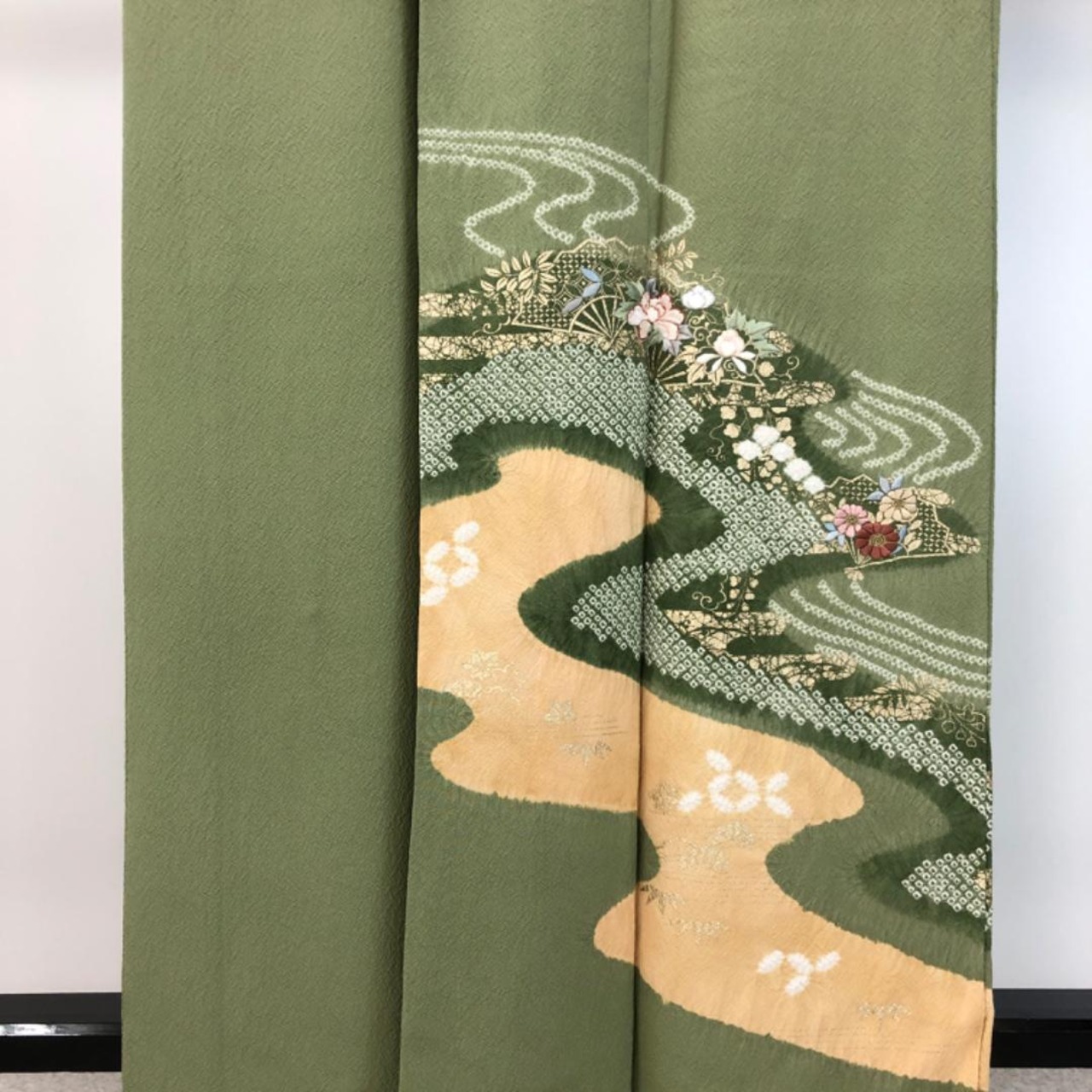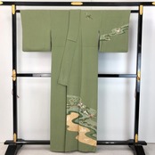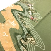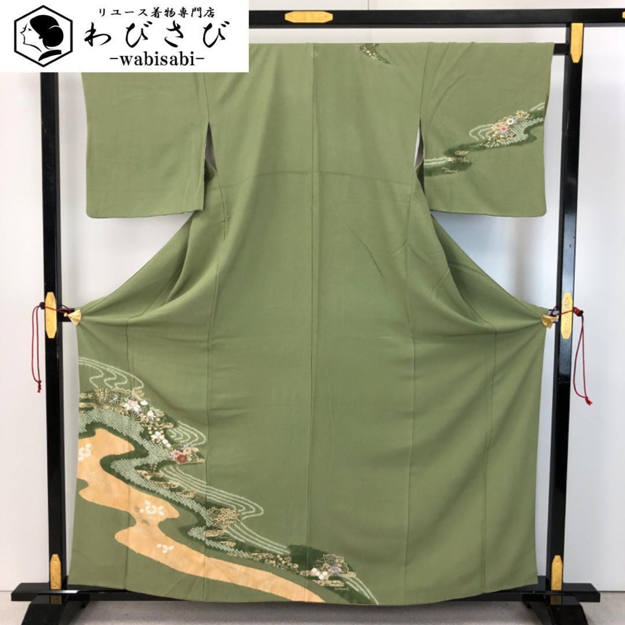 梅幸茶色のお色味の縮緬、流水に刺繍の花模様などの柄裄がデザインされた素敵なお品でございます。