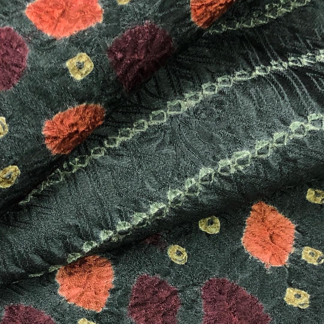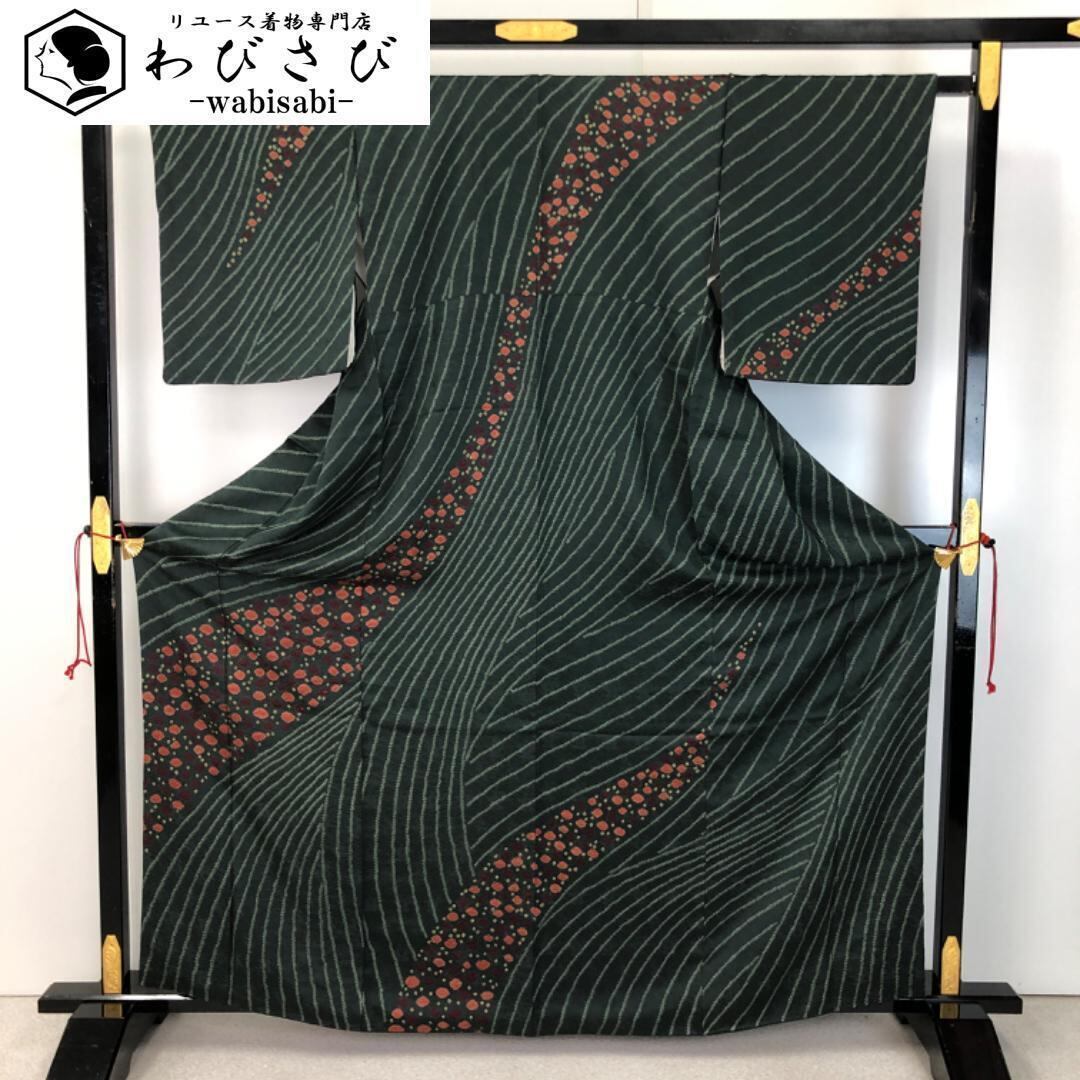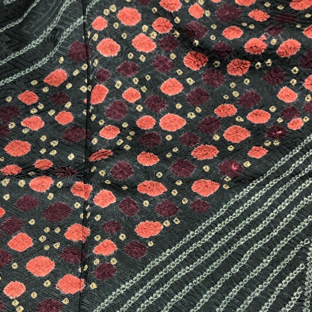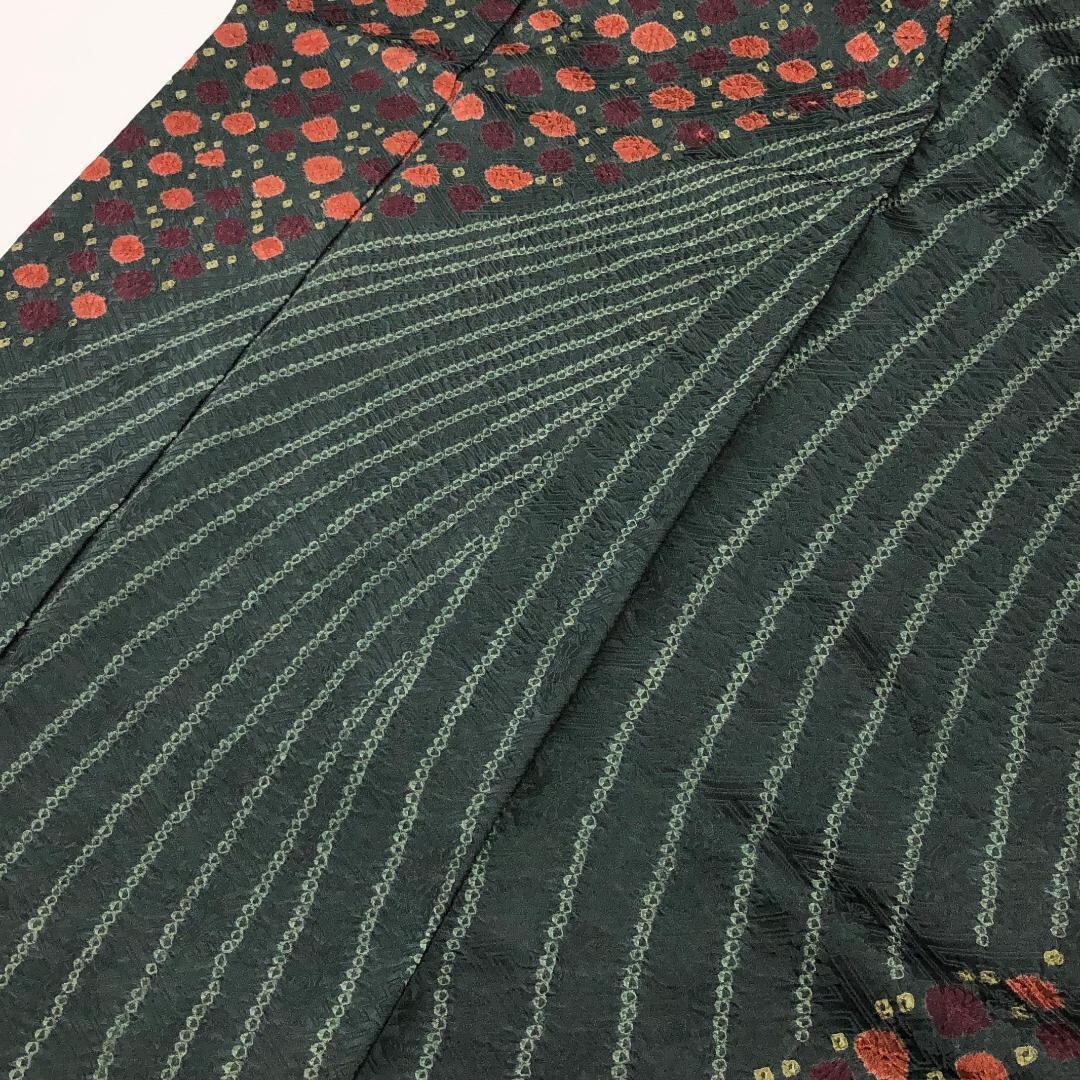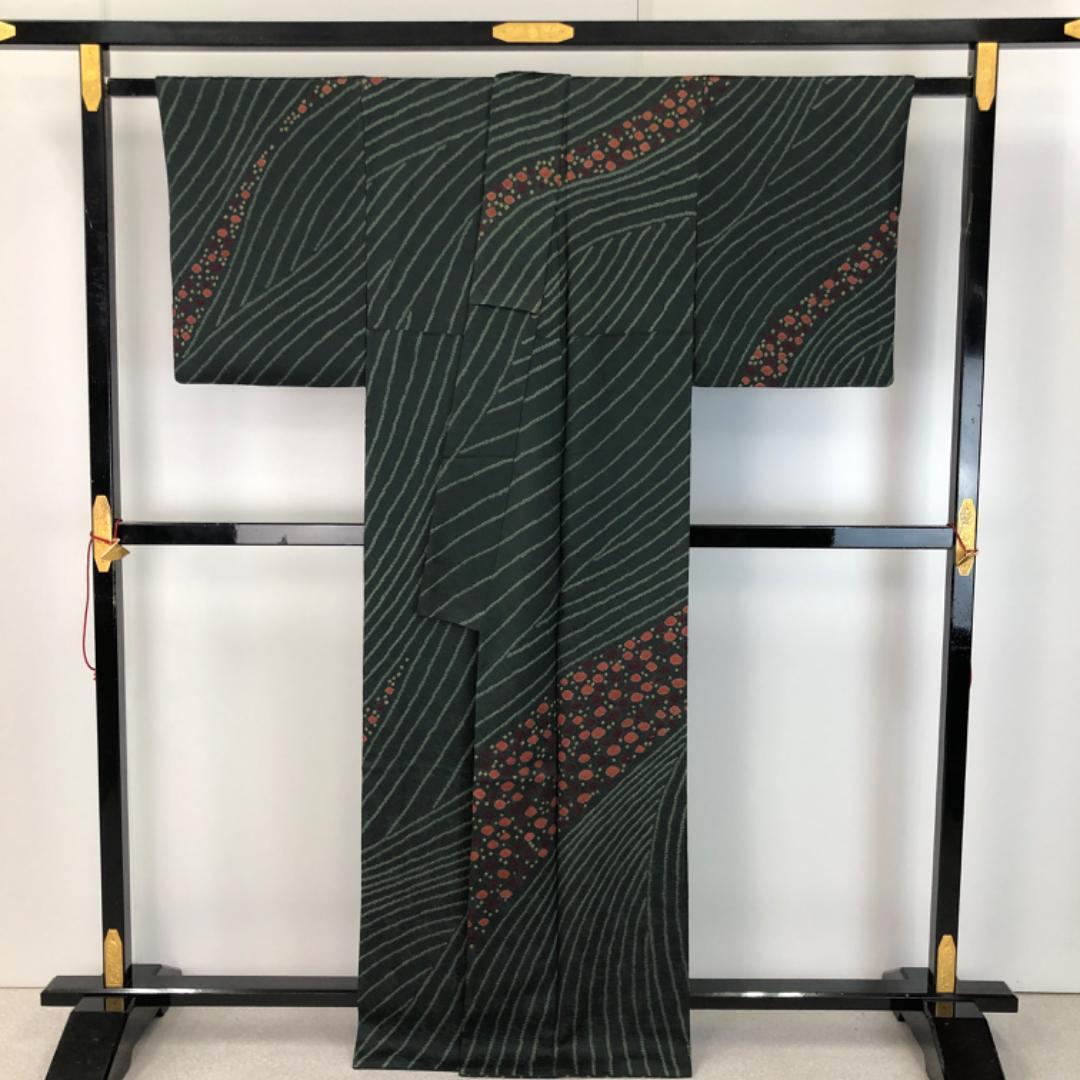 錆鉄色の落ち着きあるお色味に曲線絞り模様の柄裄がデザインされた雰囲気の良い素敵なお品でございます。
