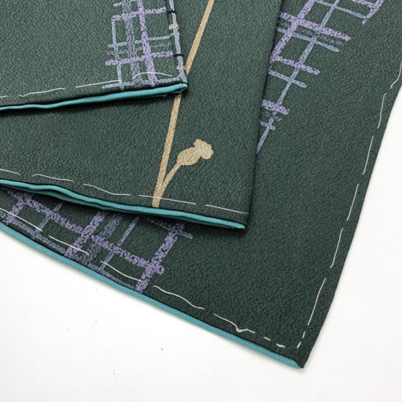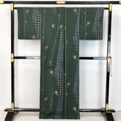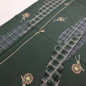 黒緑色のお色味の縮緬地に丸柄華模様、組紐などの柄裄がデザインされた素敵なお品でございます。