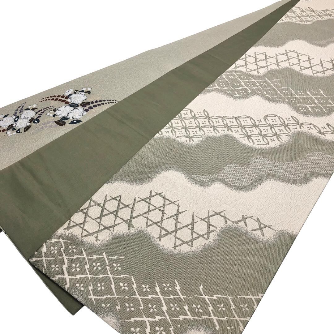 蕎麦切色の上品なお色味に雰囲気の良い辻が花模様の柄裄がデザインされた素敵なお品でございます。