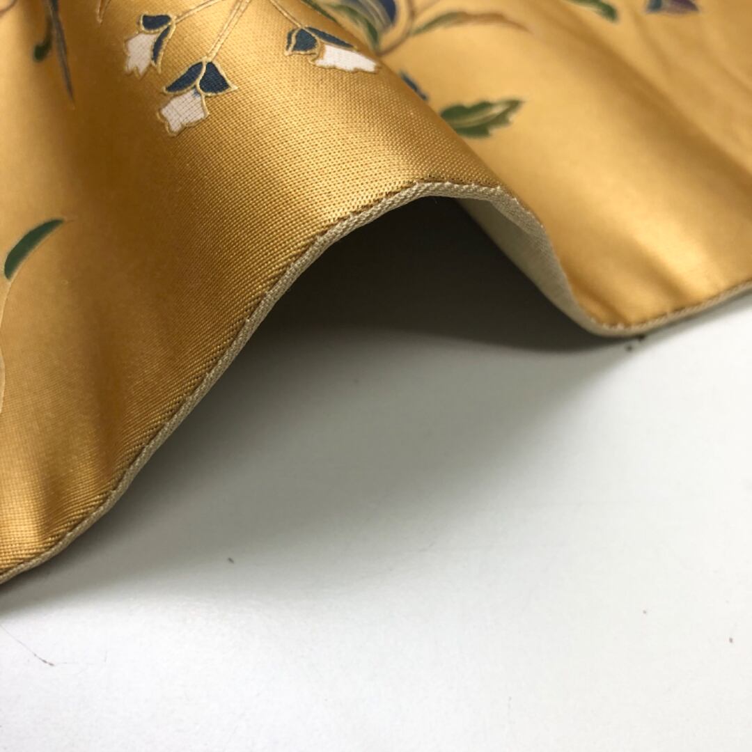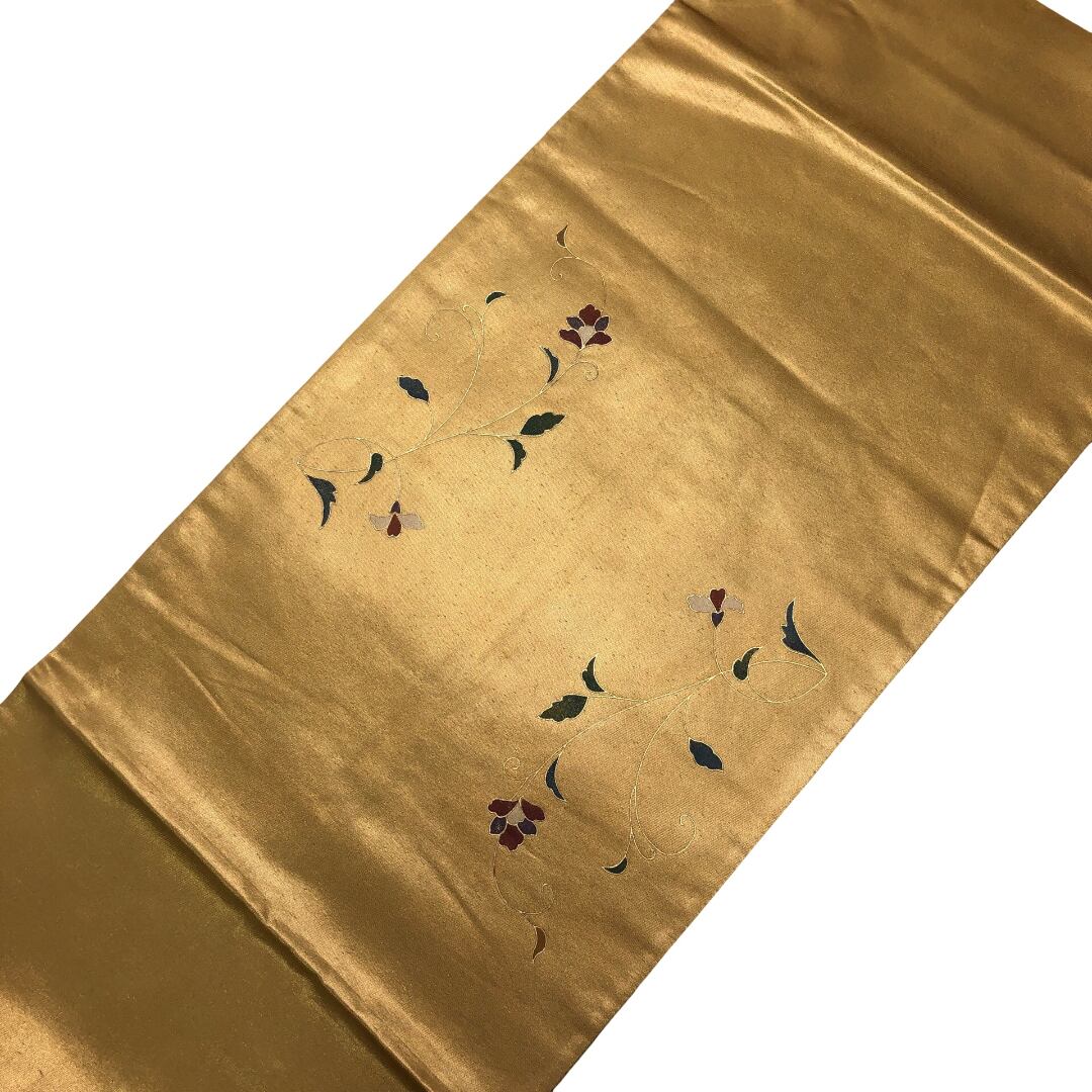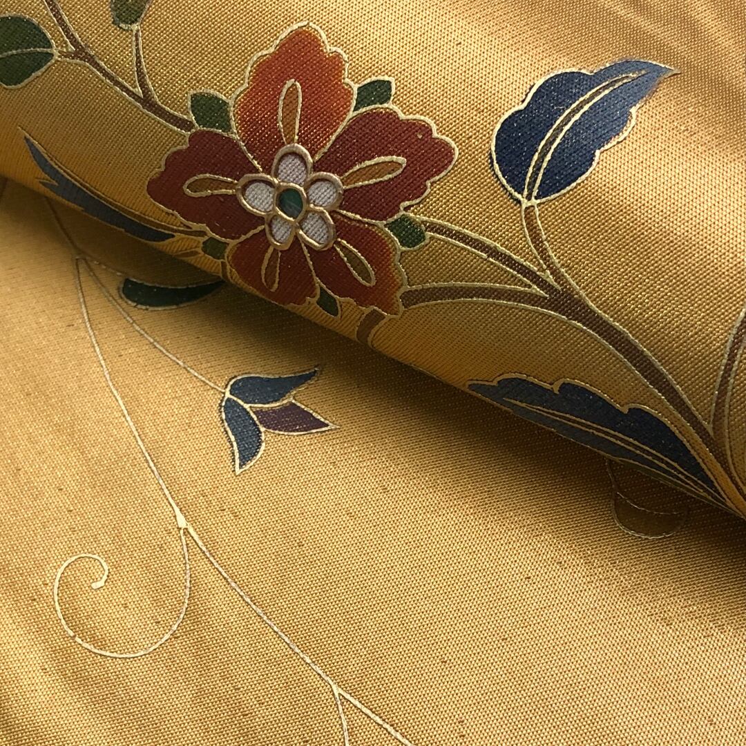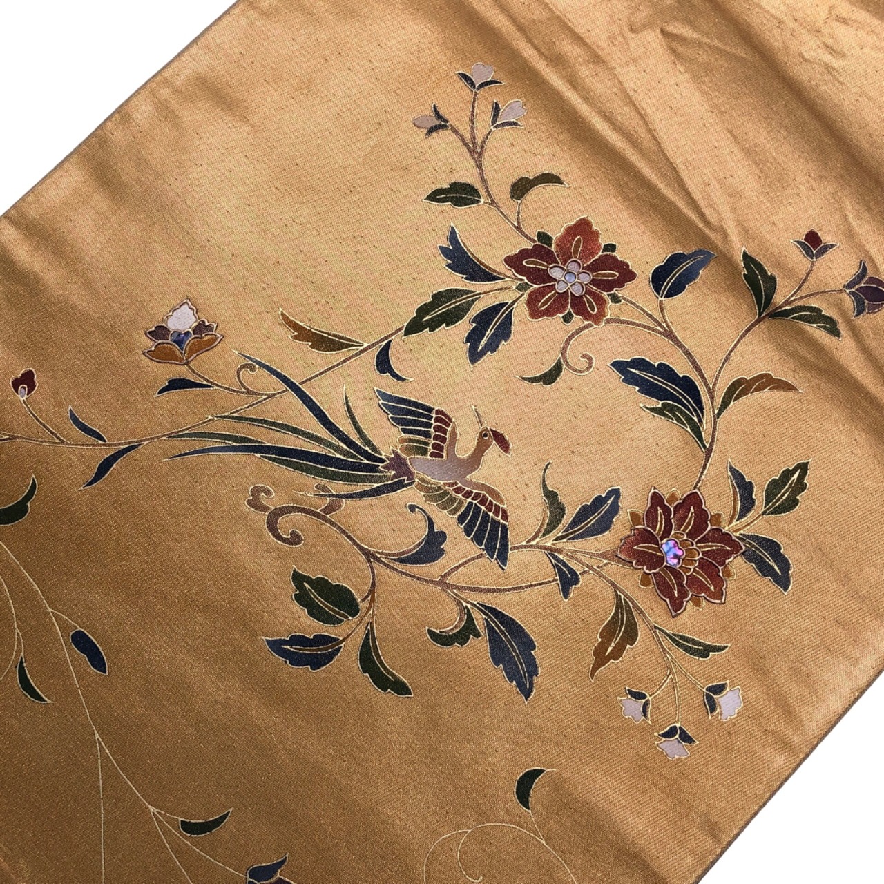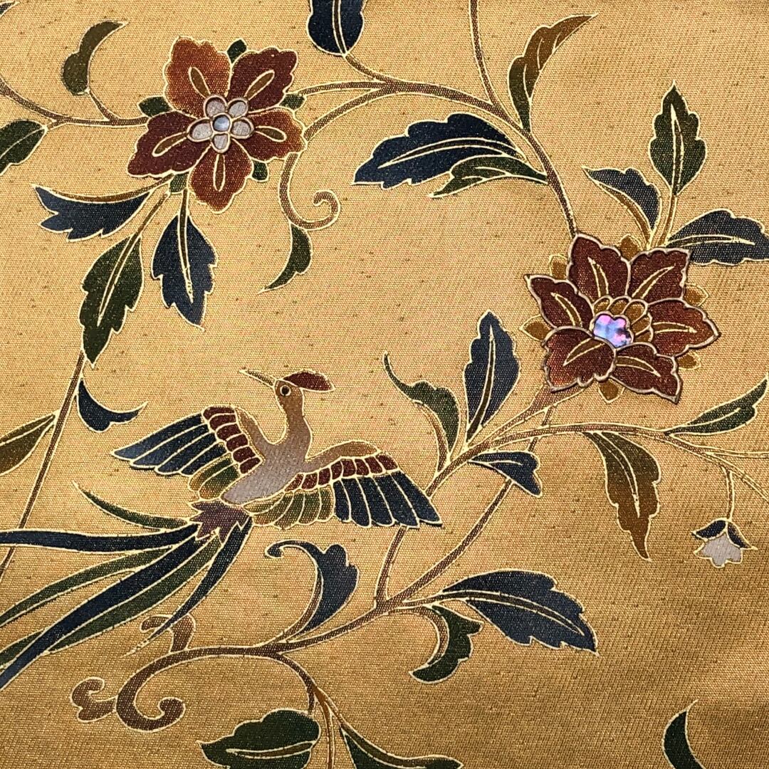 金色のお色味に螺鈿が使われた花唐草模様、花喰い鳥がデザインされた素敵なお品でございます。