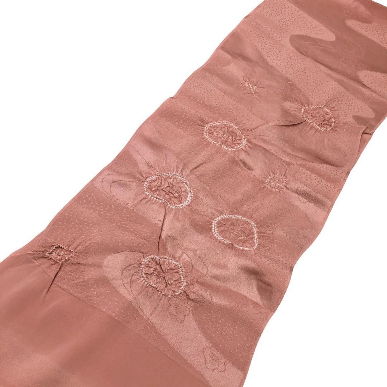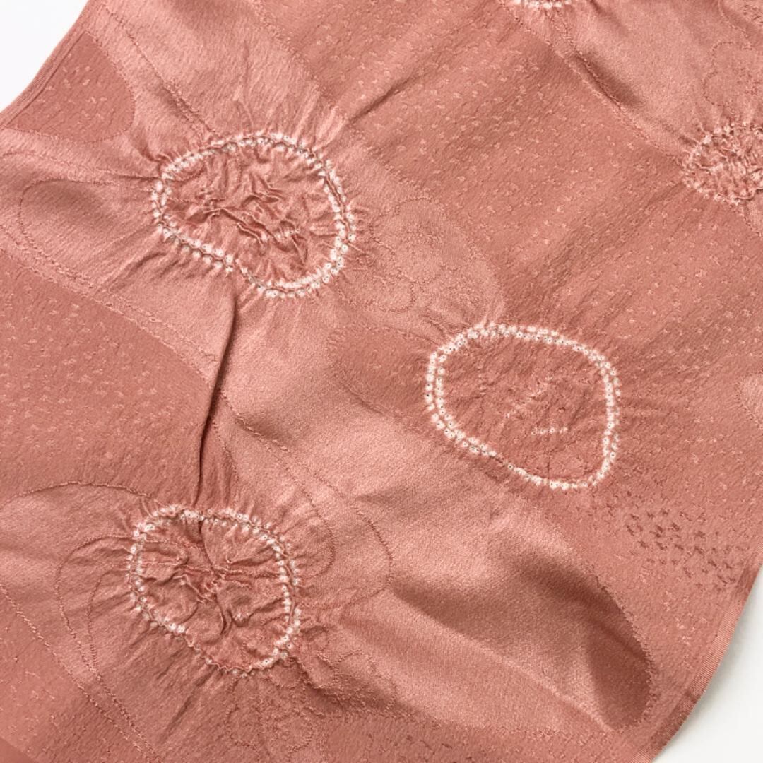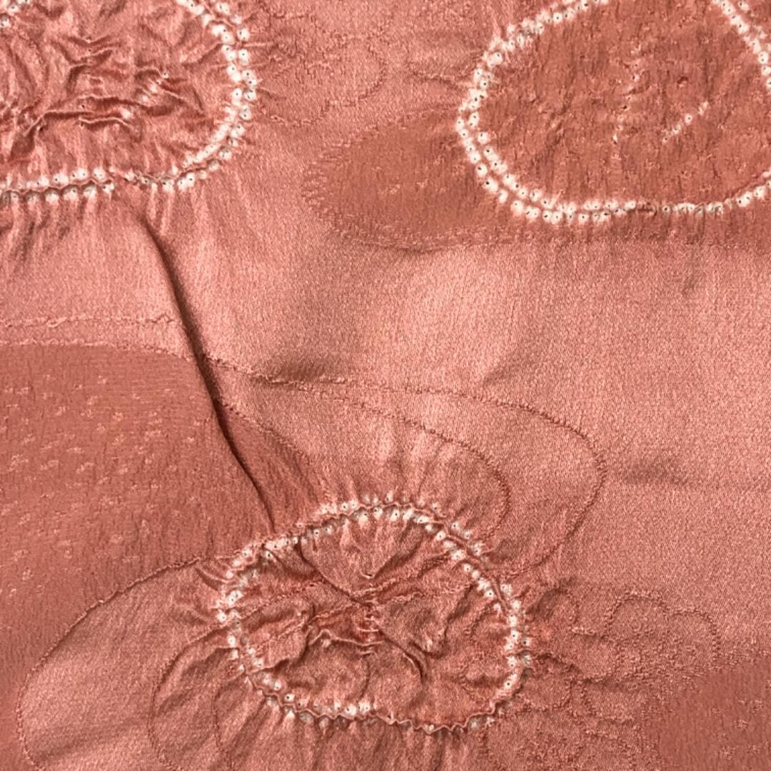 浅蘇芳色のお色味に流水模様、花柄が絞りでデザインされた素敵なお品でございます。