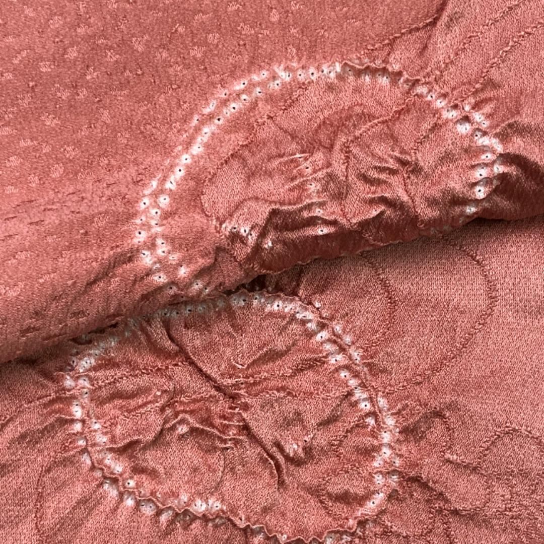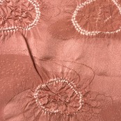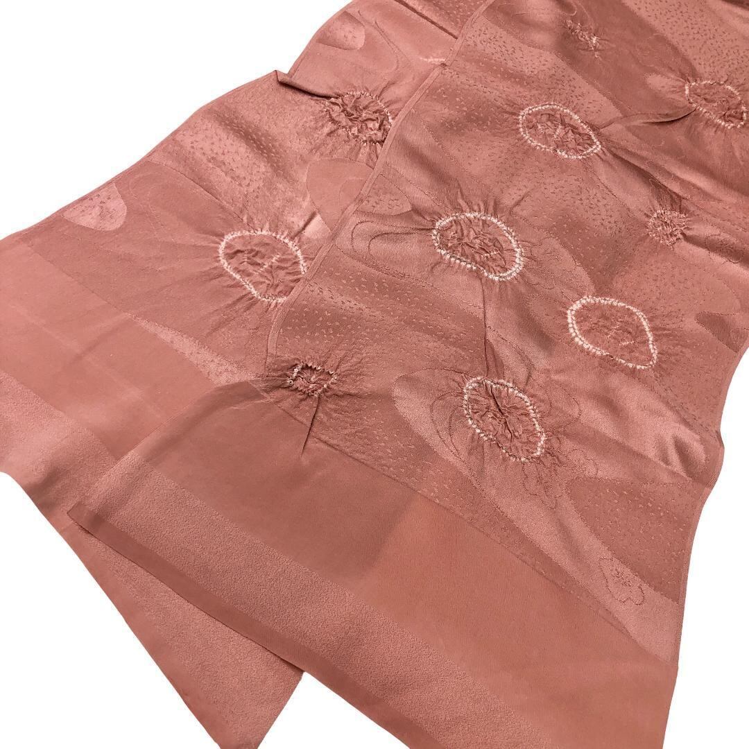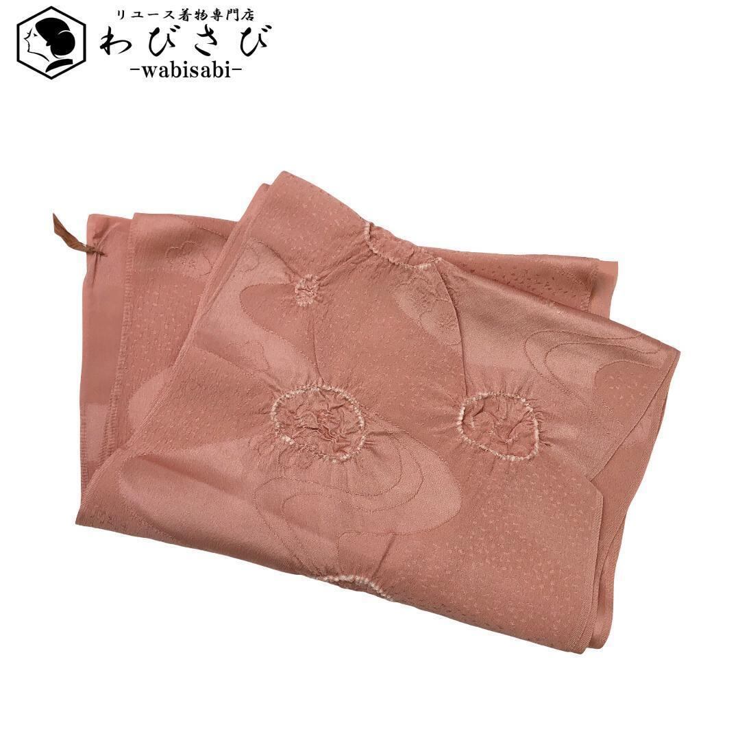 浅蘇芳色のお色味に流水模様、花柄が絞りでデザインされた素敵なお品でございます。