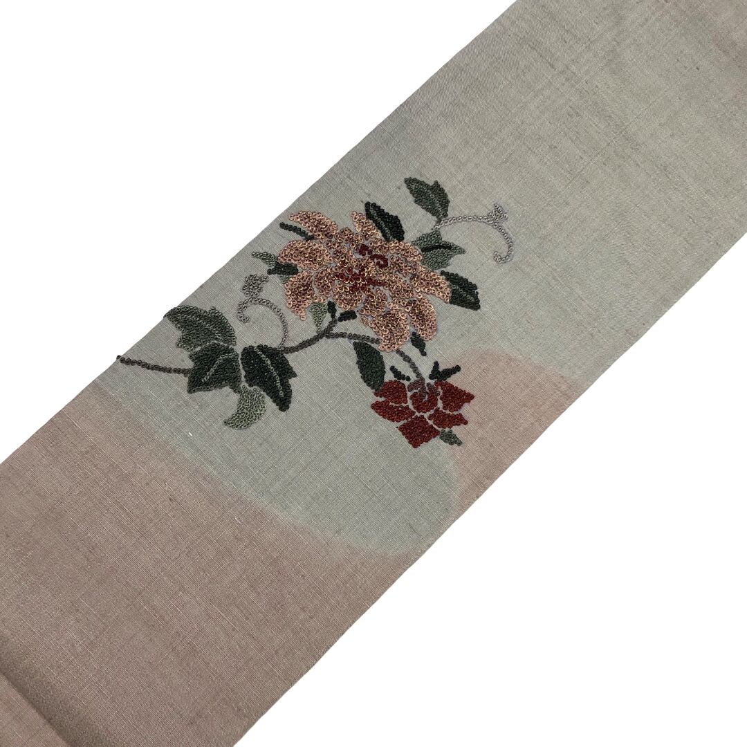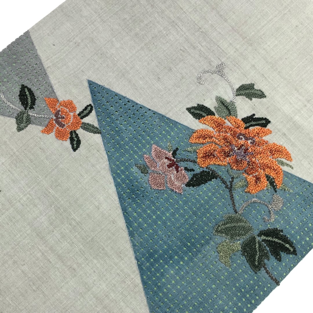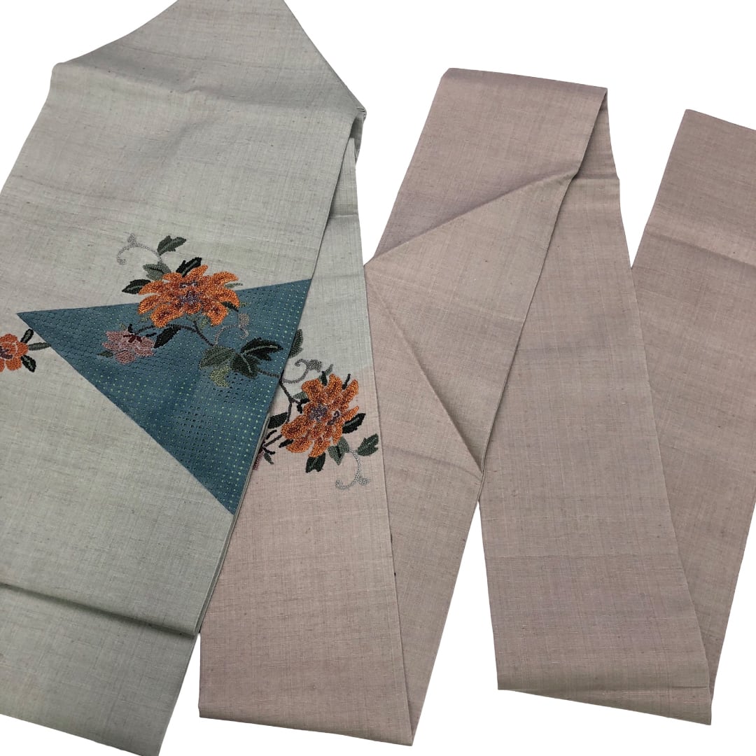 絹鼠色ベースのお色味の紬地に汕頭刺繍、相良刺繍で花柄模様がデザインされた素敵な柄裄のお品でございます。