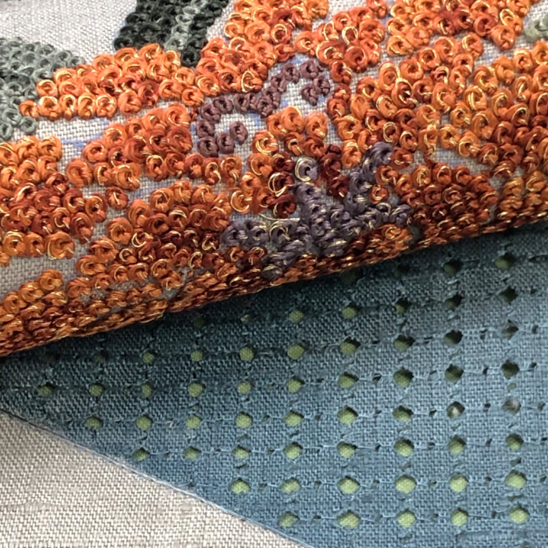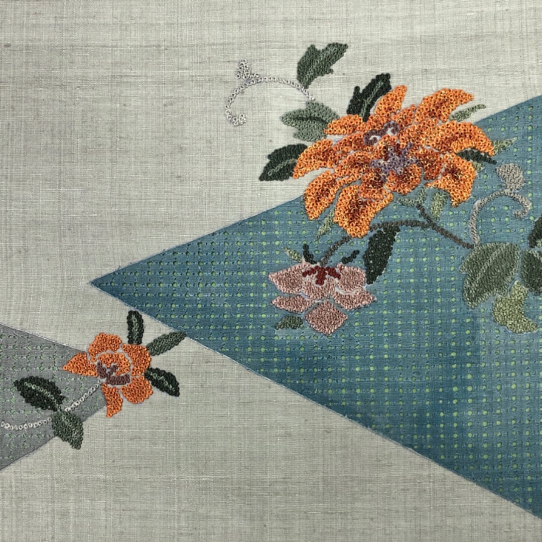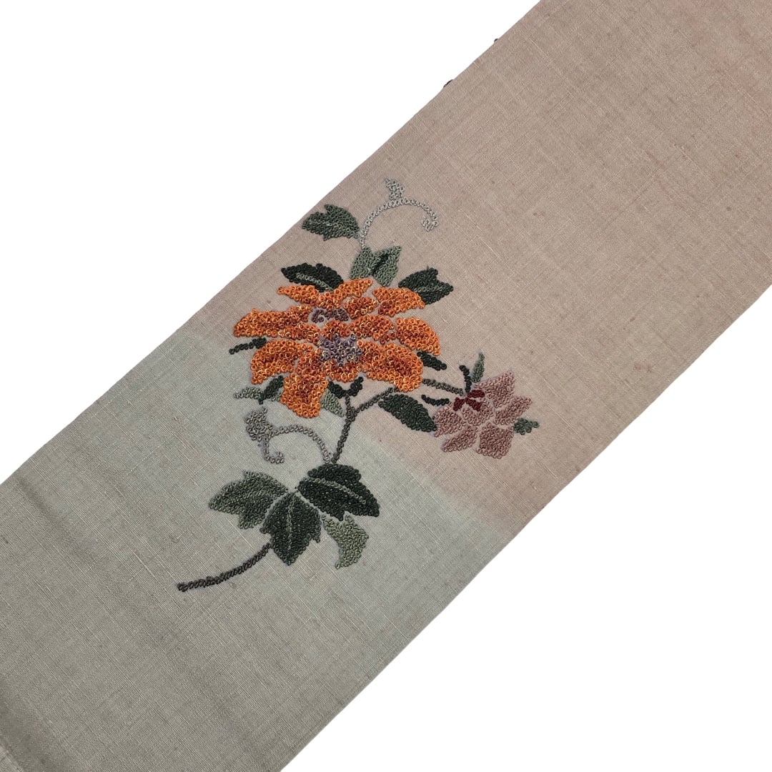 絹鼠色ベースのお色味の紬地に汕頭刺繍、相良刺繍で花柄模様がデザインされた素敵な柄裄のお品でございます。
