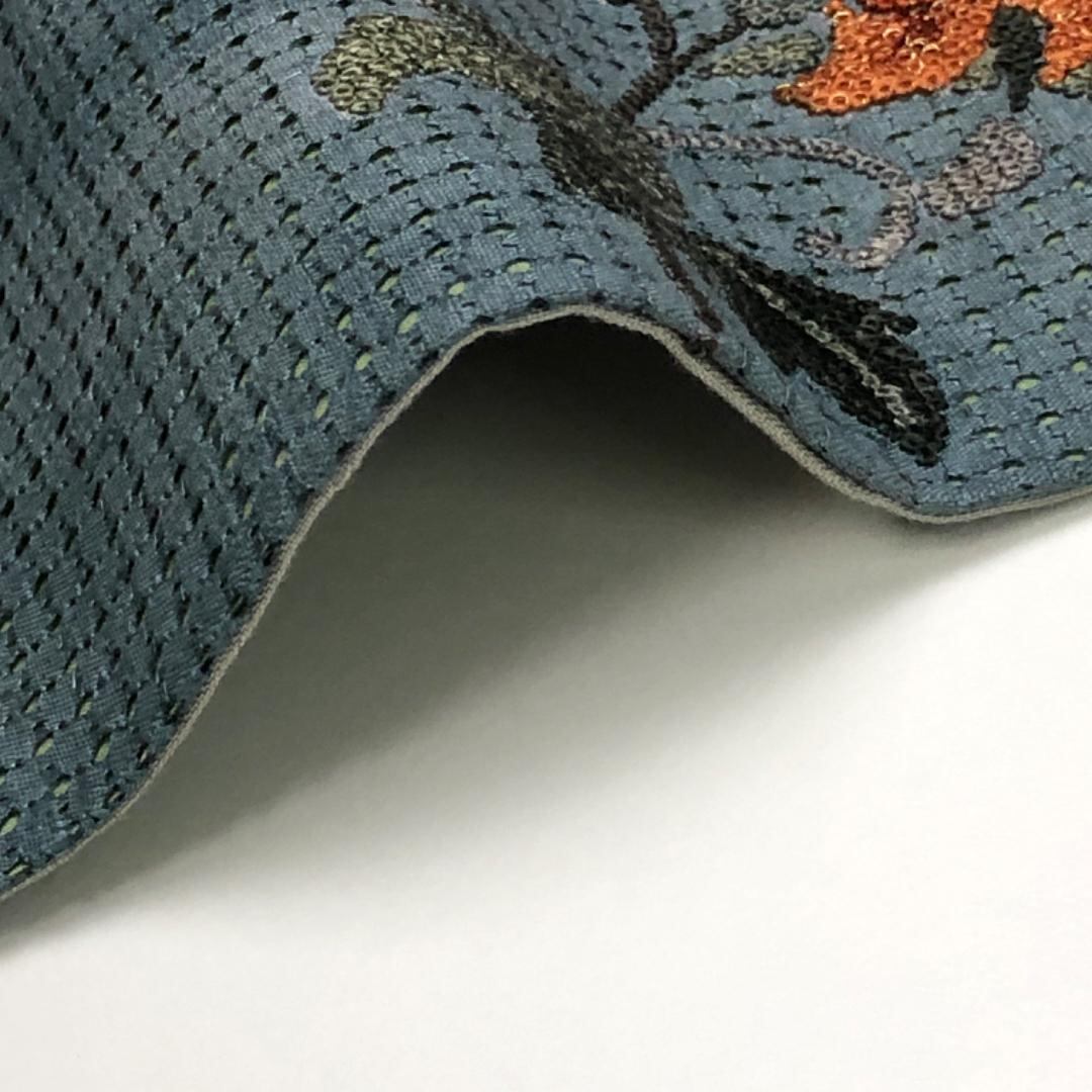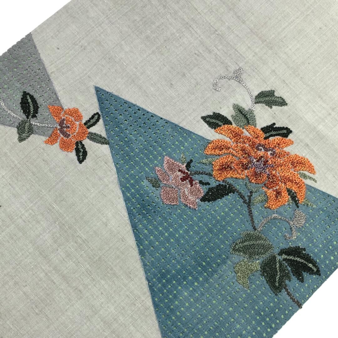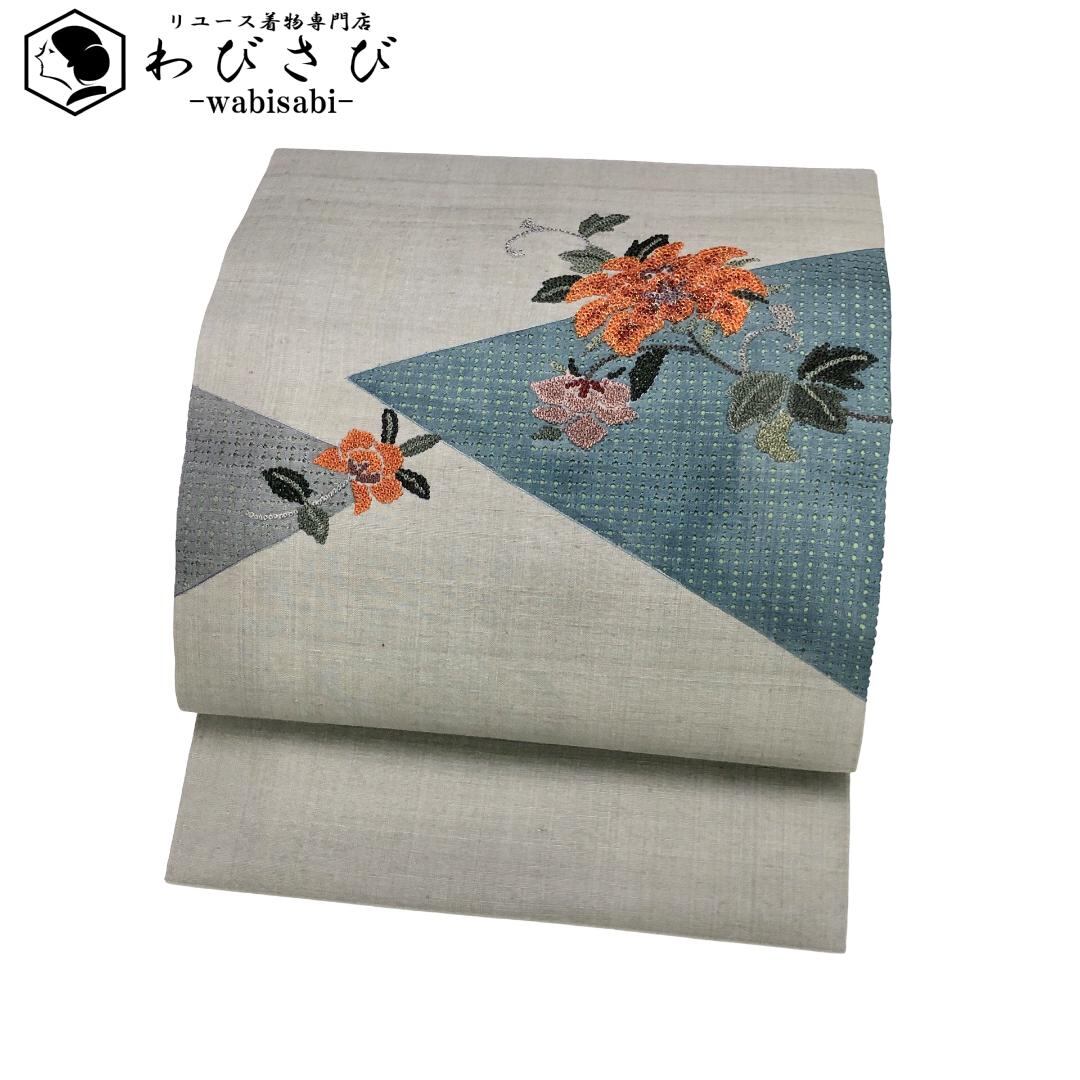 名古屋帯 紬 花柄模様 相良刺繍 汕頭刺繍 絹鼠色 O-5491 着物 きもの kimono 和服 和装 中古 リサイクル着物 【送料無料】