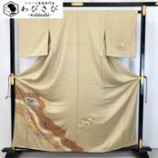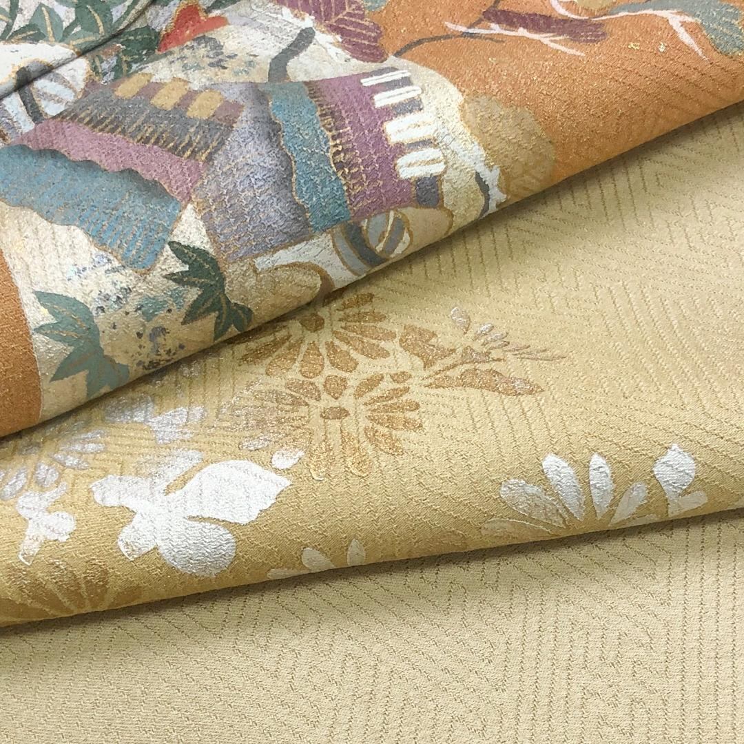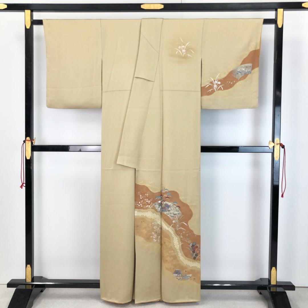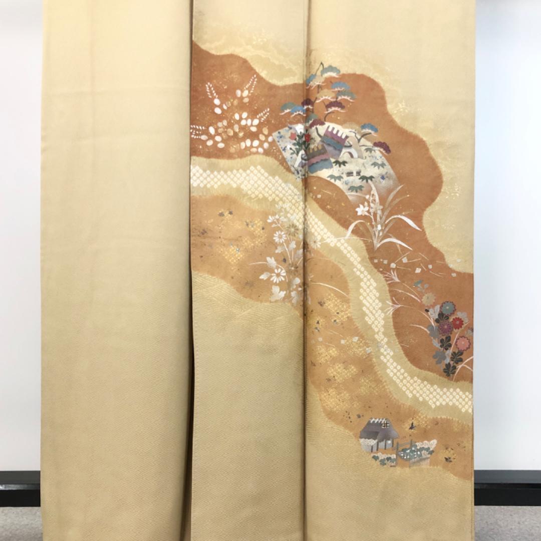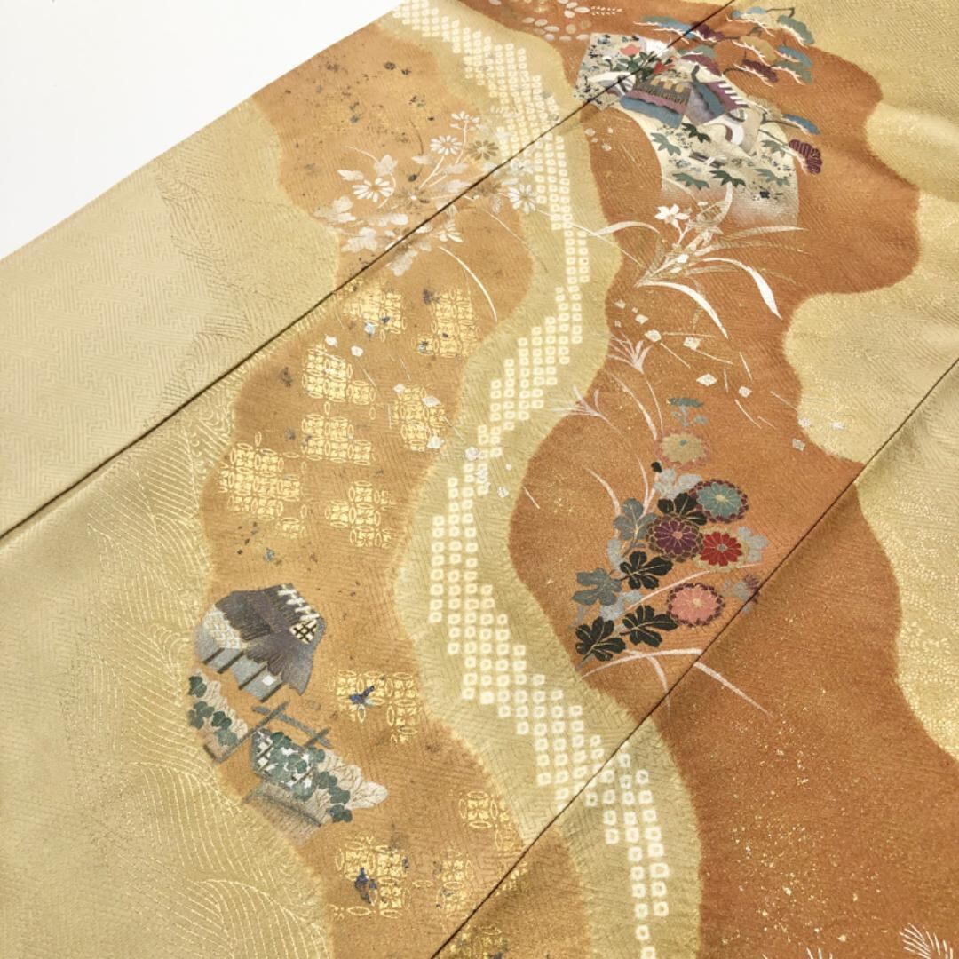 蒸栗色の品のあるお色味に波模様の地模様、花柄、舟、風景などの柄行がデザインされた素敵なお品でございます。