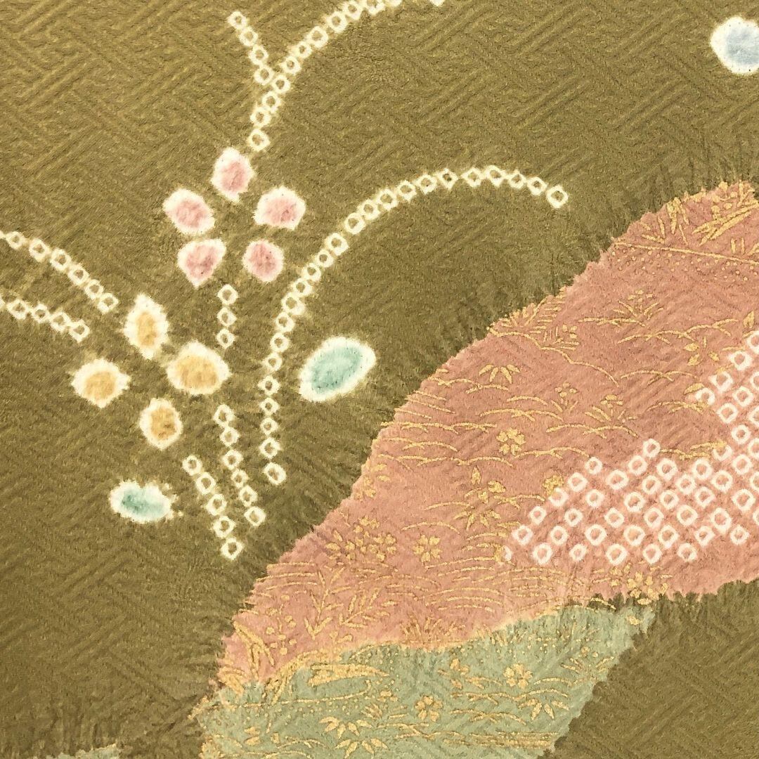 藁色のお色味に絞り、刺繍の花模様がデザインされた素敵な柄裄のお品でございます。