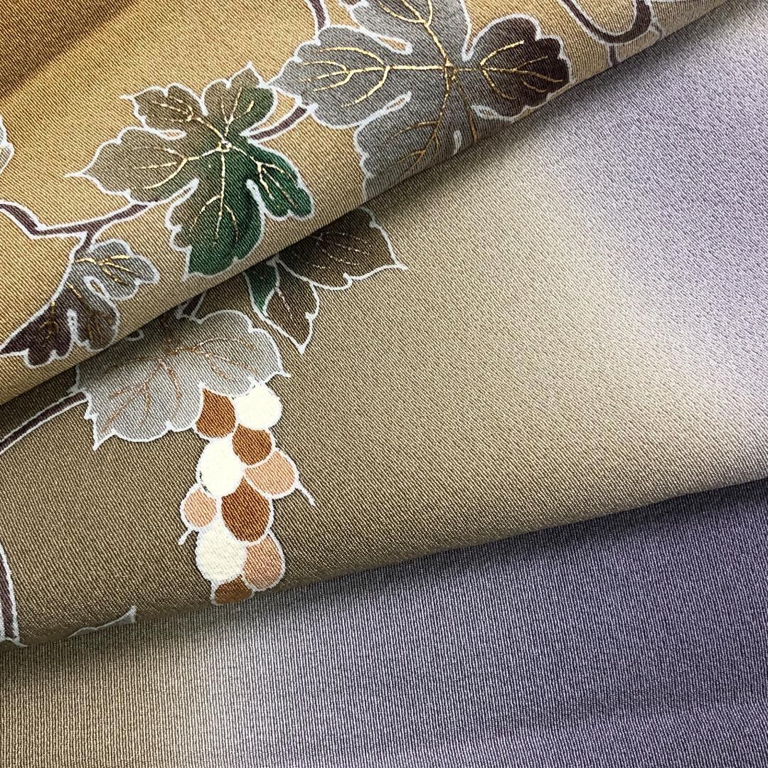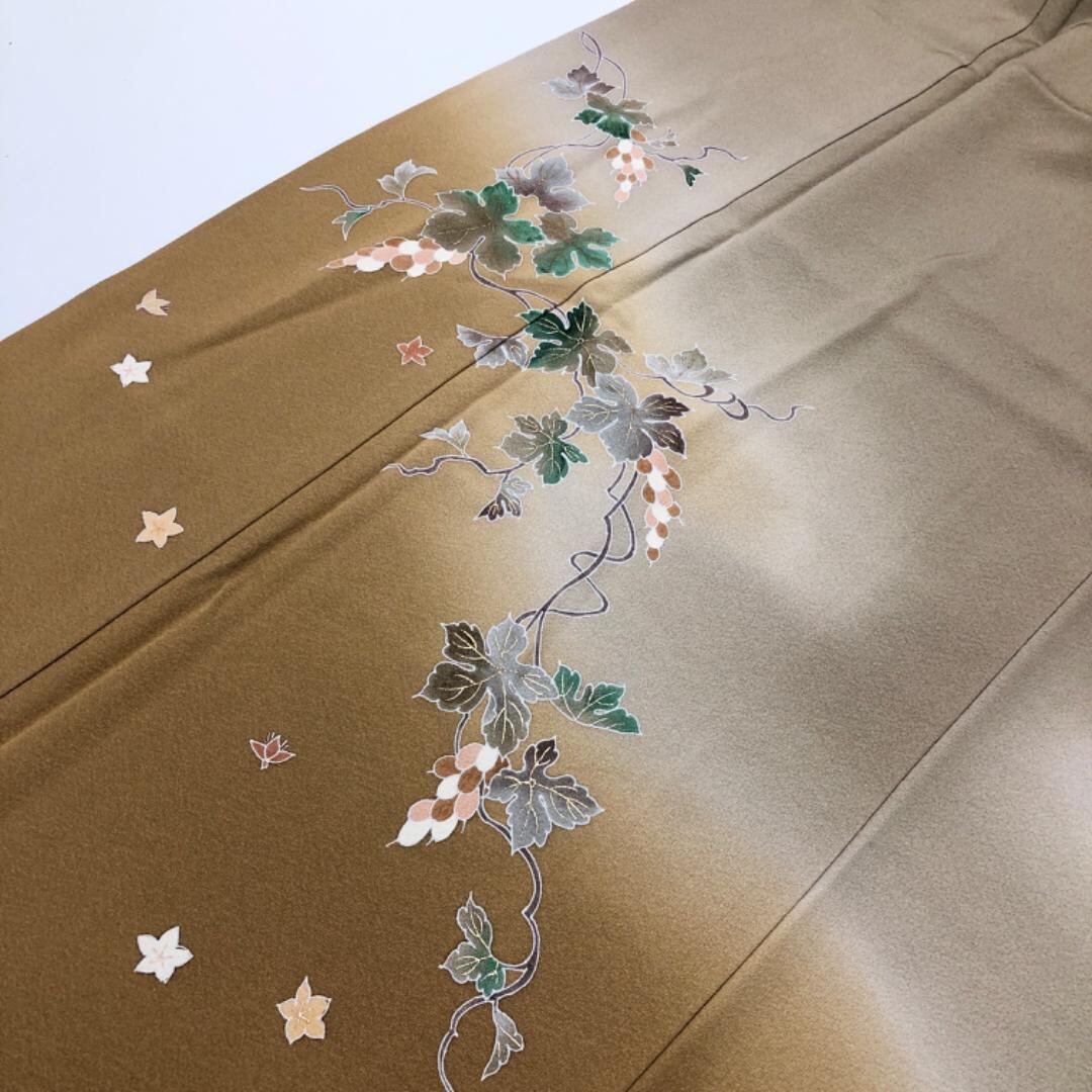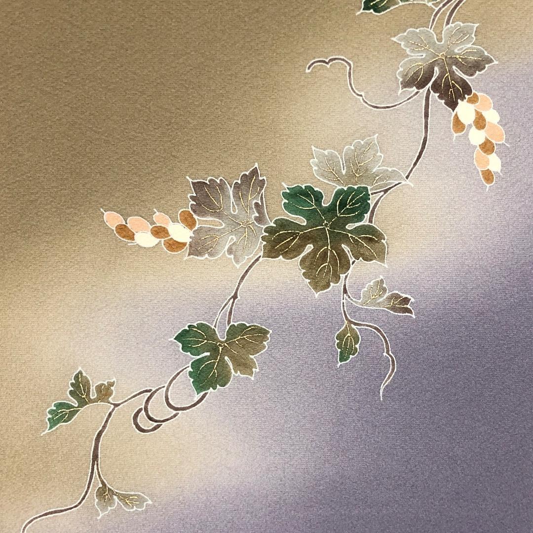 藁色ベースの染分けのお色味、花唐草葡萄の柄裄がデザインされた雰囲気の良い素敵なお品でございます。