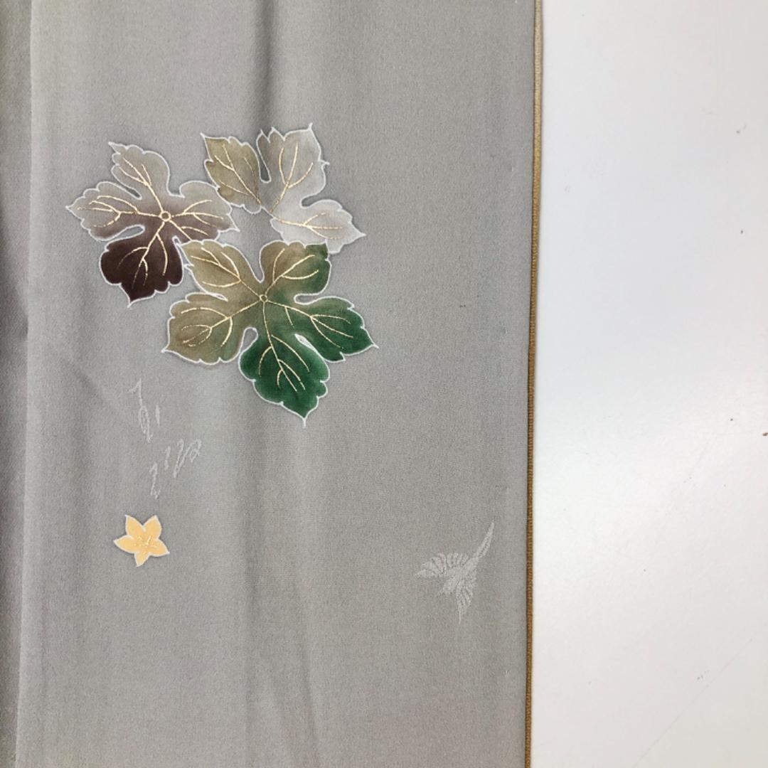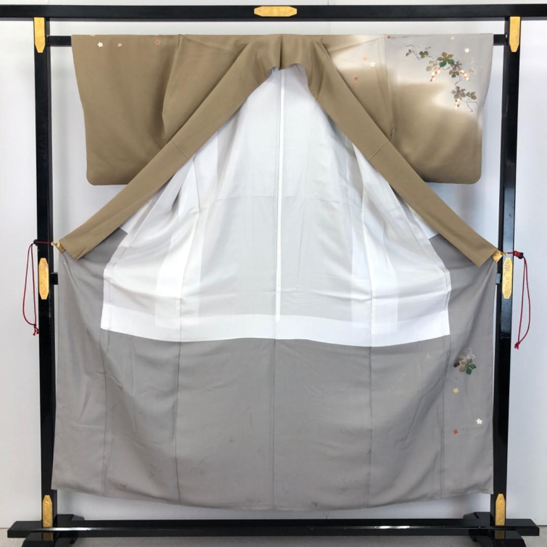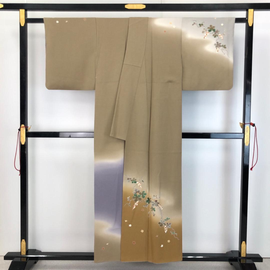 藁色ベースの染分けのお色味、花唐草葡萄の柄裄がデザインされた雰囲気の良い素敵なお品でございます。