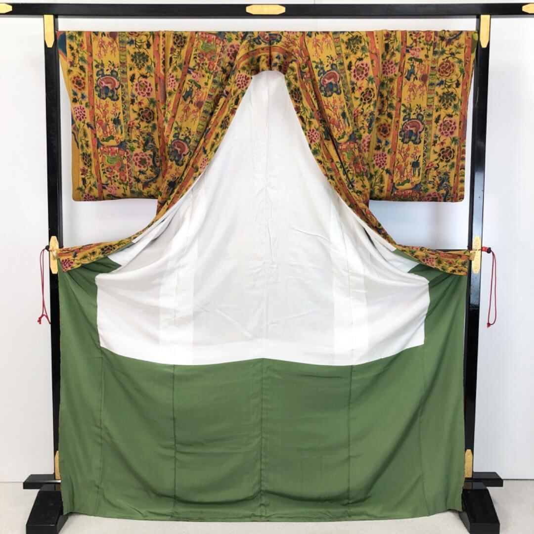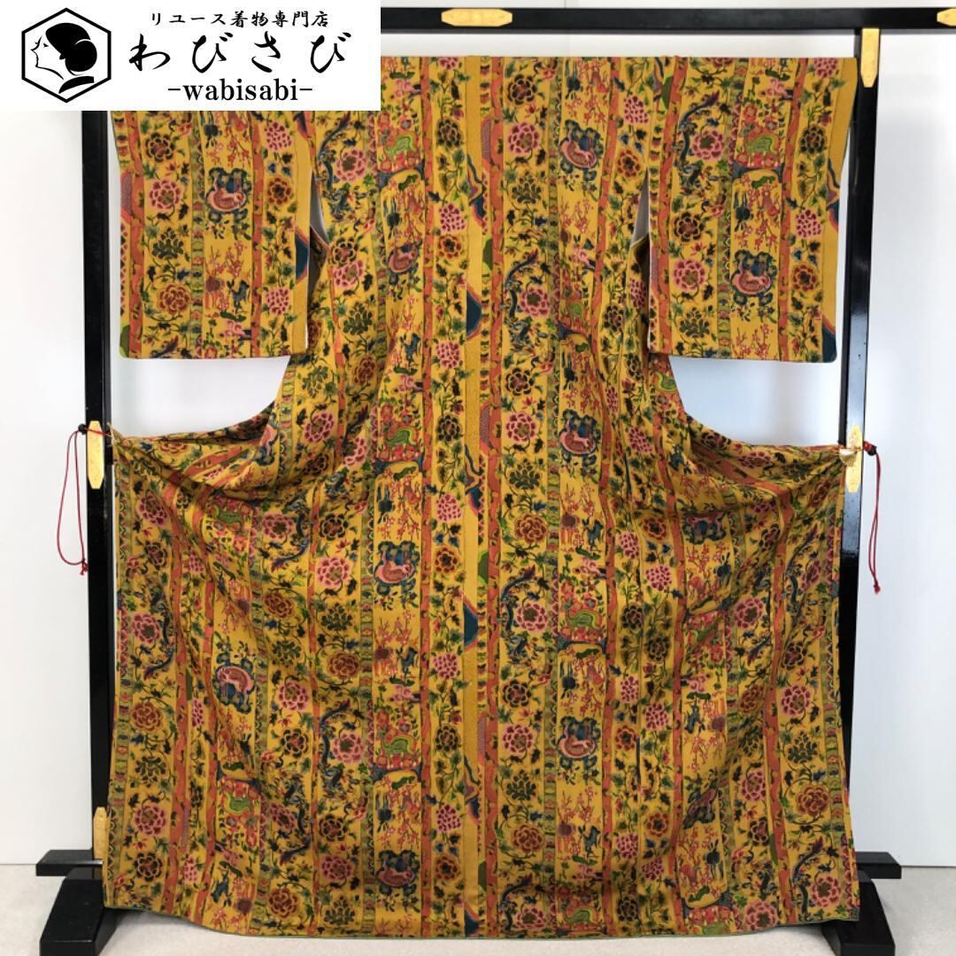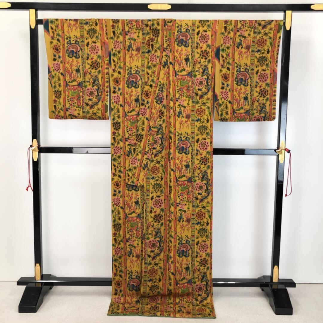 黄土色のお色味の縮緬に抽象的な動物、花柄模様などがデザインされた独創的な雰囲気の素敵な柄裄のお品でございます。
