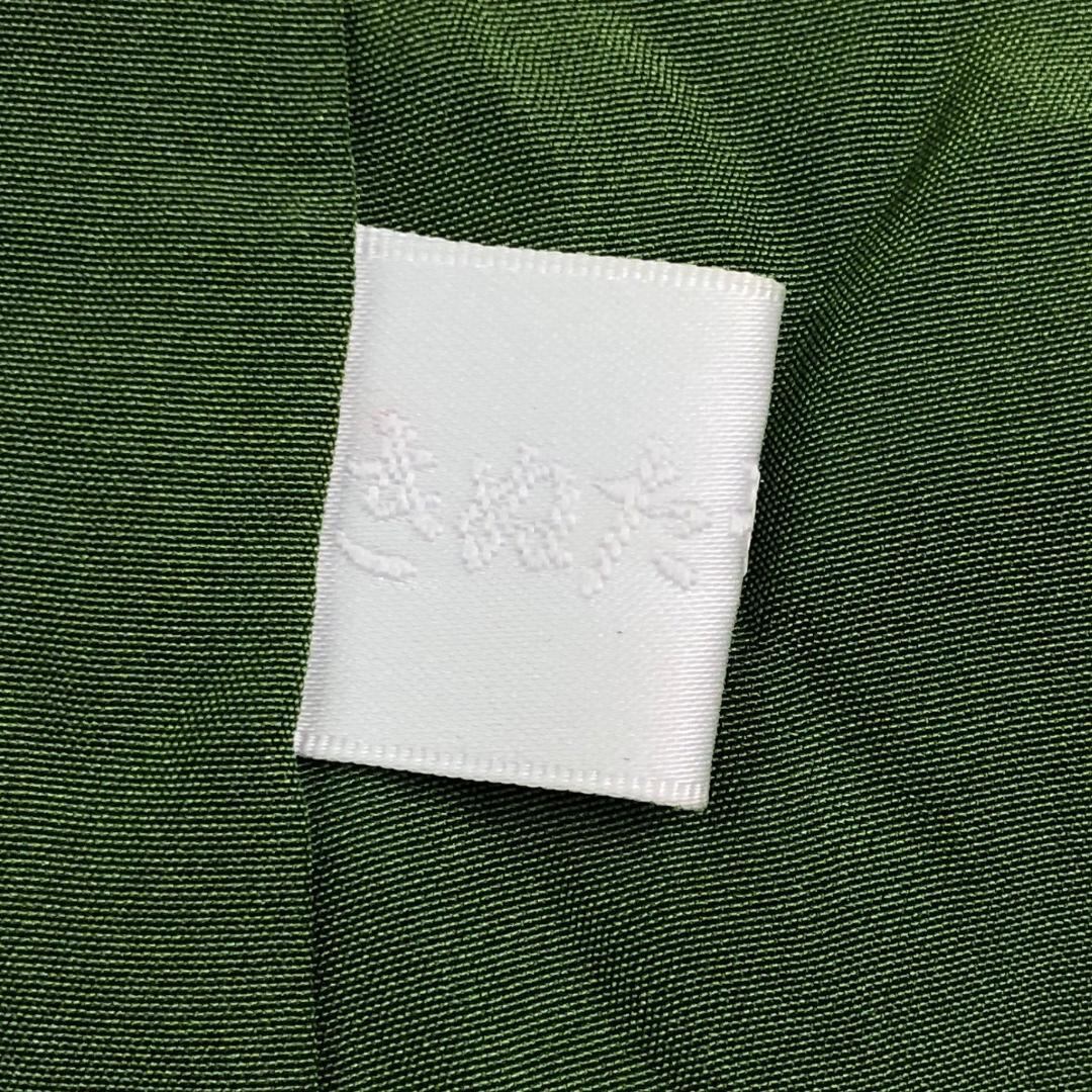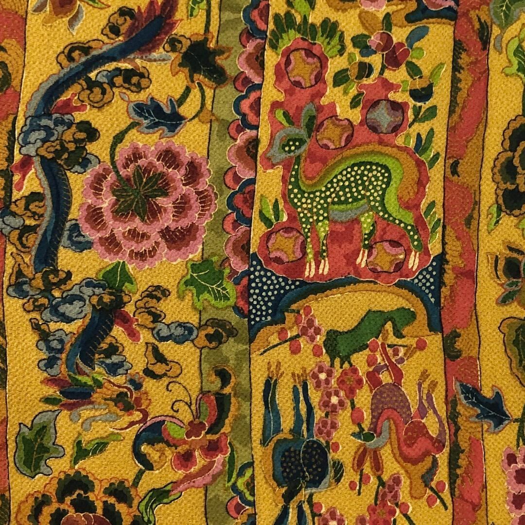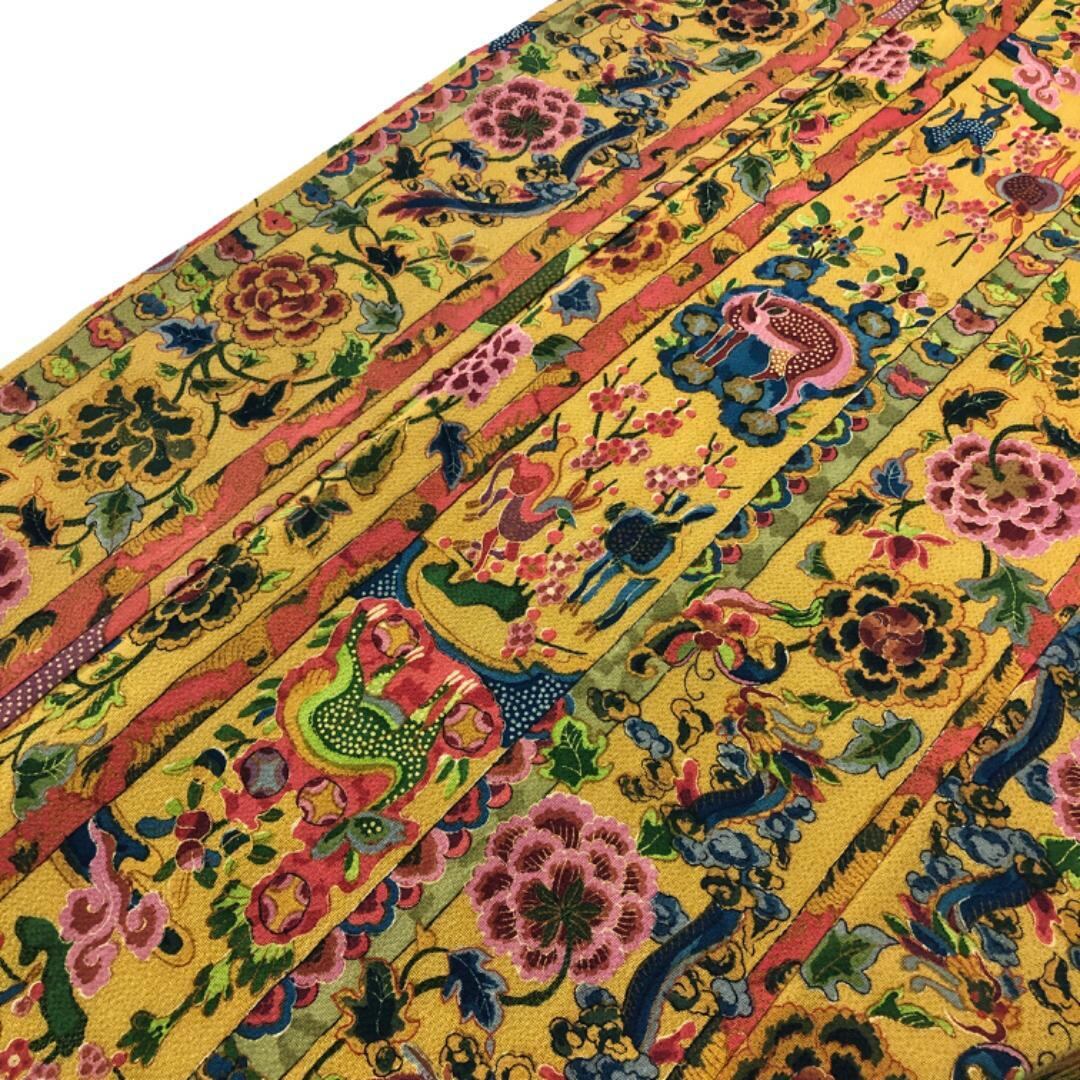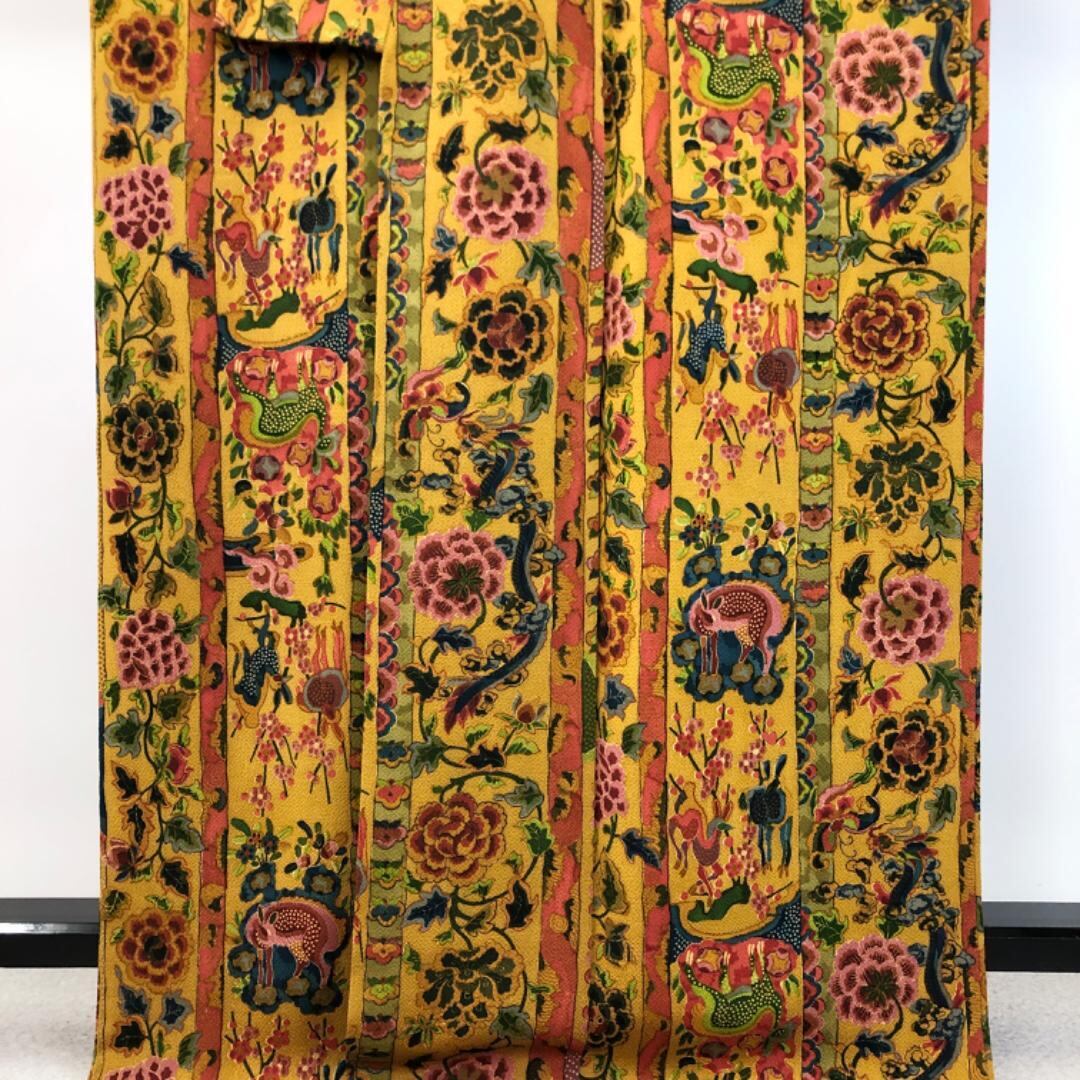 黄土色のお色味の縮緬に抽象的な動物、花柄模様などがデザインされた独創的な雰囲気の素敵な柄裄のお品でございます。