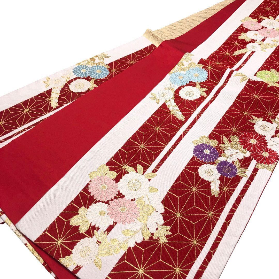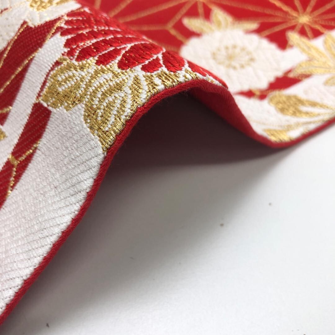赤色のお色味に麻の葉模様、菊の花がデザインされた素敵なお品でございます。
