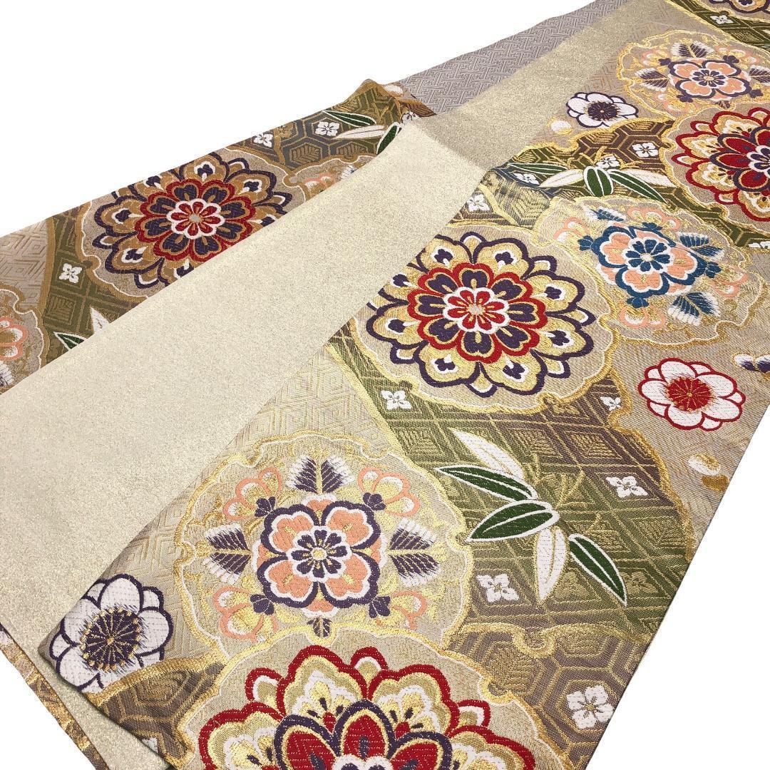 生成色のお色味に雪輪、美しい華柄模様がデザインされた素敵な柄裄のお品でございます。