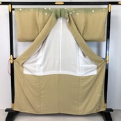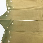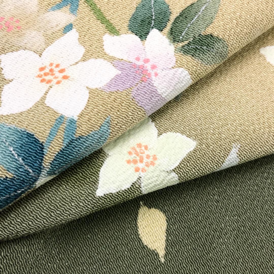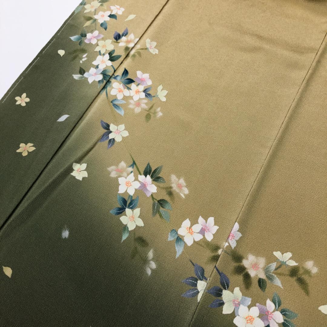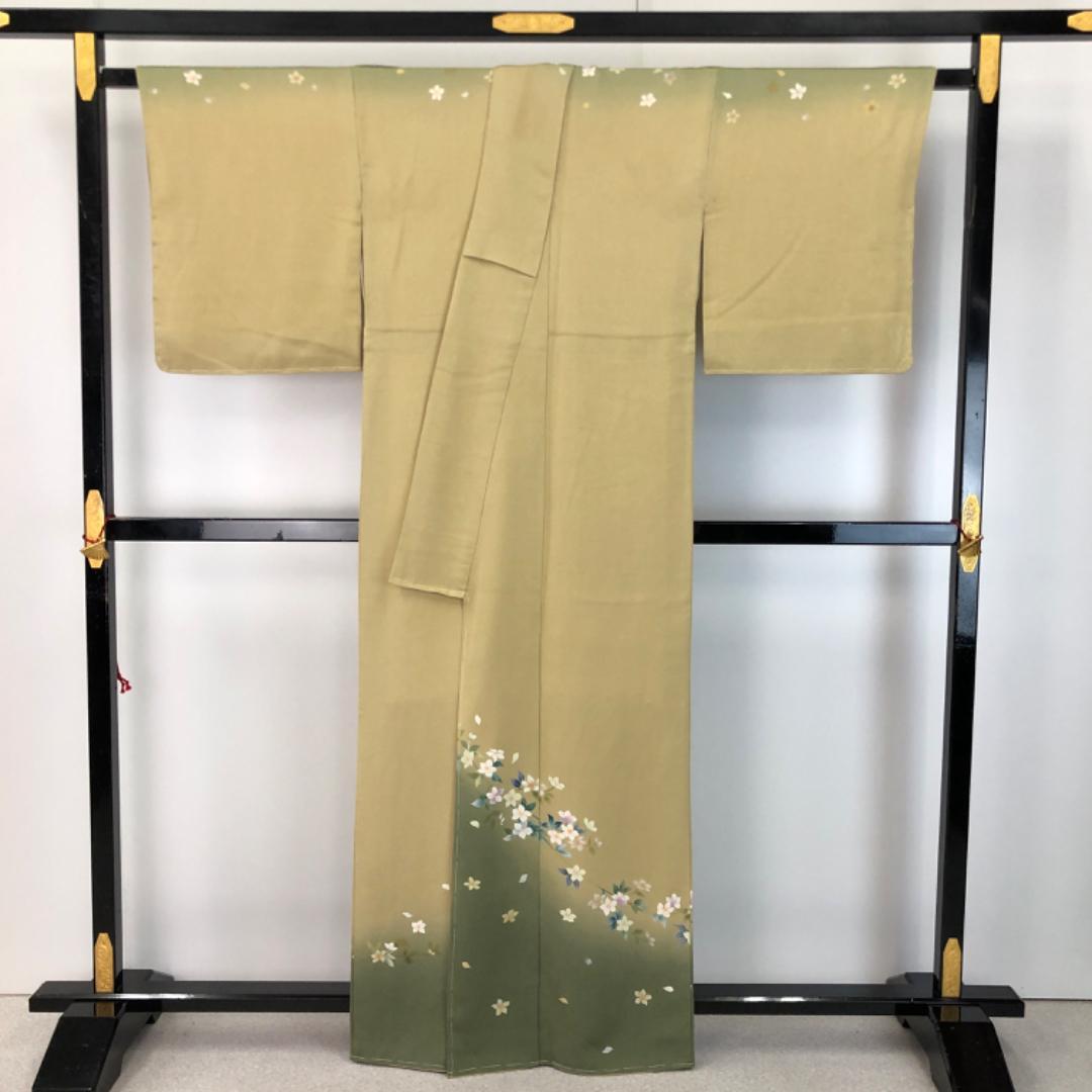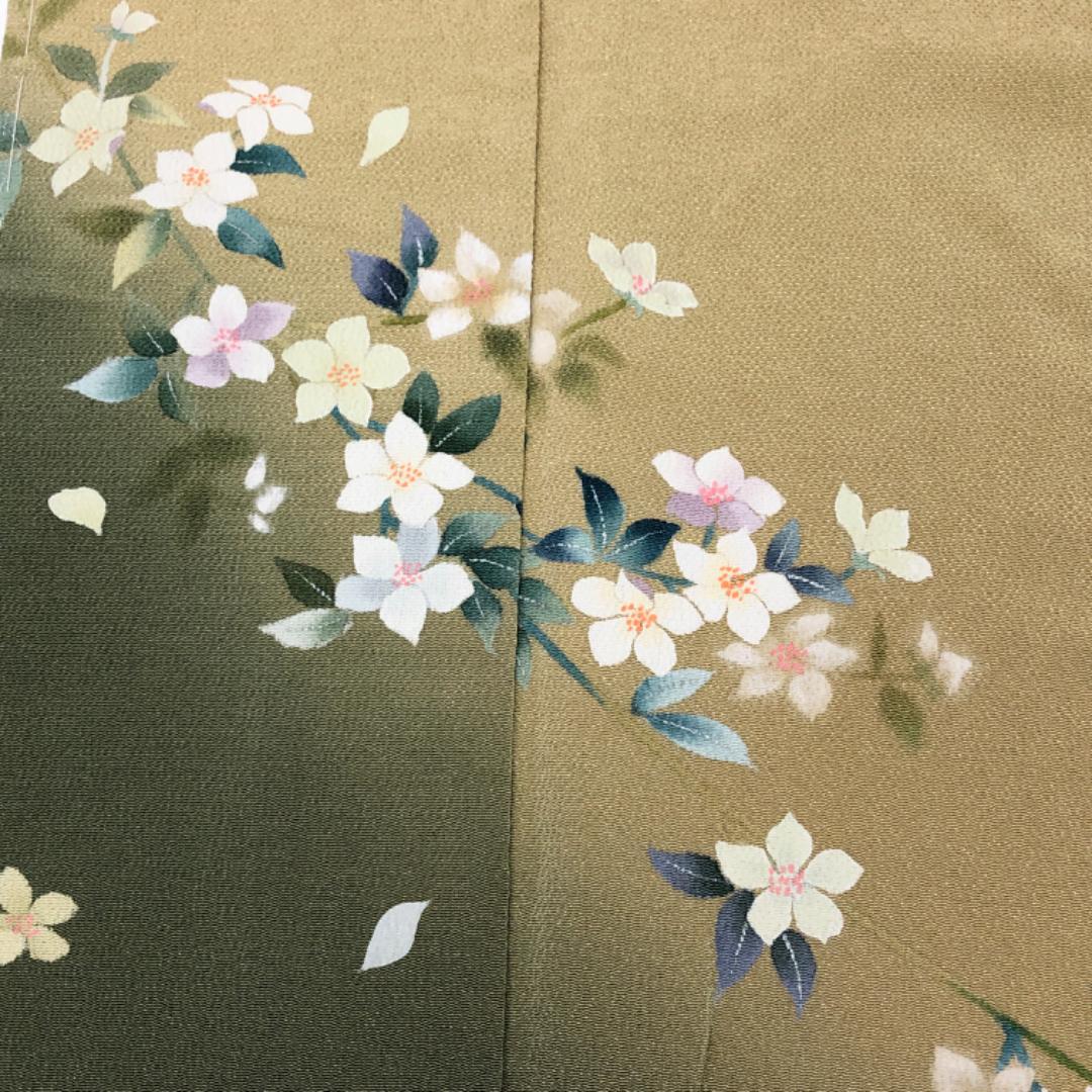 黄土色のお色味に暈し、上品な花模様の柄裄がデザインされた素敵なお品でございます。