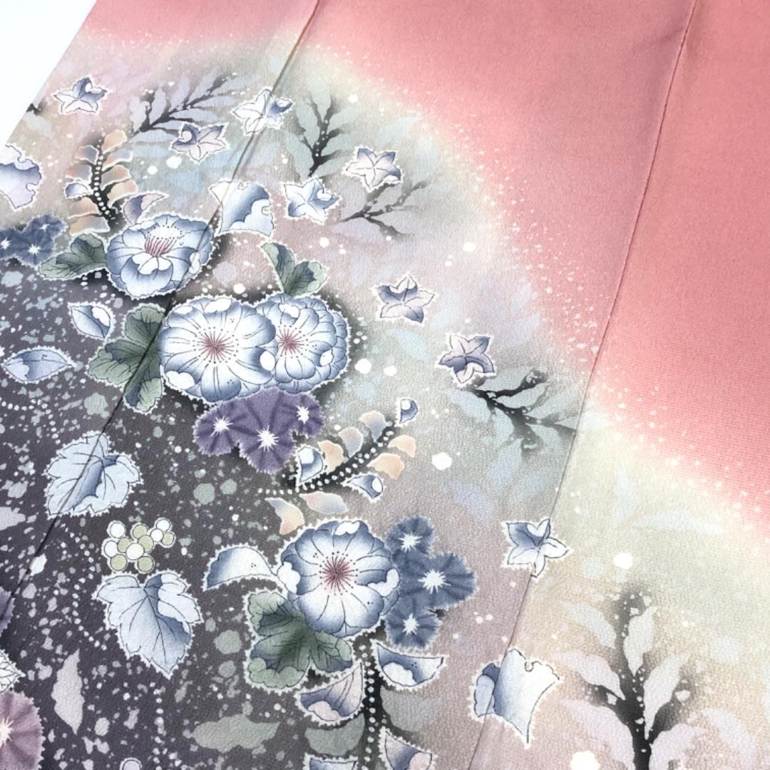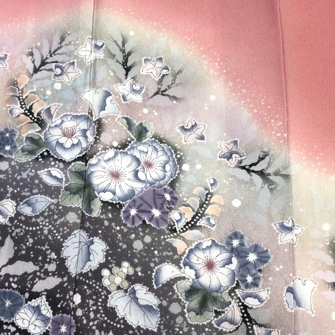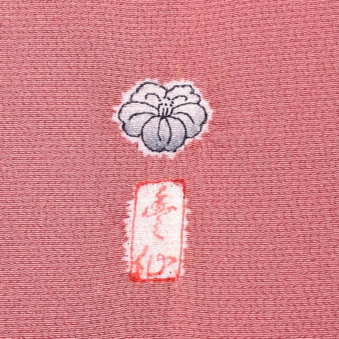 桃紅色のお色味に美しい辻が花絞りの柄行がデザインされた雰囲気の良い素敵なお品でございます。