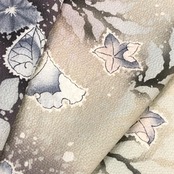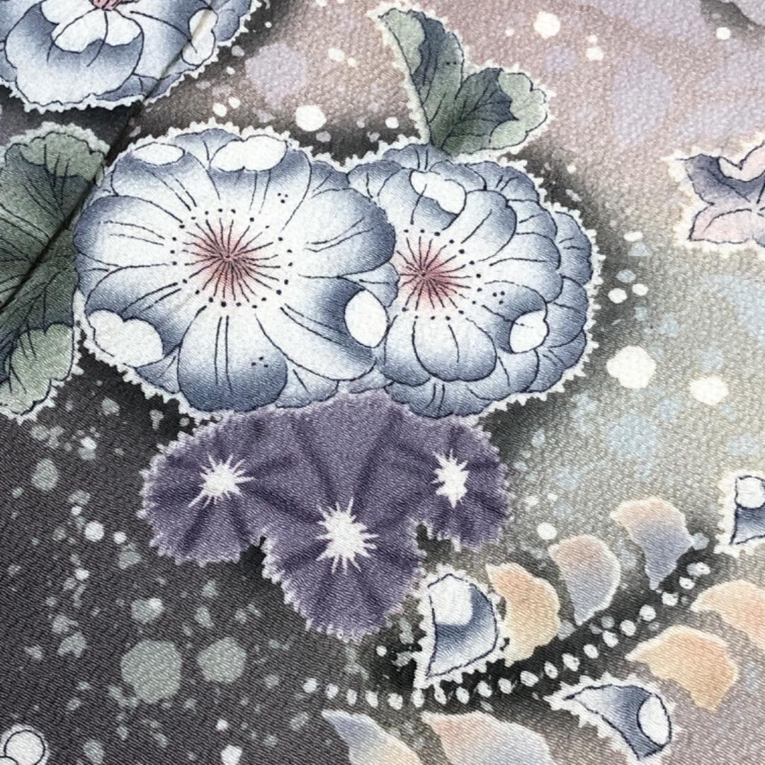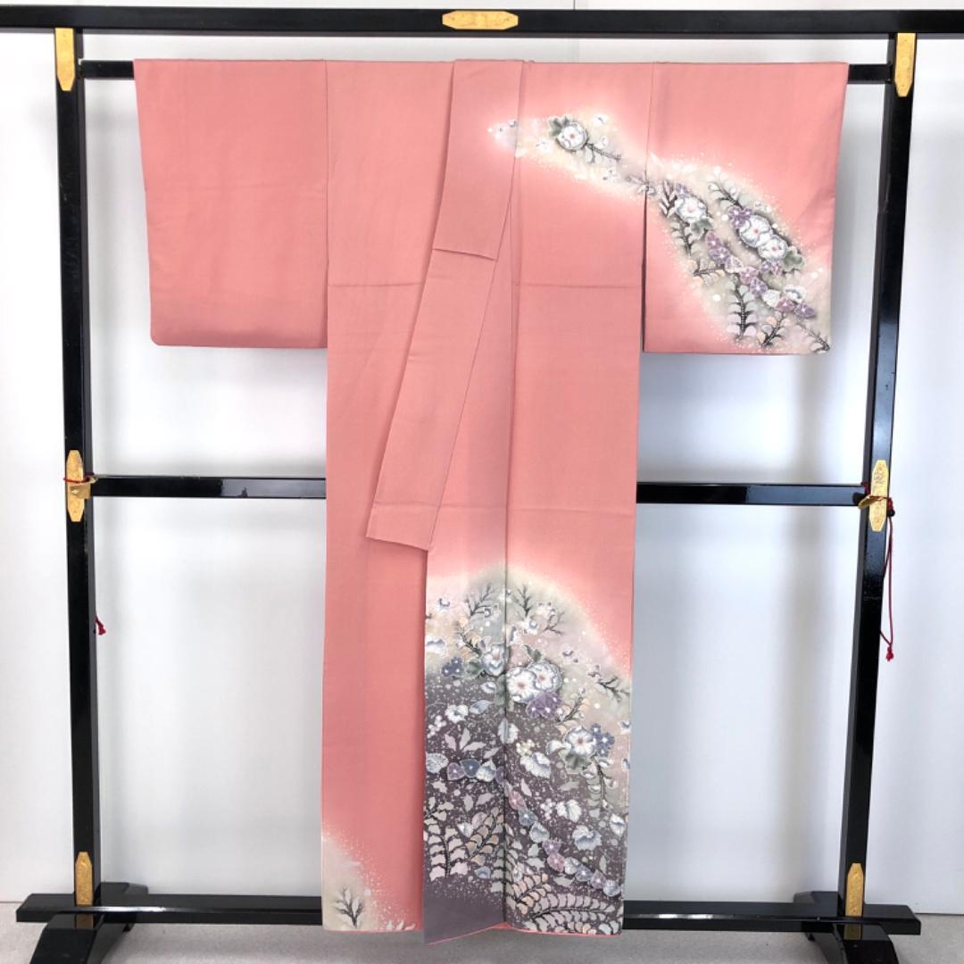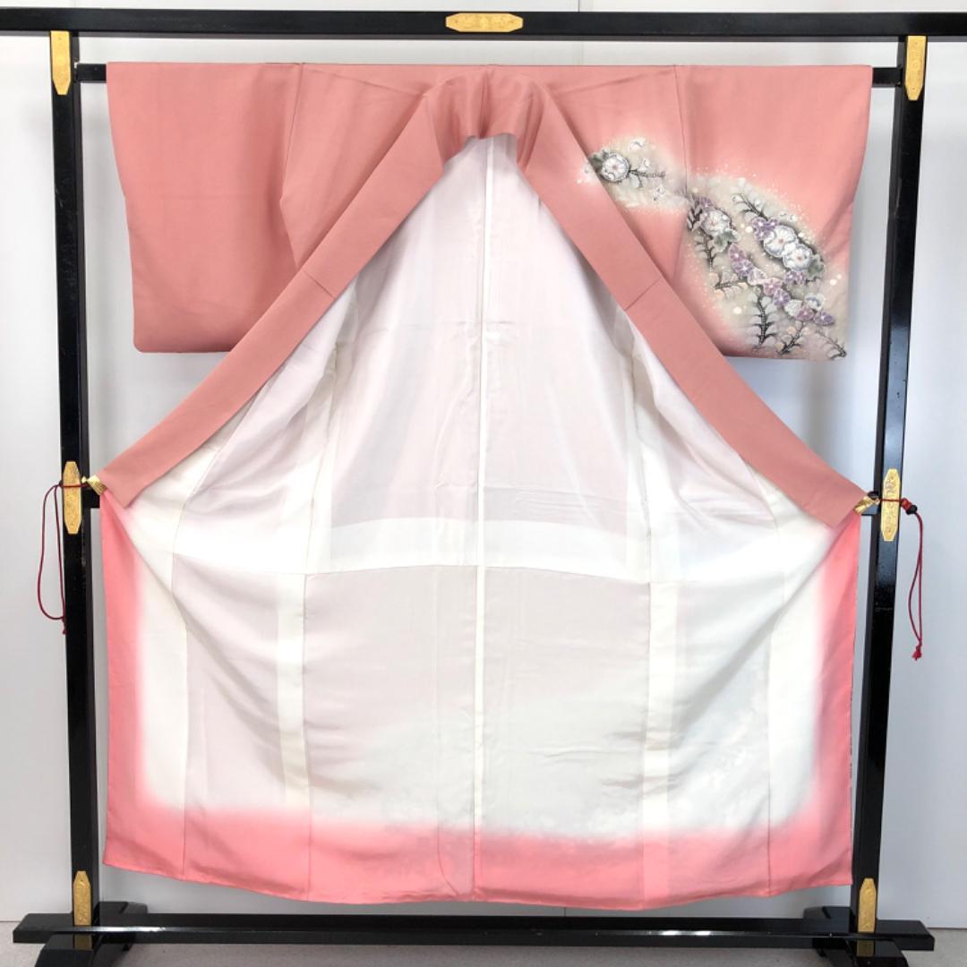 桃紅色のお色味に美しい辻が花絞りの柄行がデザインされた雰囲気の良い素敵なお品でございます。