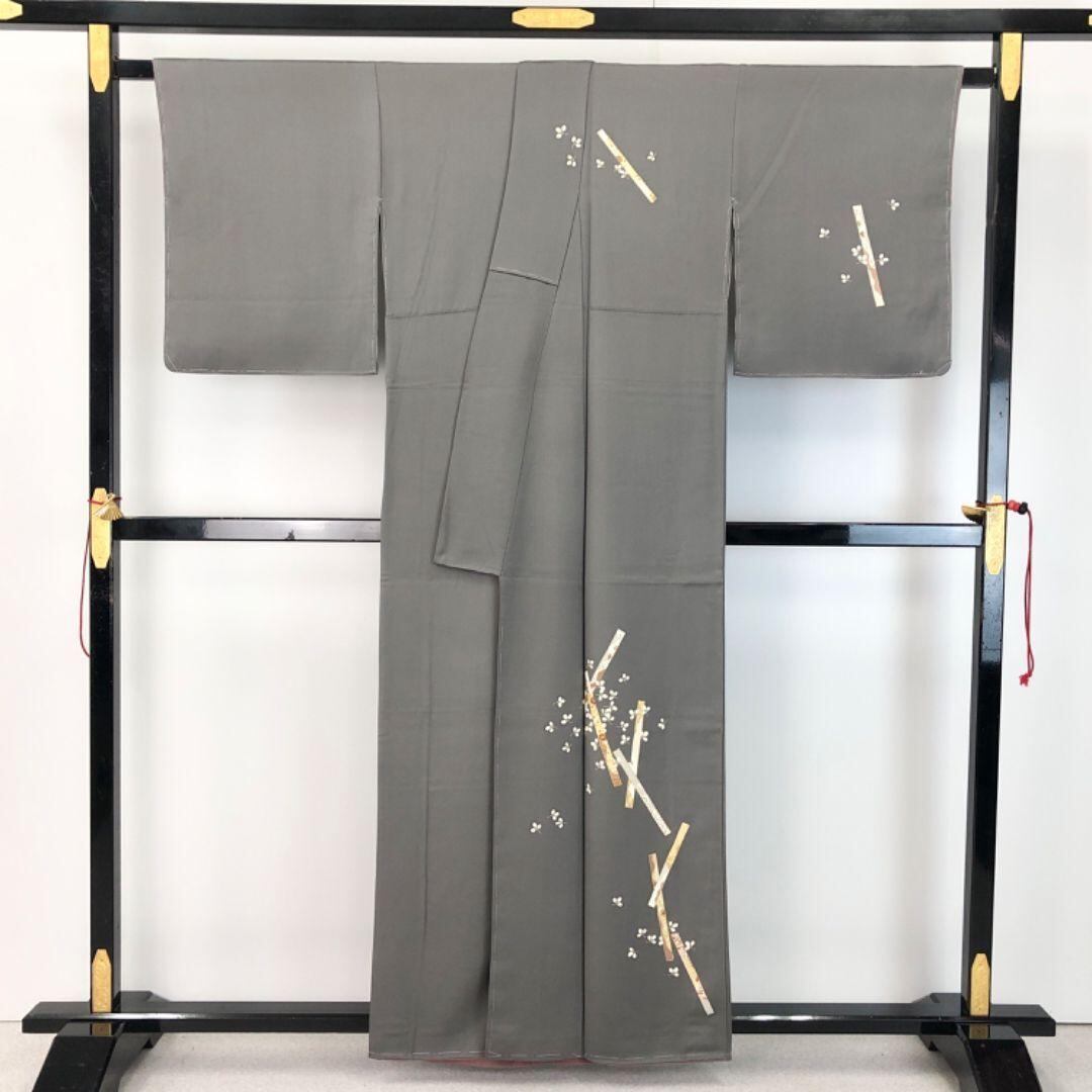 付下げ 四角に花模様 金駒刺繍 濃灰色 K-5353 着物 きもの kimono 和服 和装 中古 リサイクル着物 【送料無料】