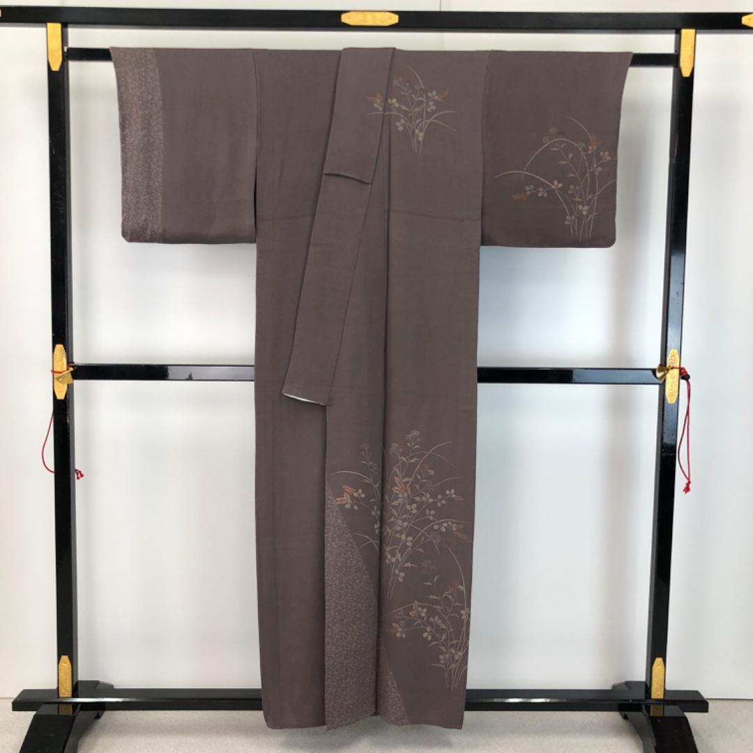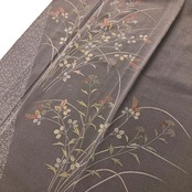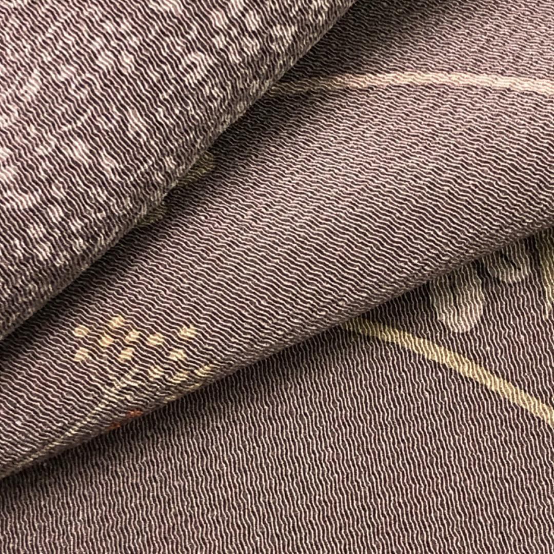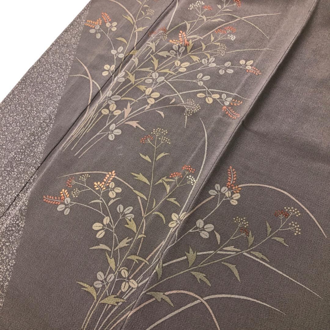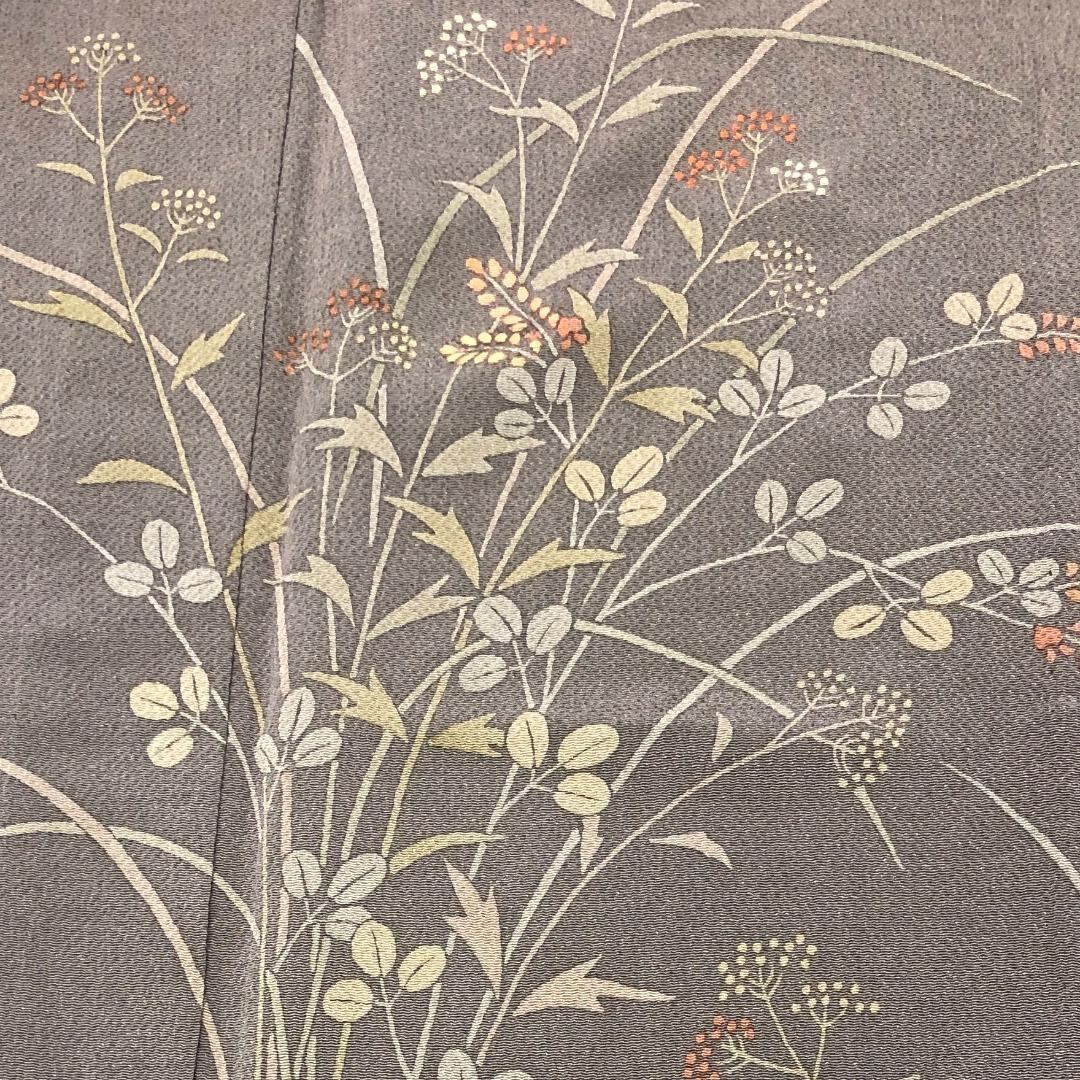栗鼠色の落ち着きのあるお色味の縮緬地に萩の花模様がデザインされた素敵なお品でございます。