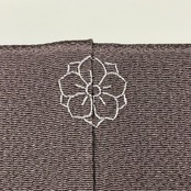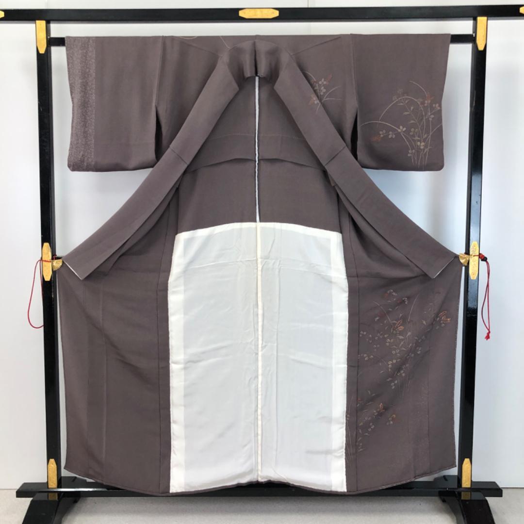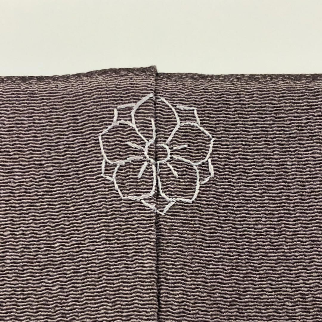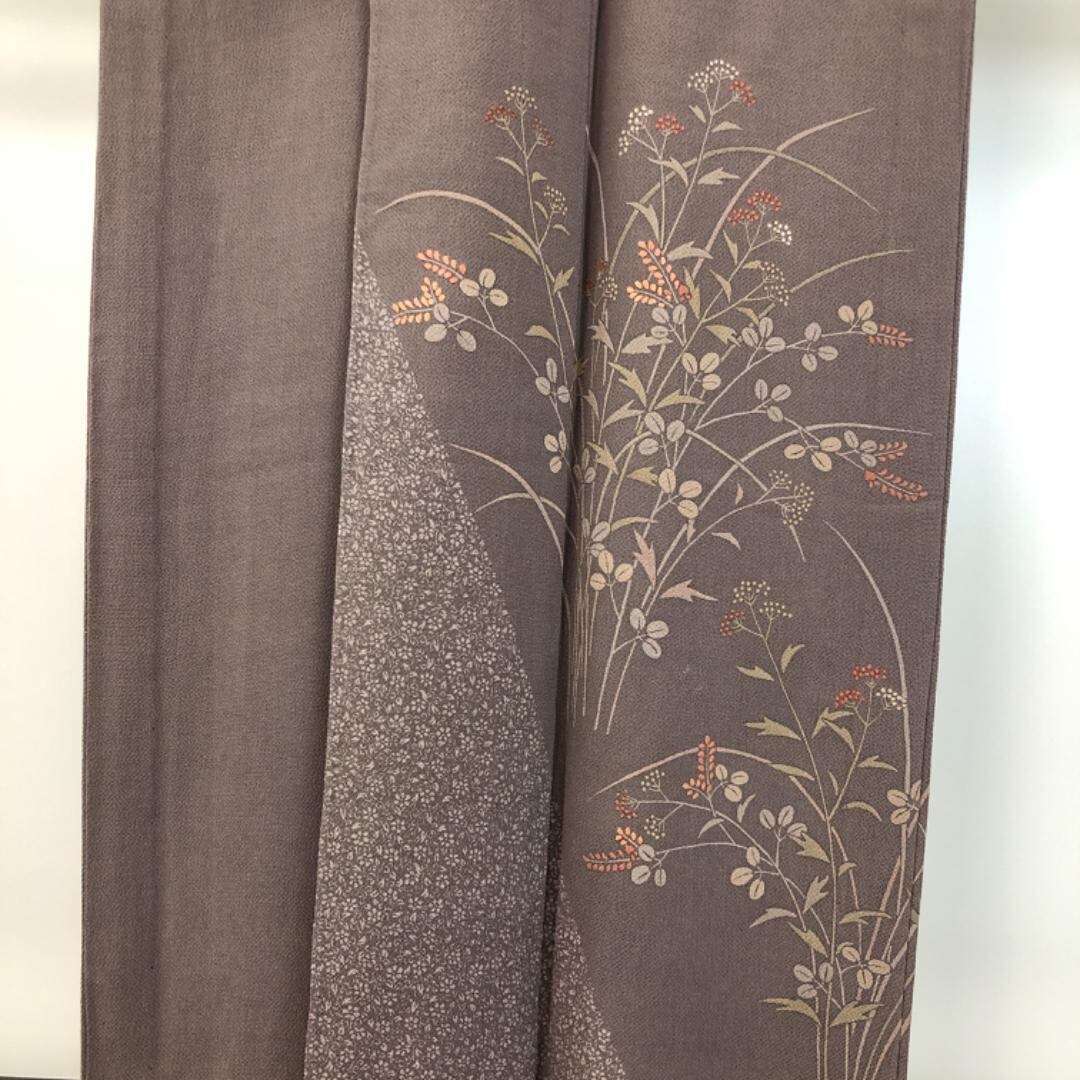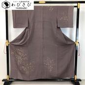 栗鼠色の落ち着きのあるお色味の縮緬地に萩の花模様がデザインされた素敵なお品でございます。
