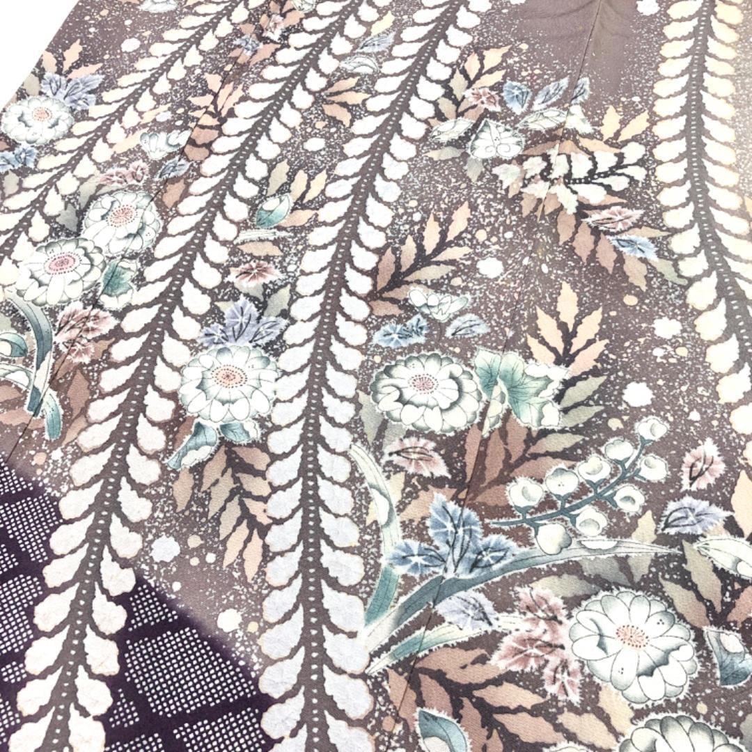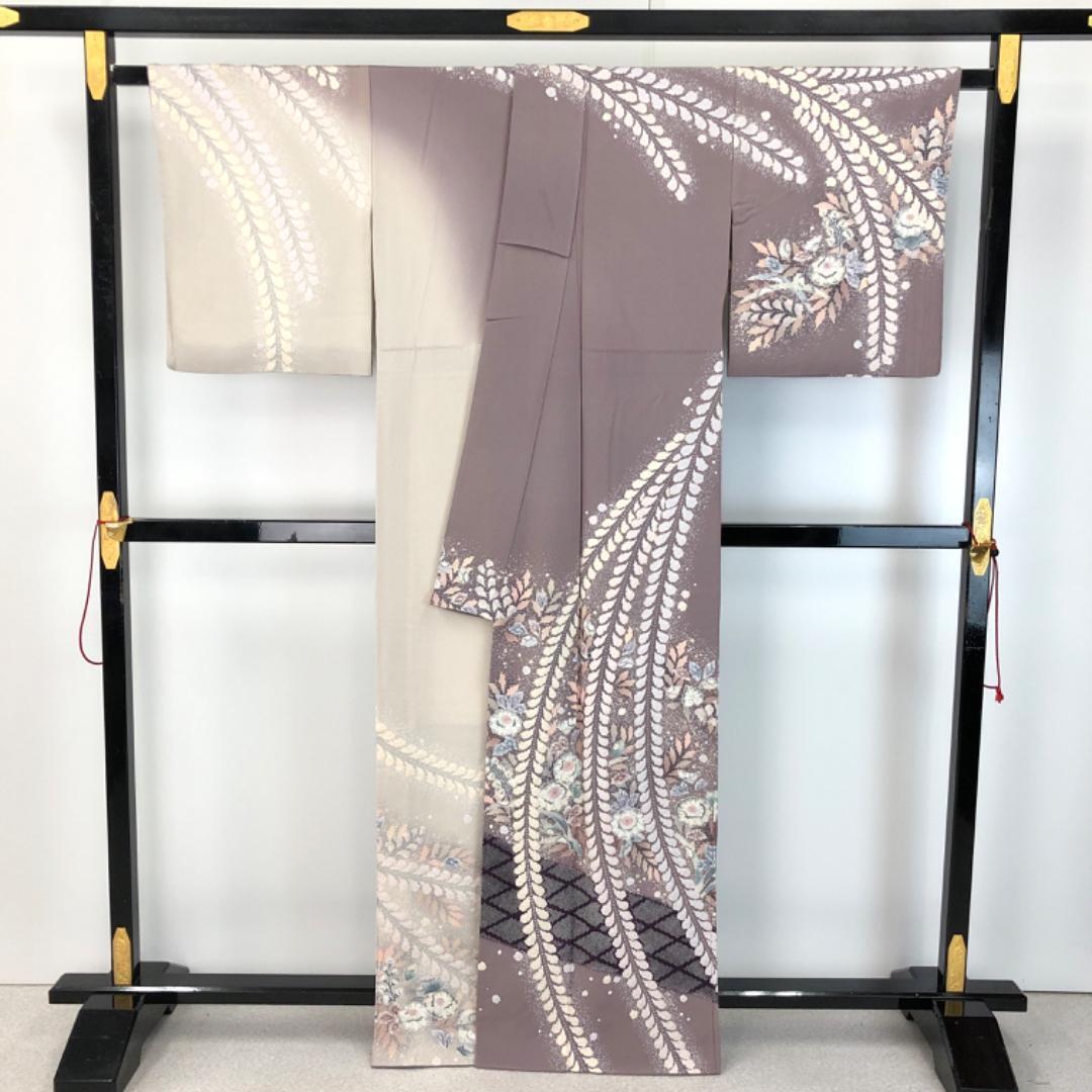 鳩羽色ベースの上品なお色味に美しい辻が花絞りがデザインされた雰囲気の良い素敵な柄裄のお品でございます。