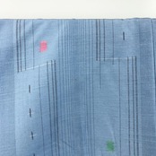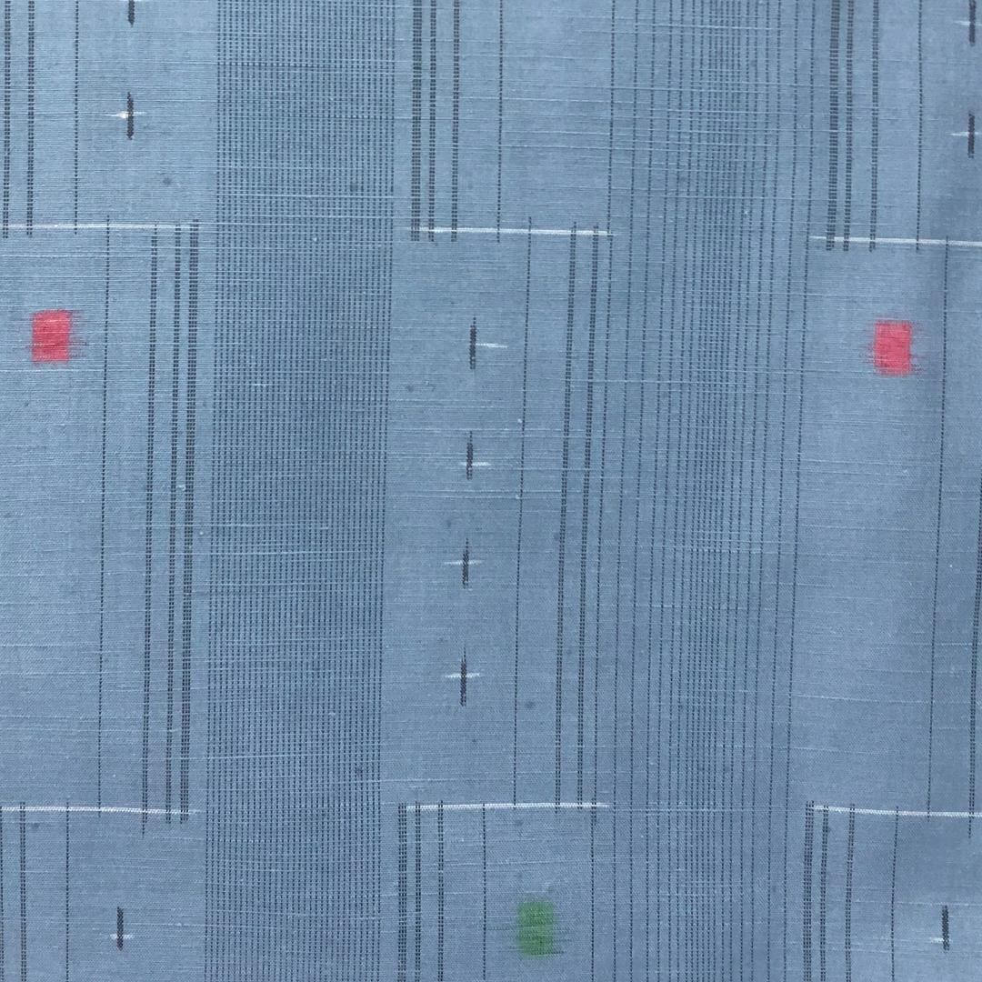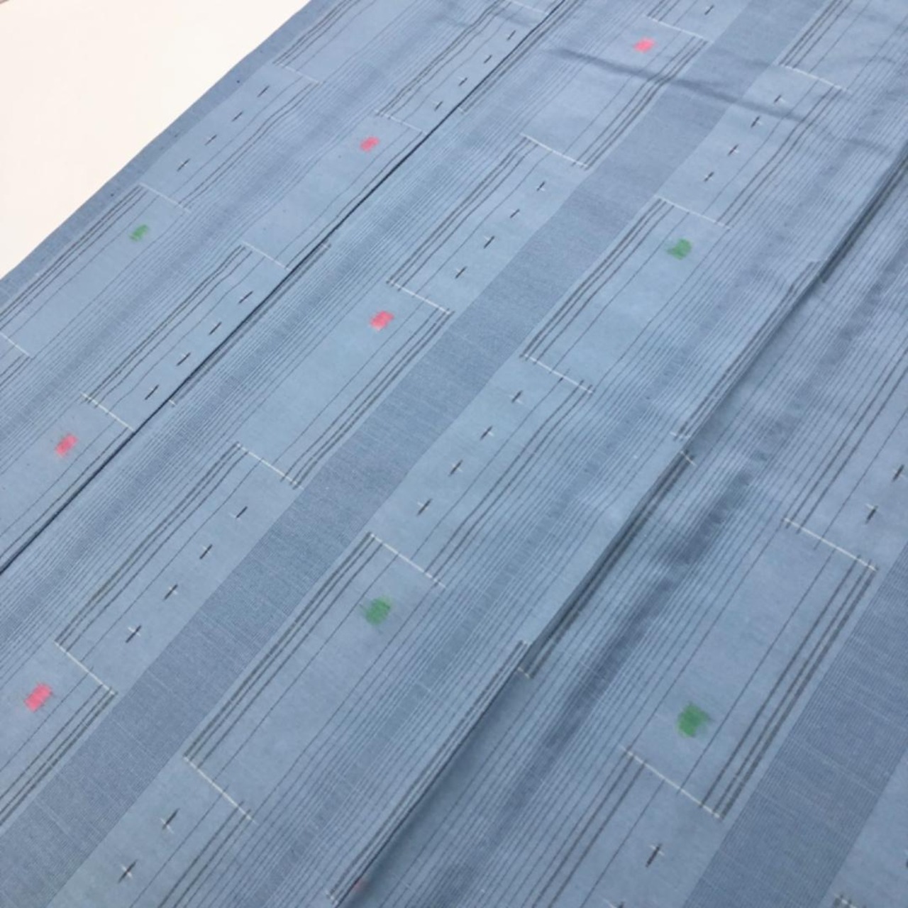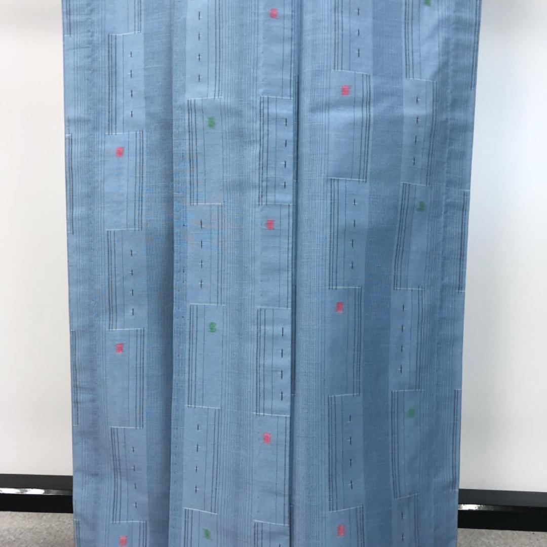 勿忘草色のお色味に縦縞模様、四角柄がデザインされた素敵なお品でございます。