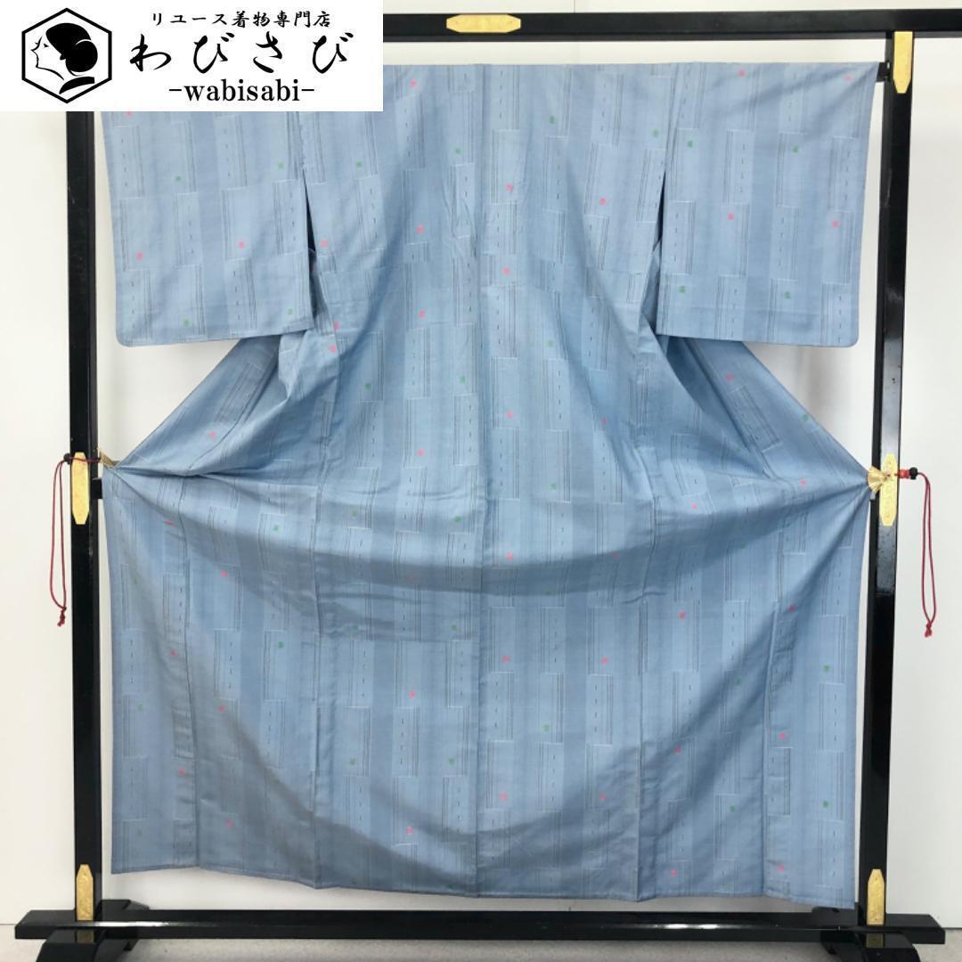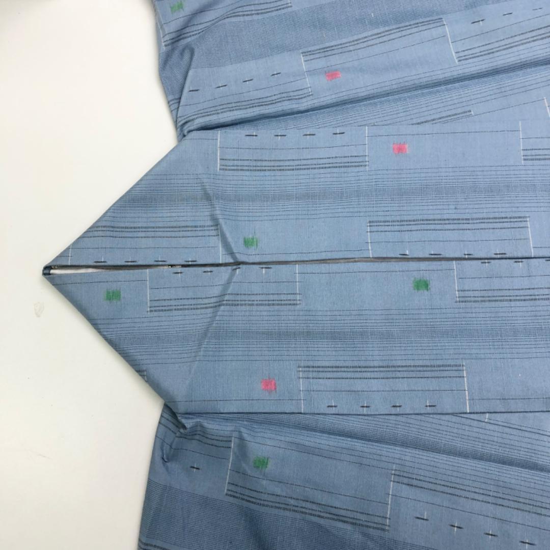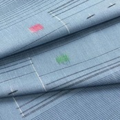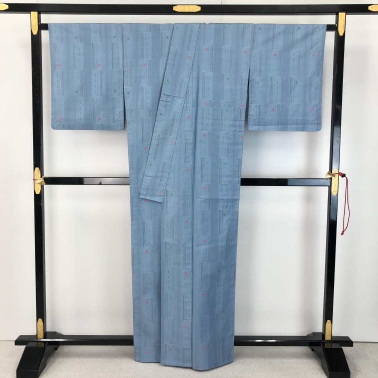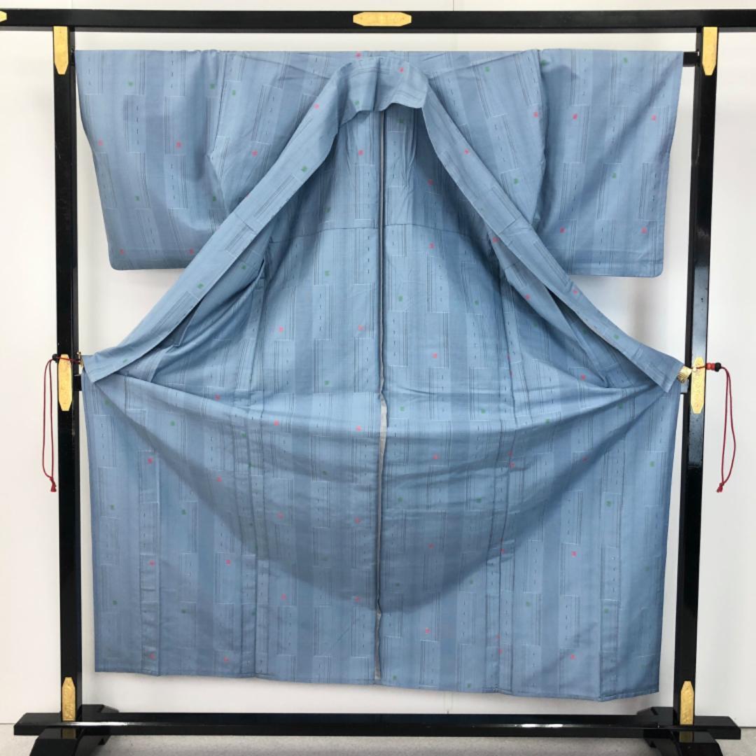 勿忘草色のお色味に縦縞模様、四角柄がデザインされた素敵なお品でございます。