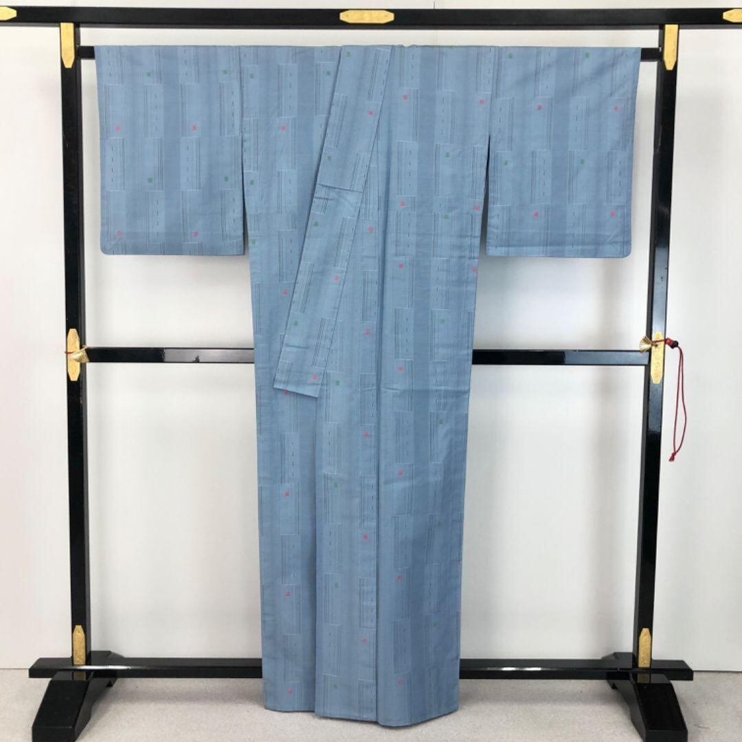 単衣 紬着物 縦縞模様 四角柄 勿忘草色 K-5365 着物 きもの kimono 和服 和装 中古 リサイクル着物 【送料無料】