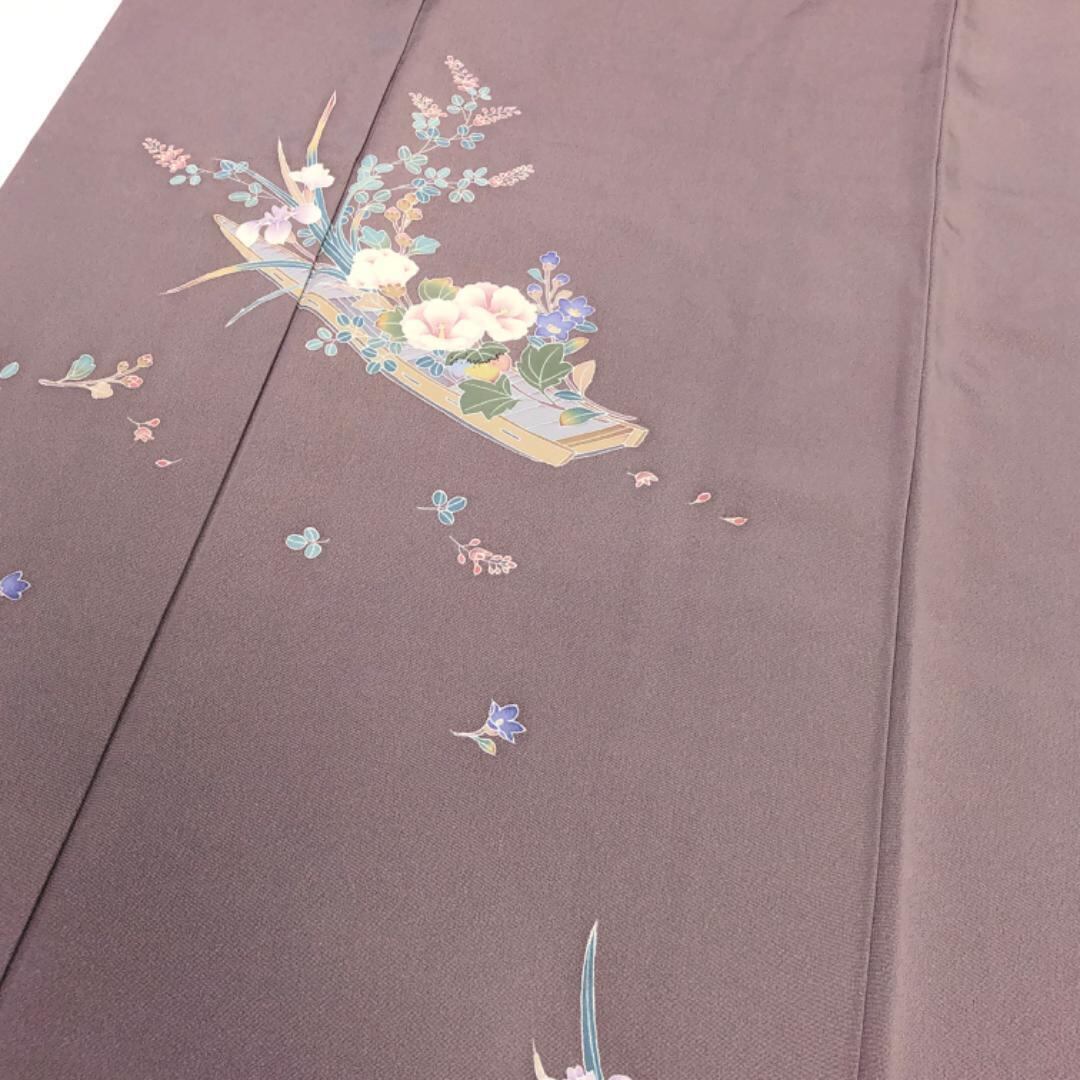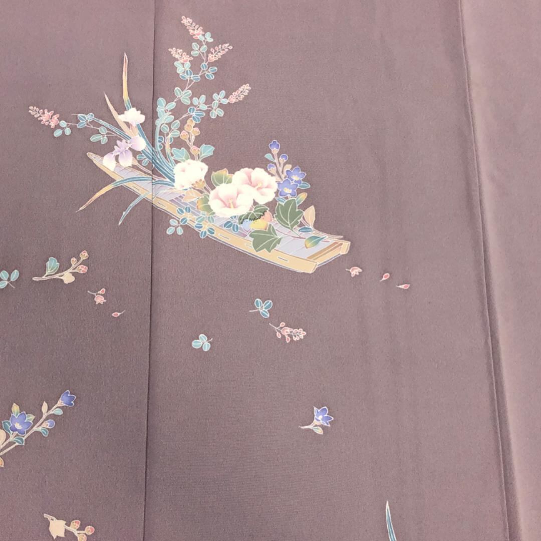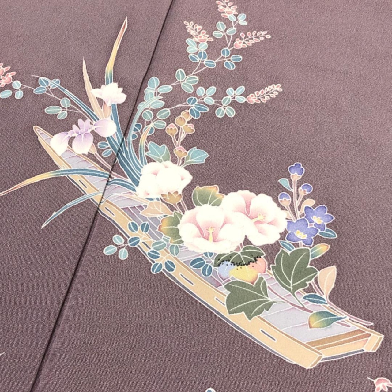 桜鼠色の落ち着きのお色味に船に花柄模様がデザインされた素敵な柄裄のお品でございます。