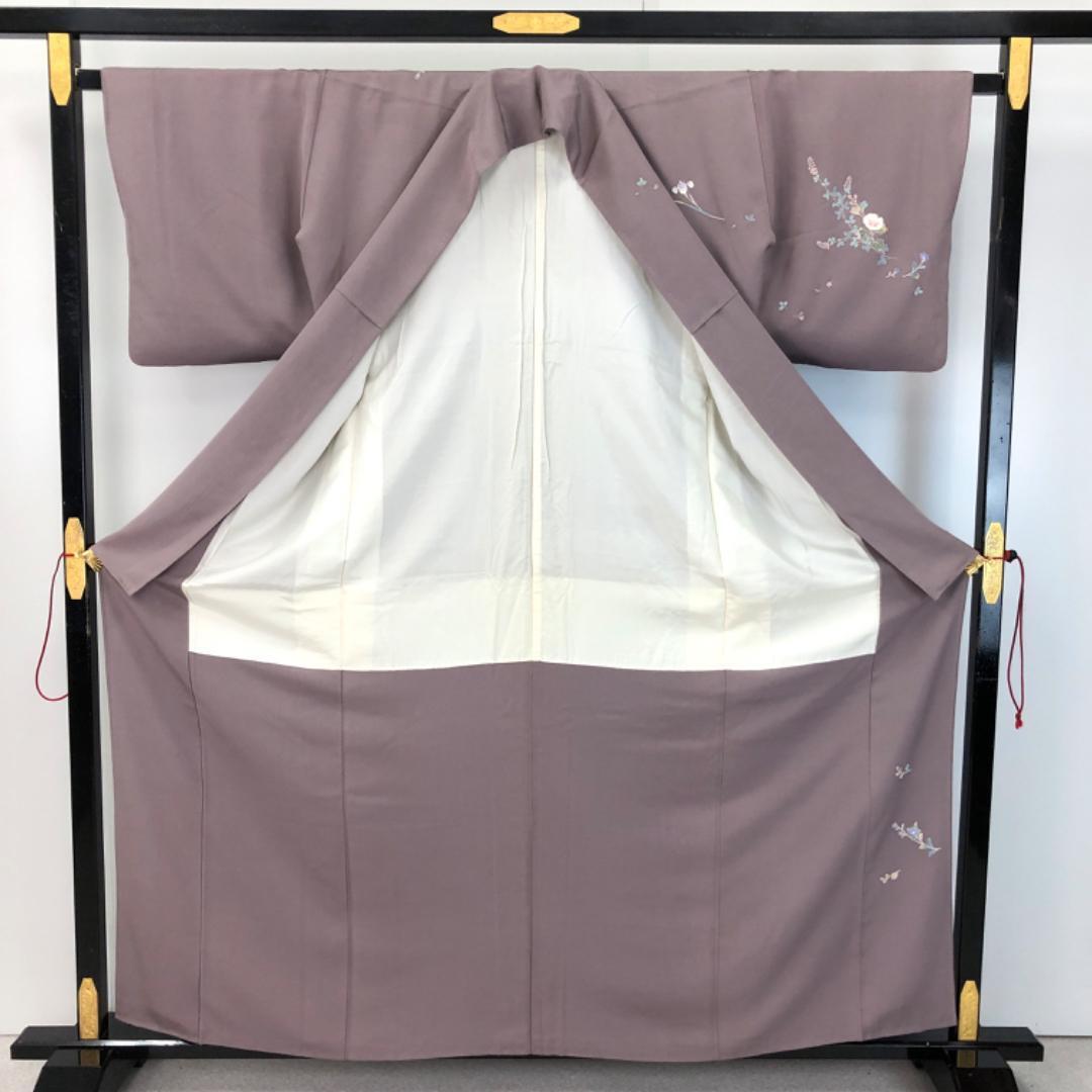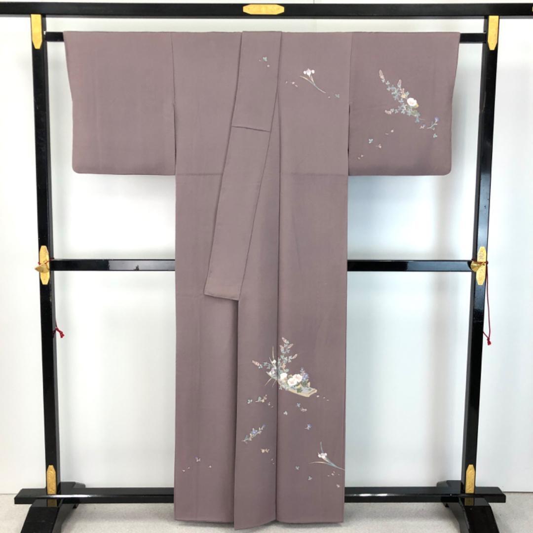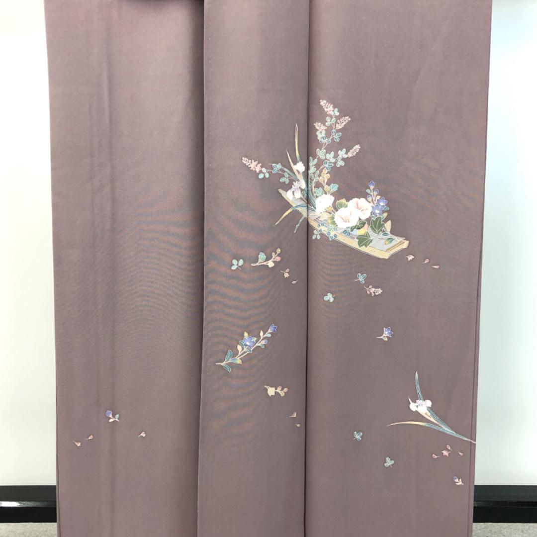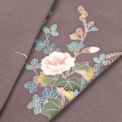 桜鼠色の落ち着きのお色味に船に花柄模様がデザインされた素敵な柄裄のお品でございます。