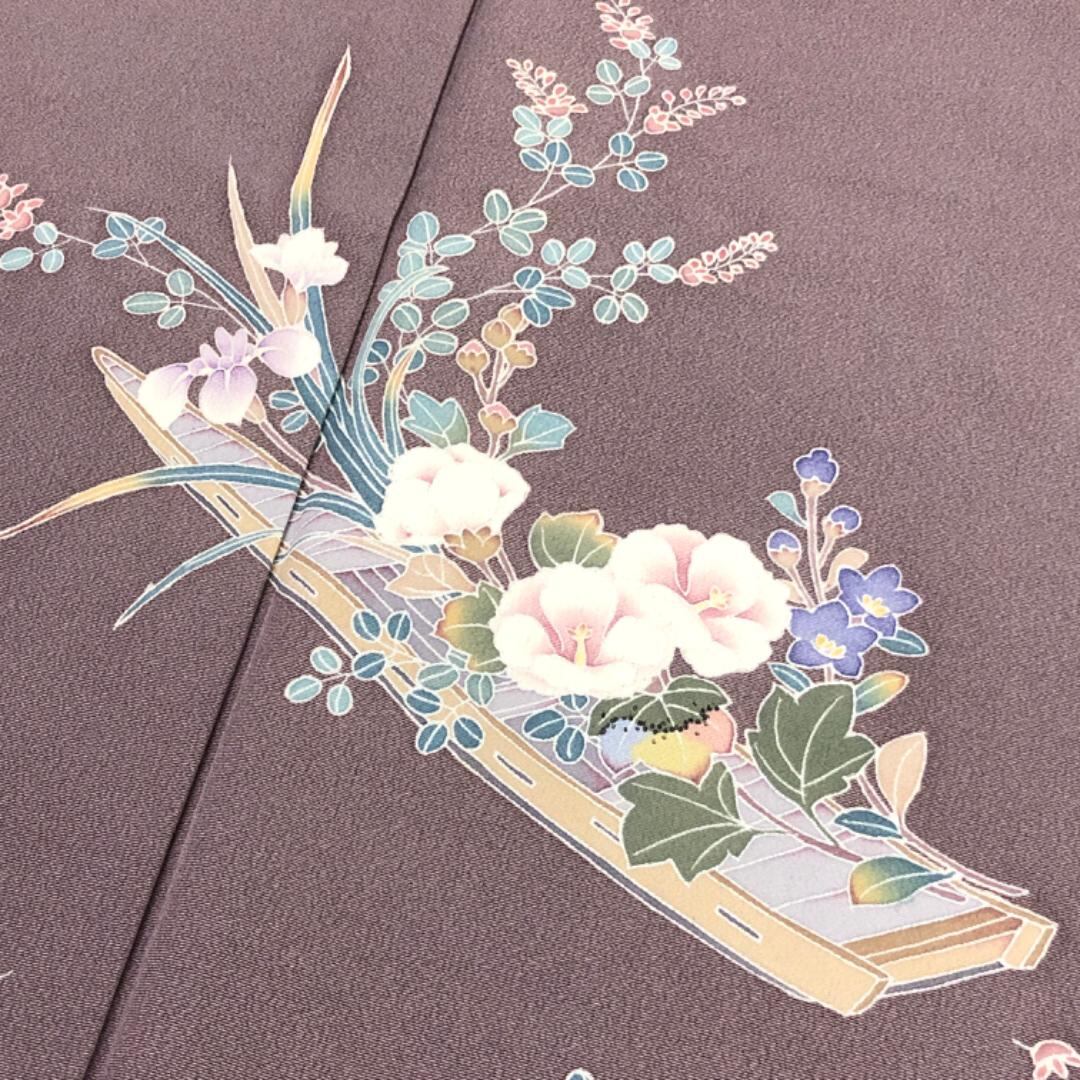付下げ 作家物 船に花柄模様 桜鼠色 K-5368 着物 きもの kimono 和服 和装 中古 リサイクル着物 【送料無料】