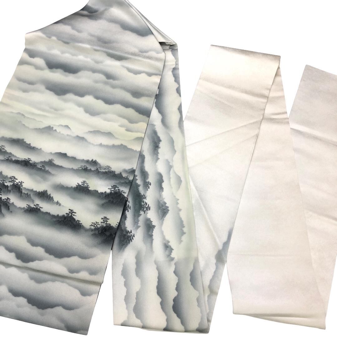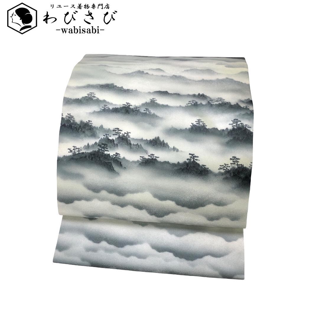 名古屋帯 山々の風景模様 遠山に松 銀白色 ガード加工 O-5545 着物 きもの kimono 和服 和装 中古 リサイクル着物 【送料無料】